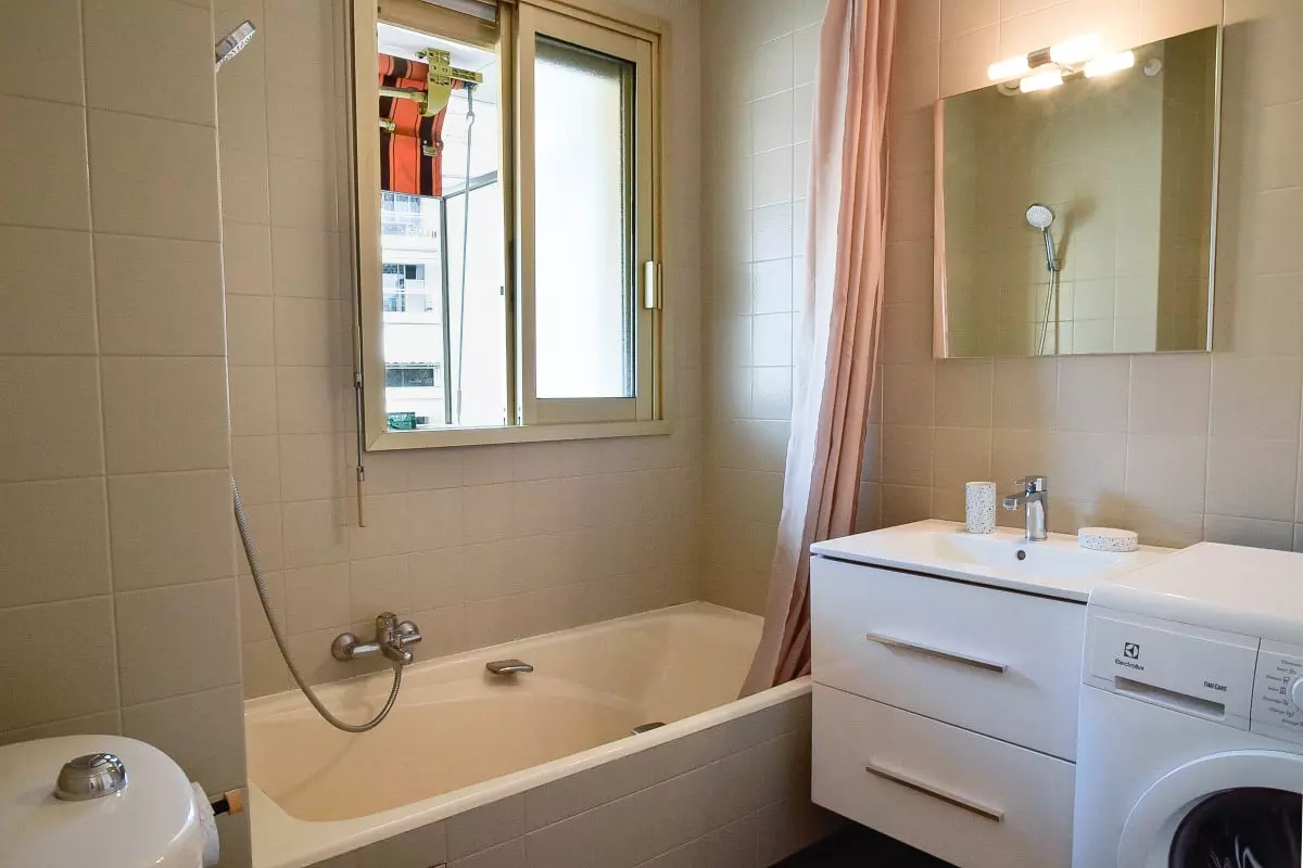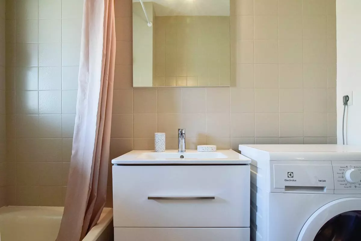 - Salle de bain avec sa vasque, un WC ainsi qu’une machine à laver.