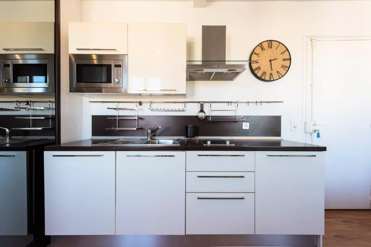 - La cuisine ouverte est entièrement équipée (sauf four) avec tout le nécessaire pour préparer vos repas