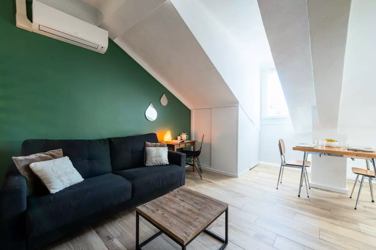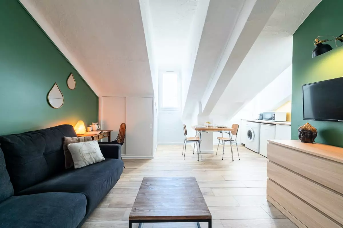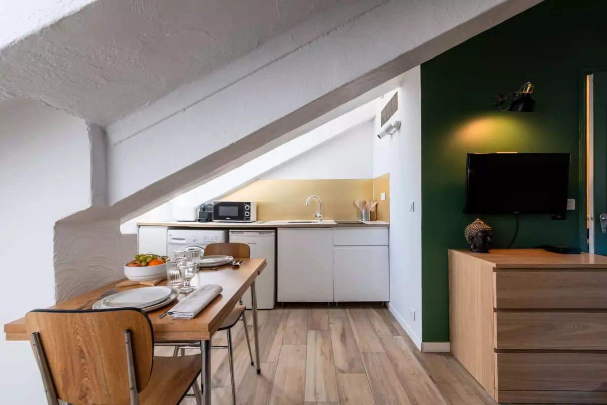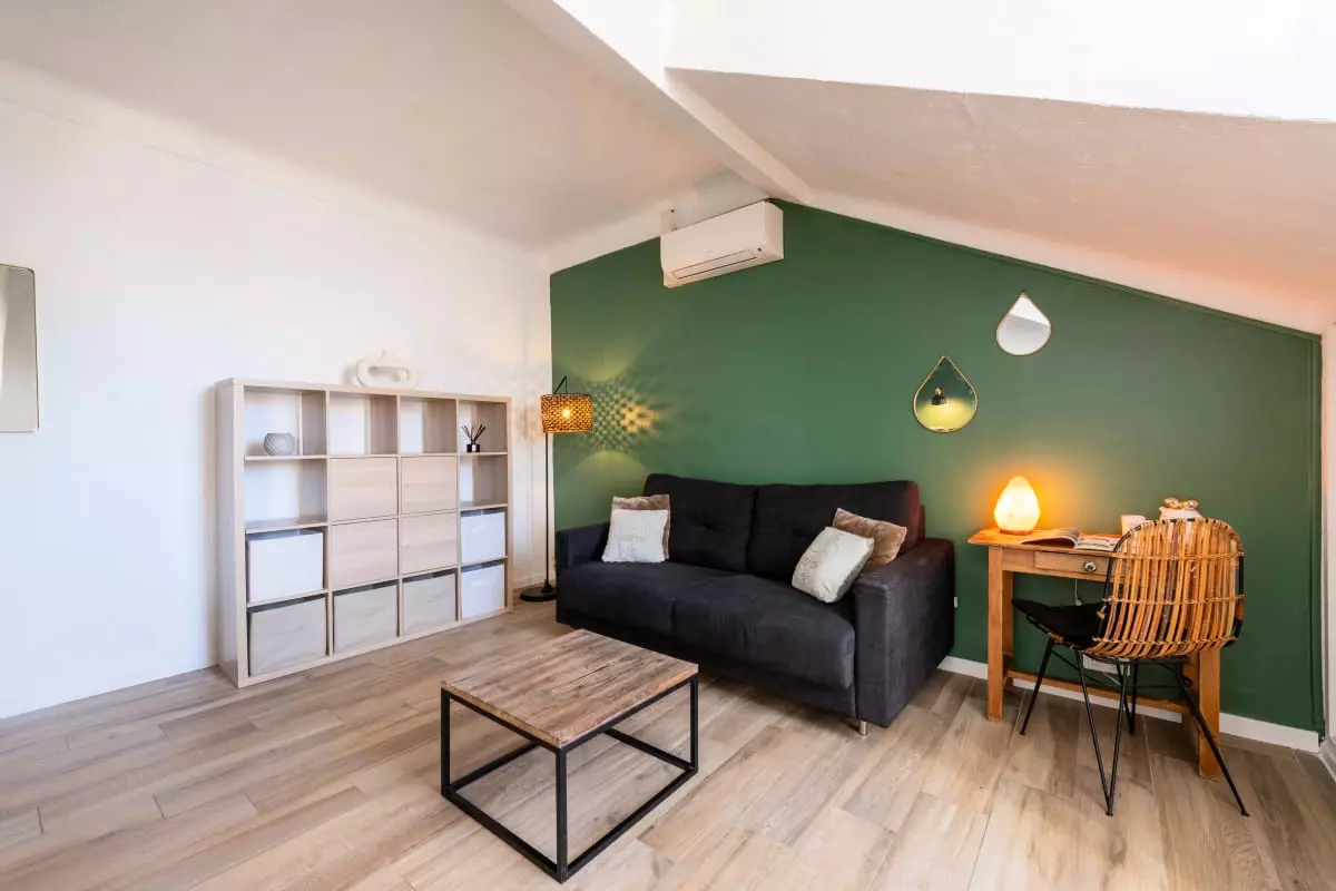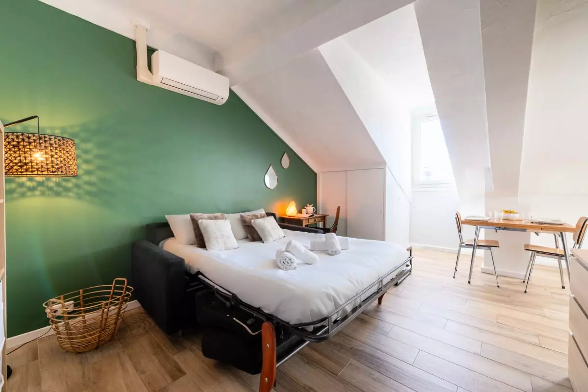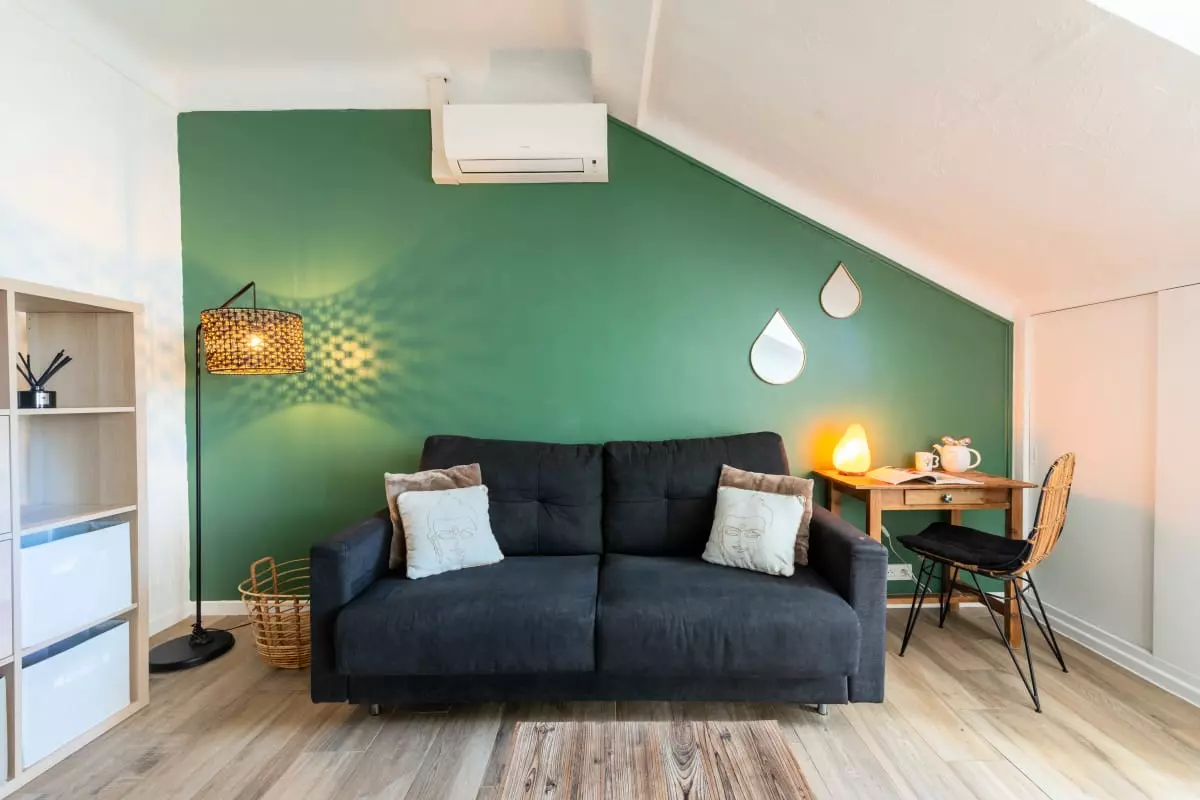 La pièce principale, climatisée et mansardée, dispose d’un canapé-lit (140x200 cm), d’un coin salon avec télévision connectée et d’un espace repas. L’ensemble profite d’une atmosphère chaleureuse.