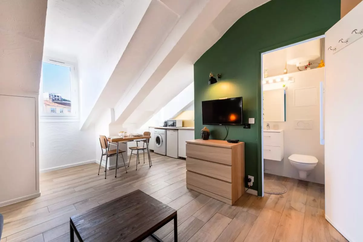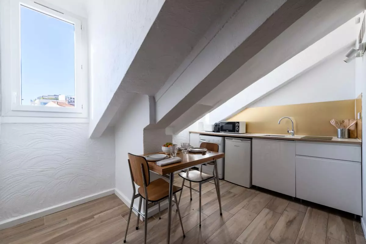 Studio au dernier étage d’un immeuble ancien sur le boulevard Carnot. Idéal pour profiter de Cannes, entre commerces, marchés et animation locale, tout en bénéficiant d’un espace fonctionnel et confortable pour un séjour pratique.