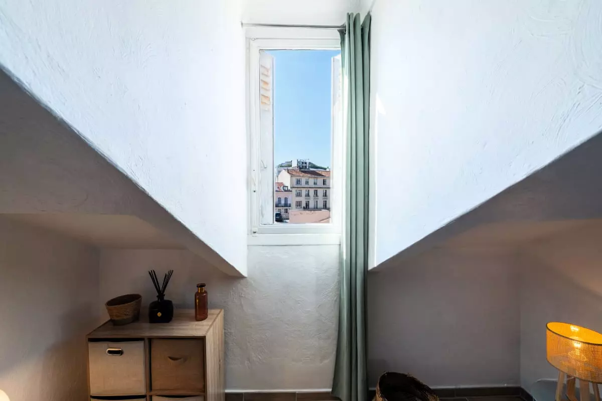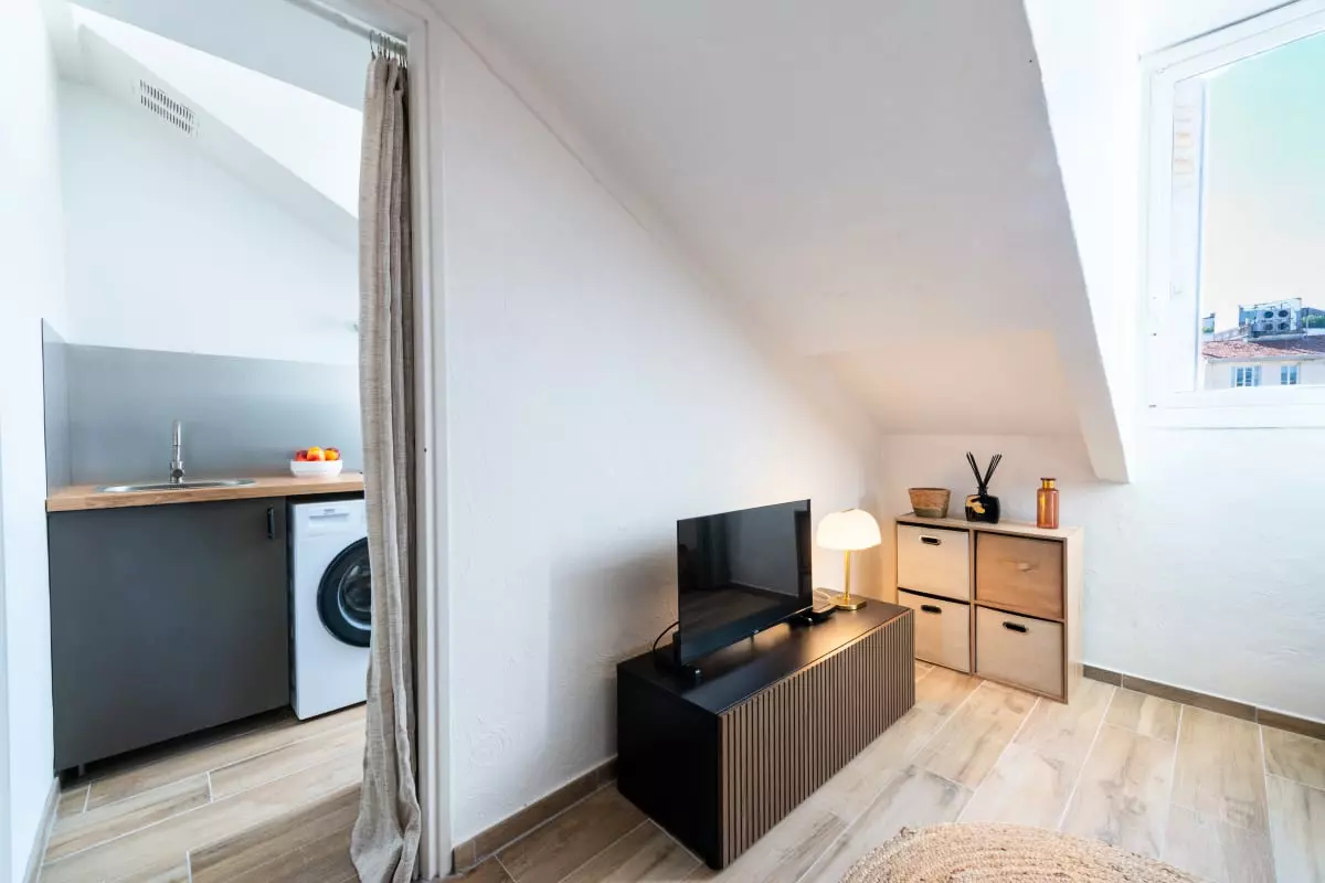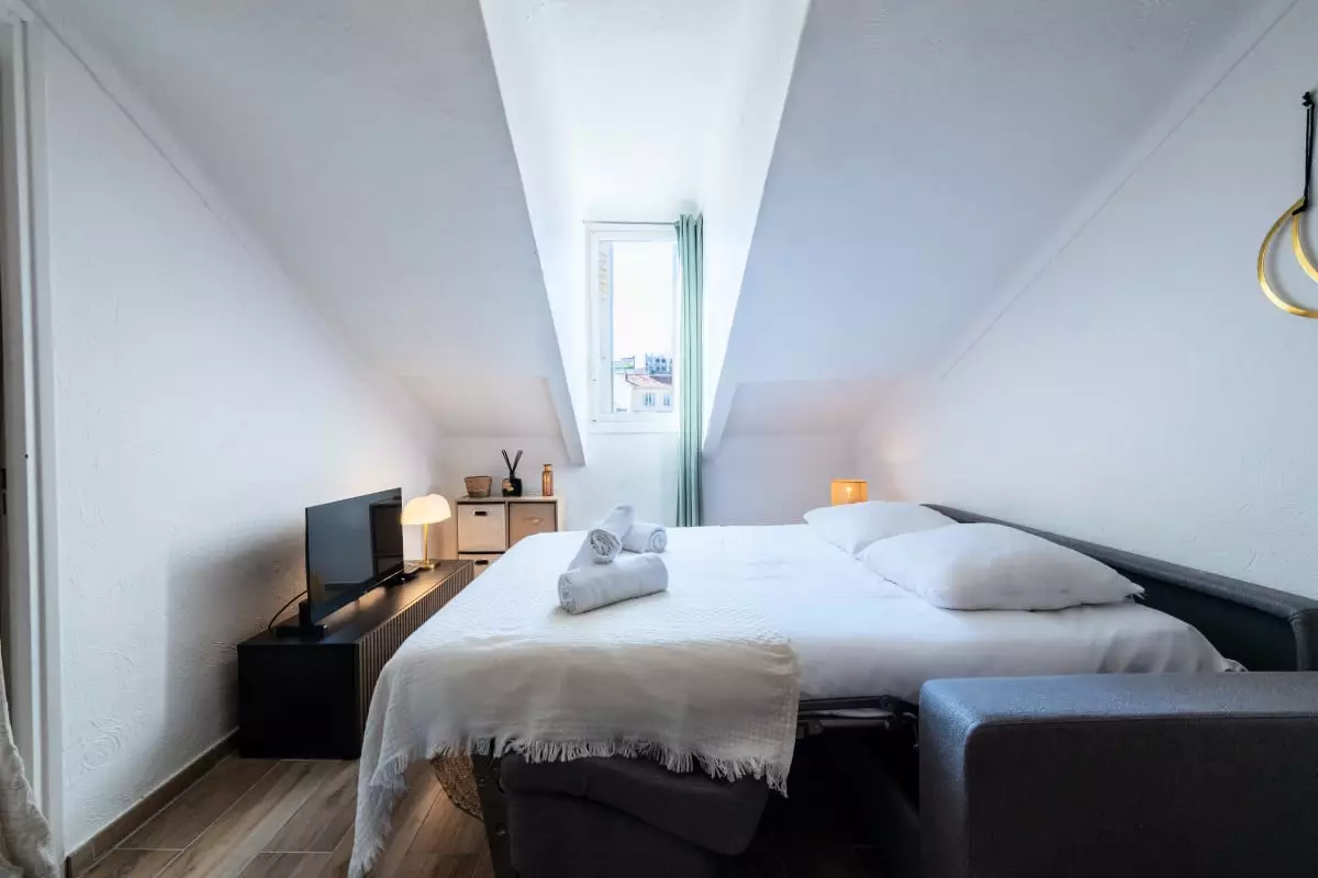 La pièce principale, mansardée et climatisée, comprend un canapé-lit (140x200cm), qui forme un espace détente avec TV connectée et la fibre, ainsi qu’une fenêtre donnant sur les toits de Cannes.