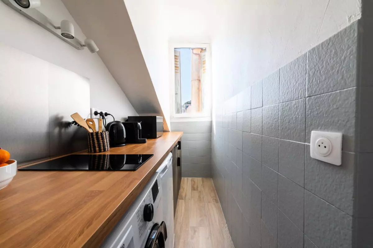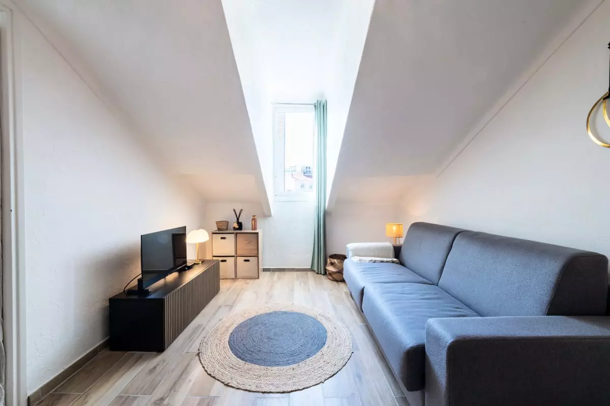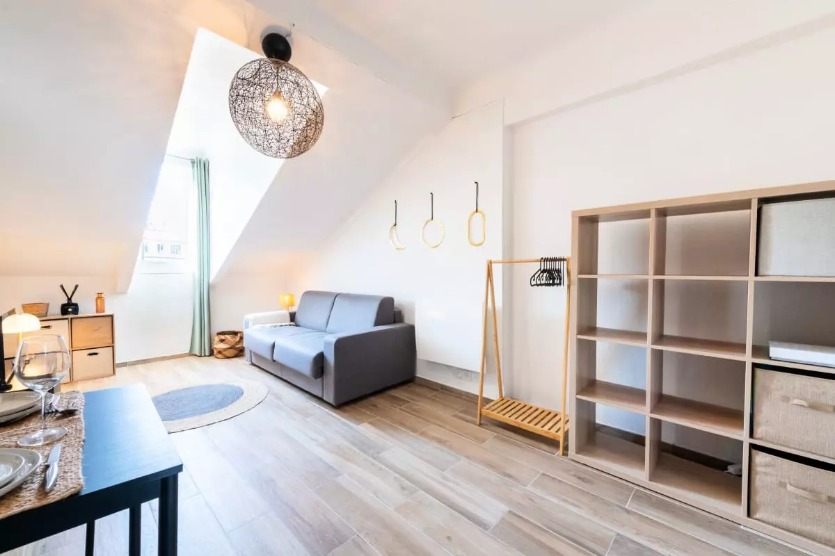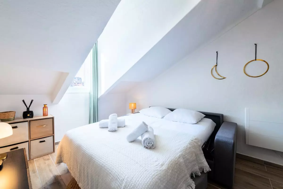La pièce principale, mansardée et climatisée, comprend un canapé-lit (140x200cm), qui forme un espace détente avec TV connectée et la fibre, ainsi qu’une fenêtre donnant sur les toits de Cannes.