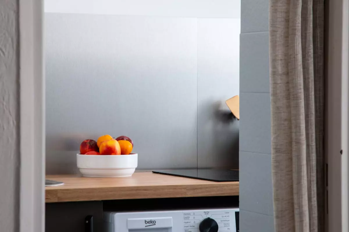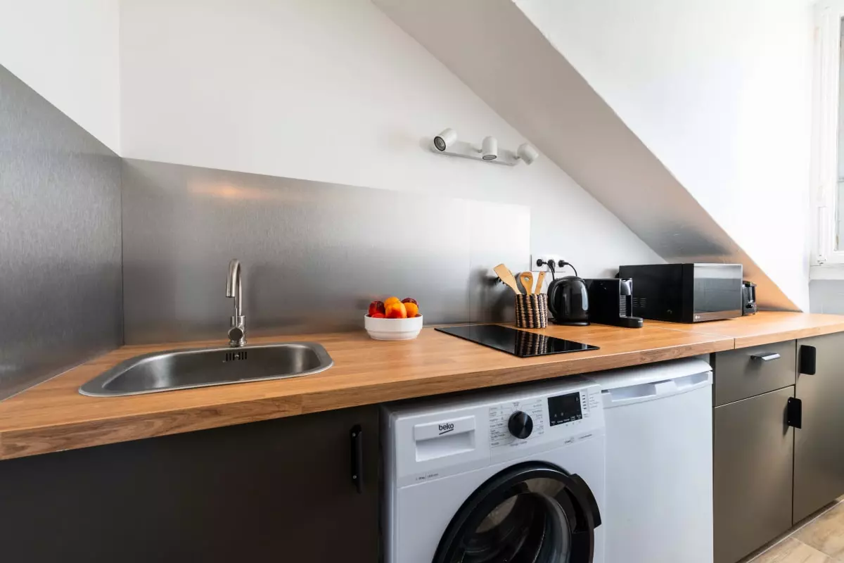La cuisine indépendante est équipée pour les besoins du quotidien (plaques de cuisson, micro-ondes, réfrigérateur, vaisselle et ustensiles de cuisine) et dispose d’une ouverture sur la pièce de vie.