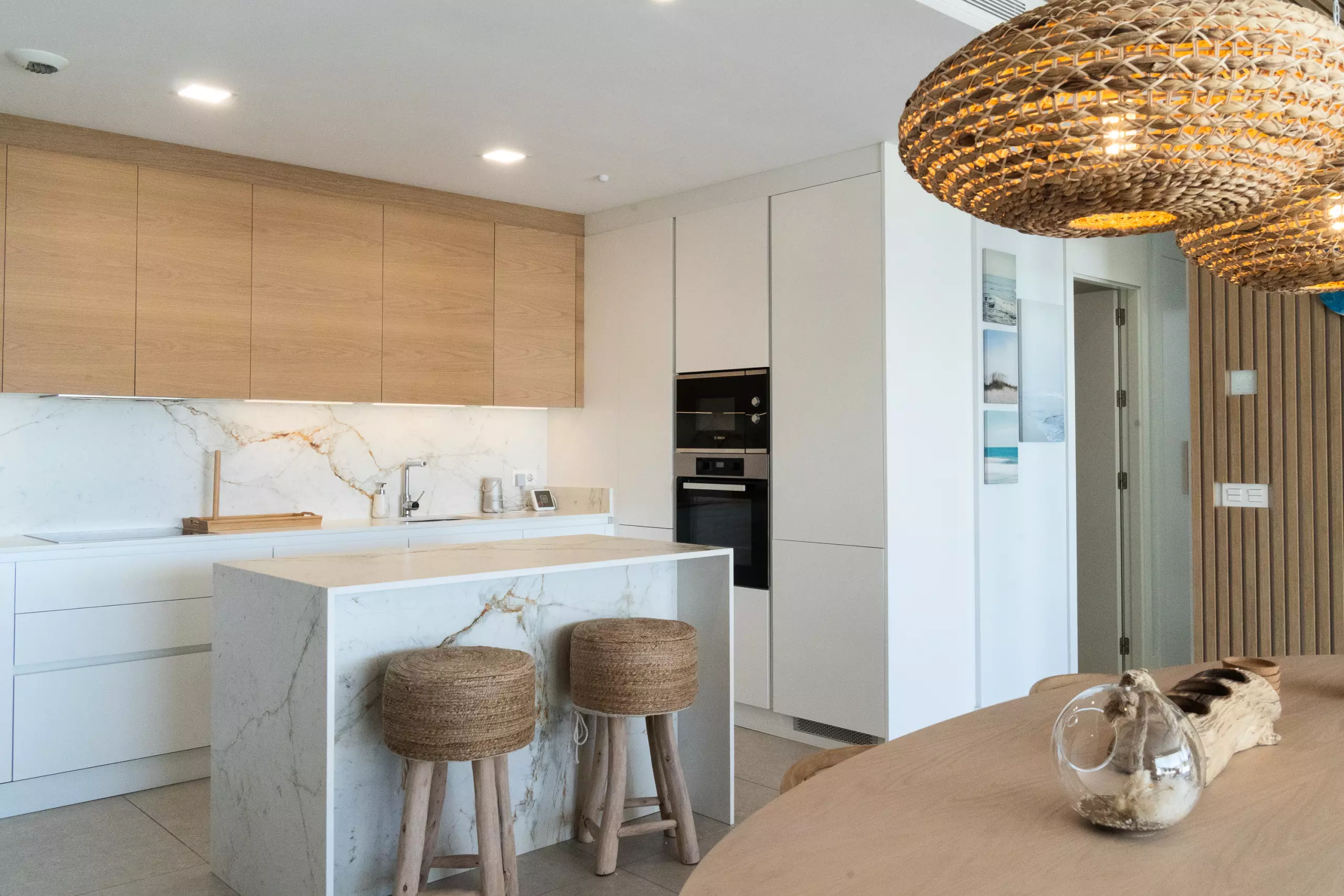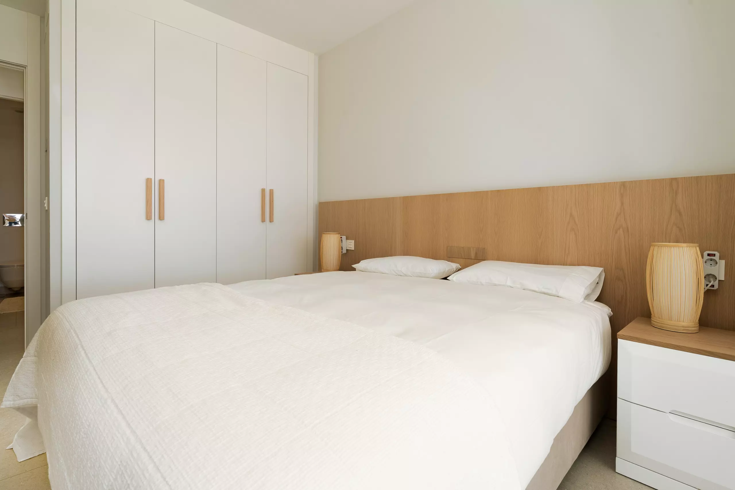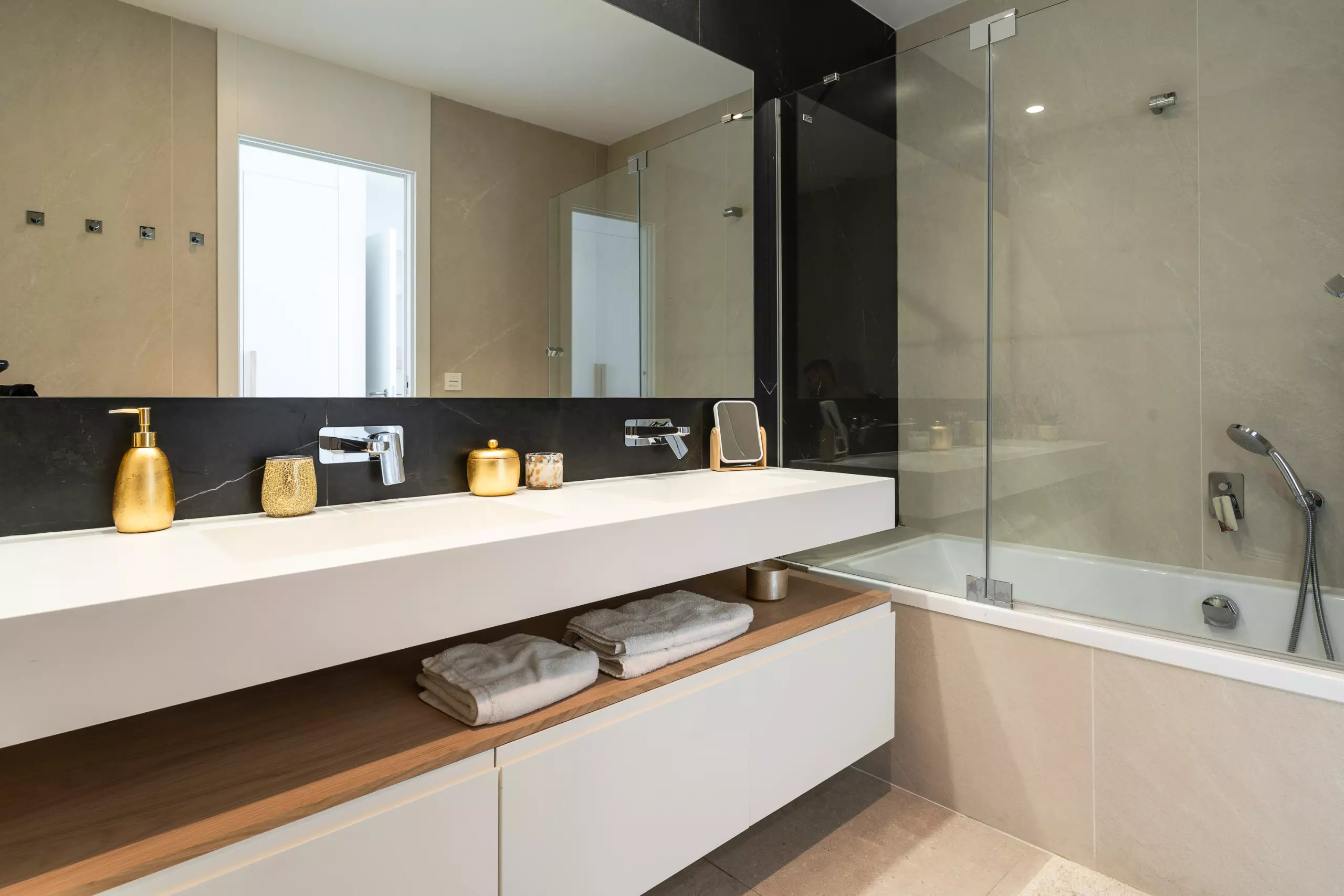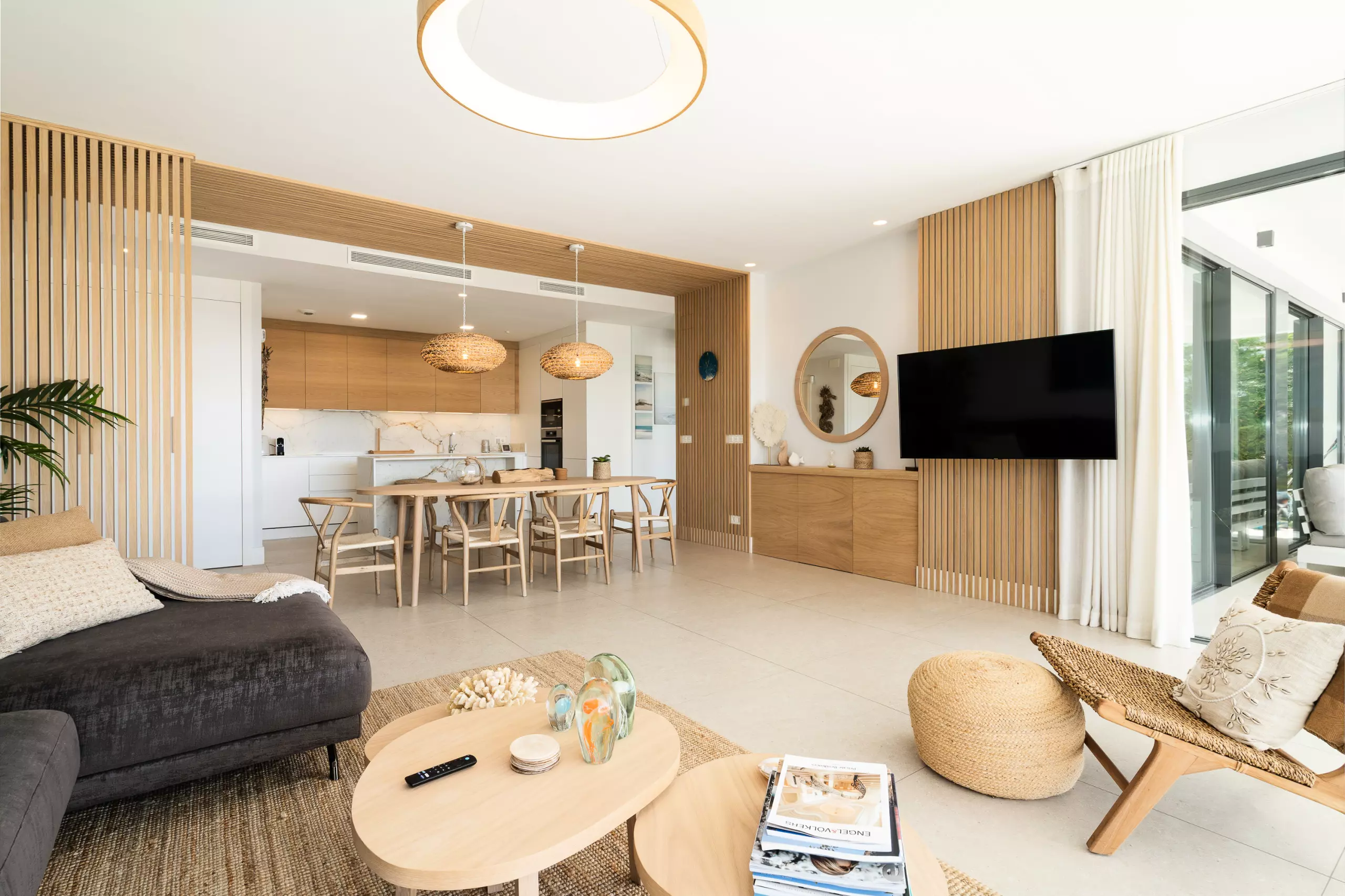 L'appartement dispose de deux chambres doubles spacieuses, dont une suite principale avec une salle de bain privative. Une deuxième salle de bain moderne garantit le confort et l'intimité de tous les invités. La cuisine et le séjour ouverts sont lumineux et accueillants, conçus avec des meubles contemporains et une architecture moderne épurée qui s'étend harmonieusement jusqu'au jardin privatif.