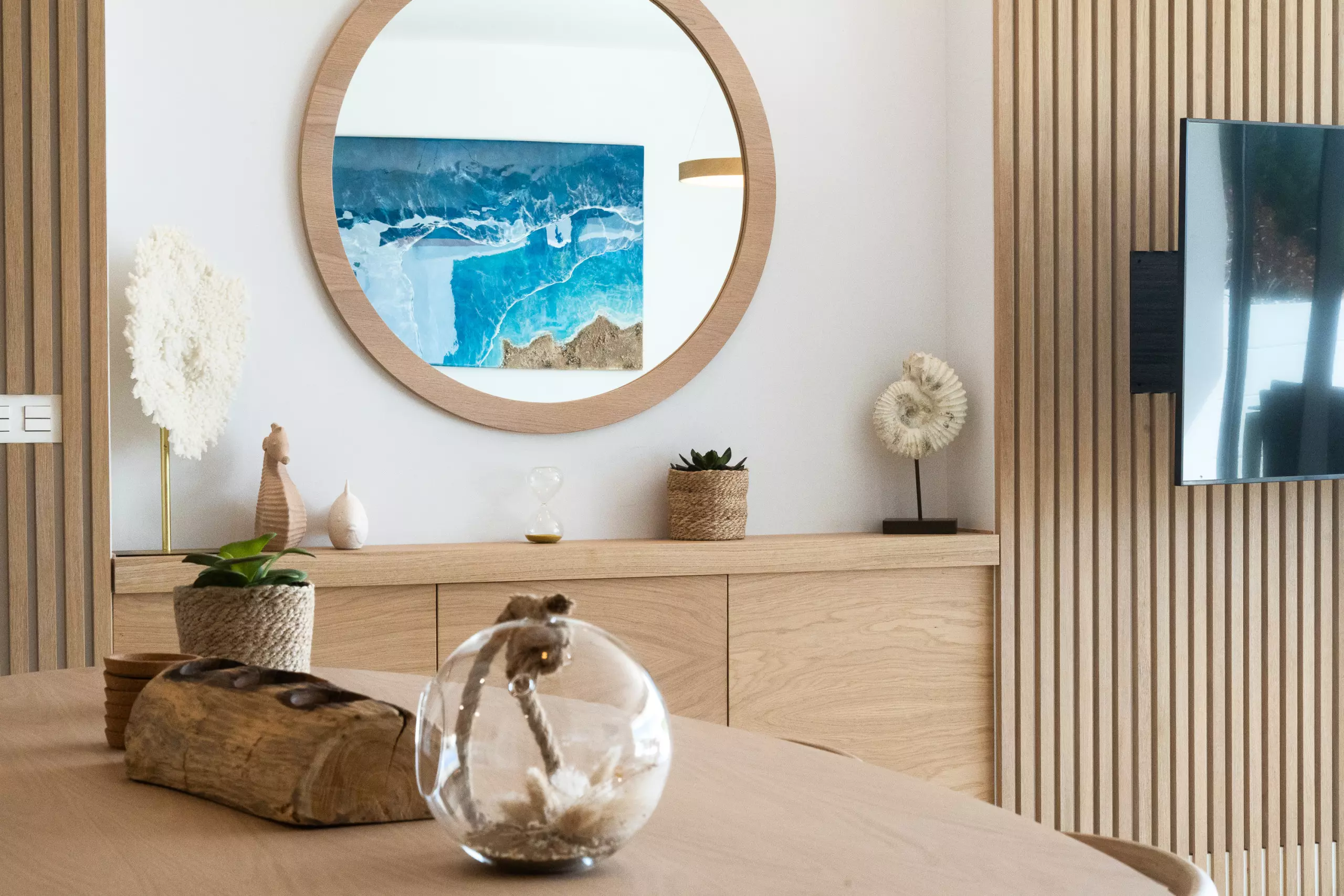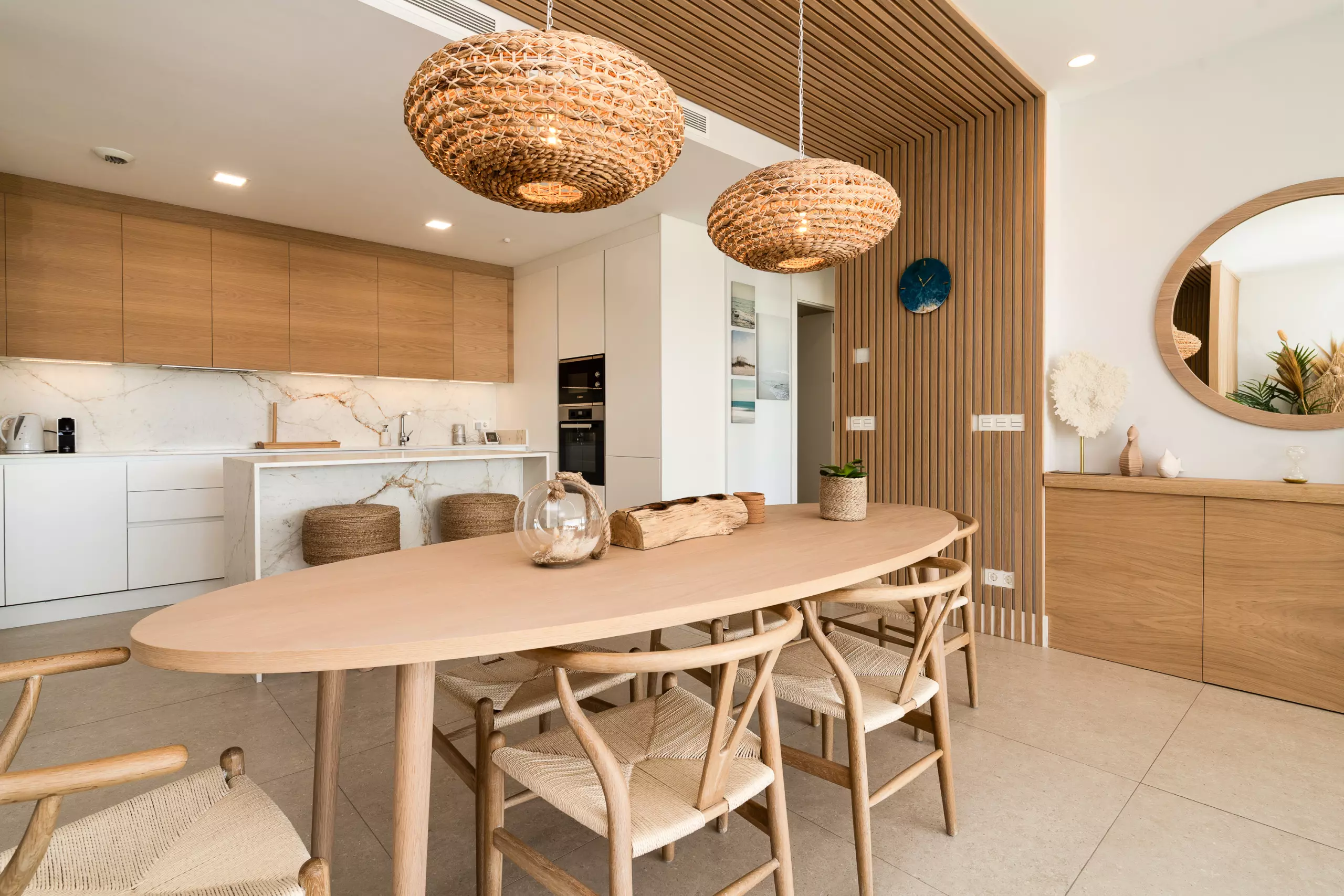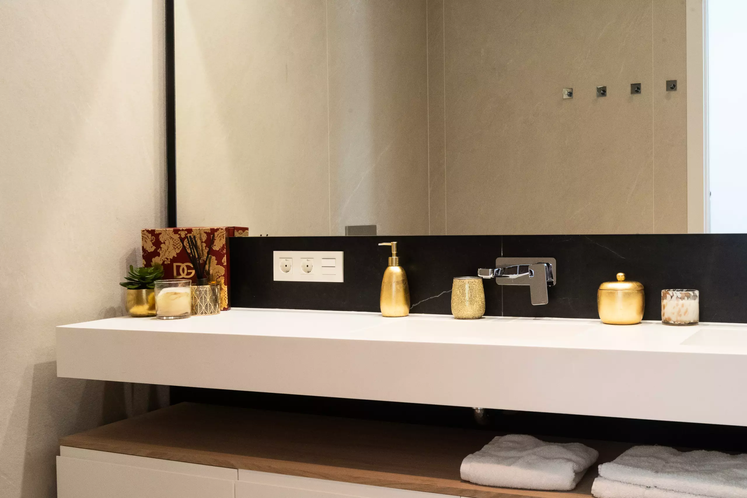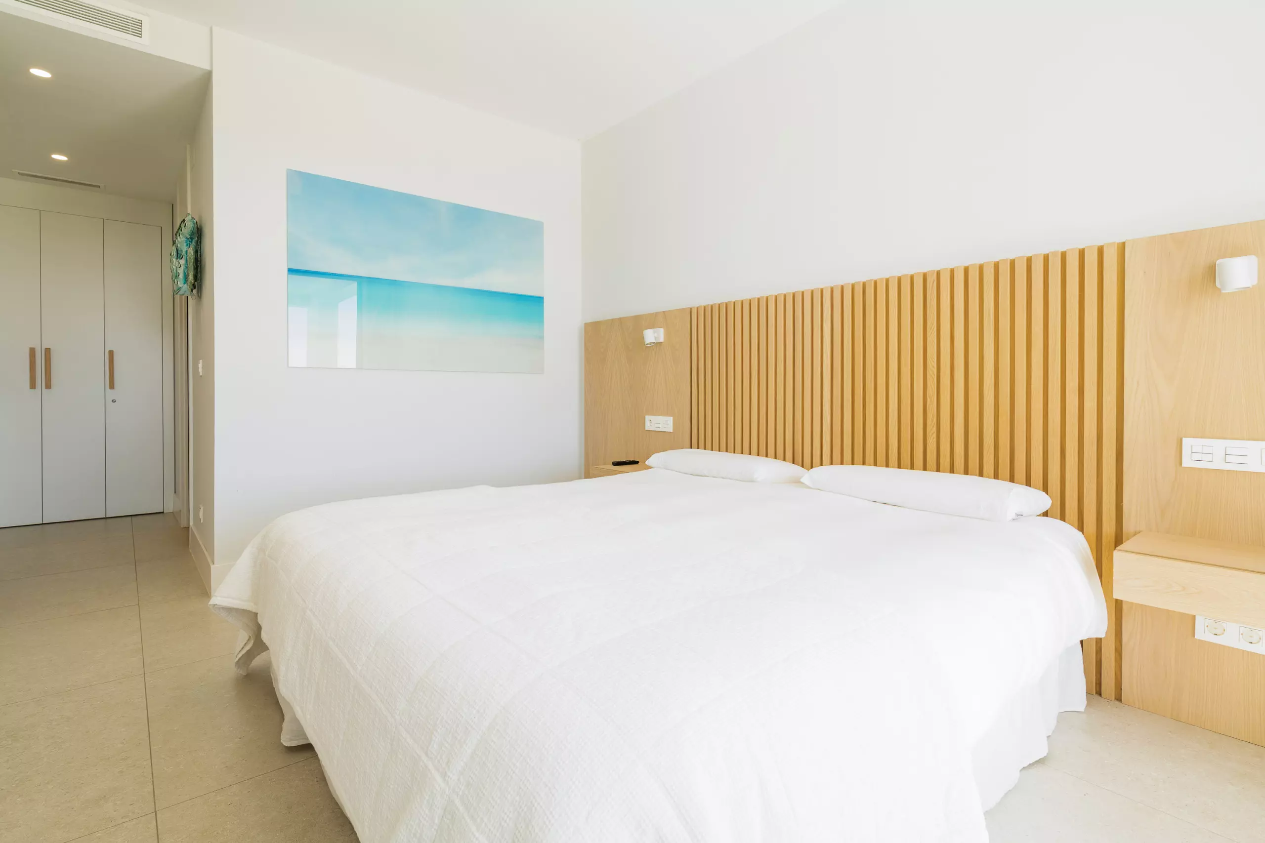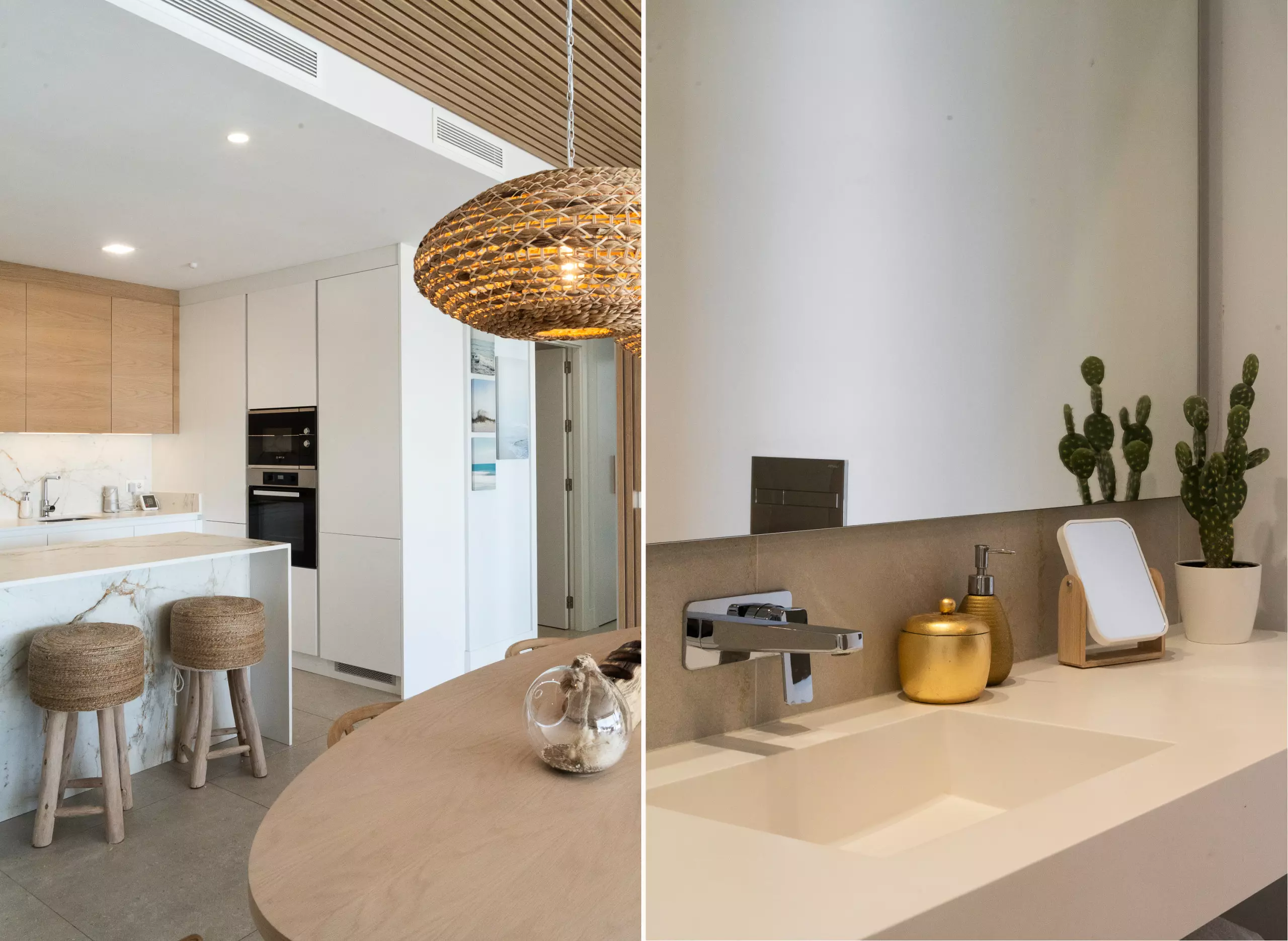 L'appartement dispose de deux chambres doubles spacieuses, dont une suite principale avec une salle de bain privative. Une deuxième salle de bain moderne garantit le confort et l'intimité de tous les invités. La cuisine et le séjour ouverts sont lumineux et accueillants, conçus avec des meubles contemporains et une architecture moderne épurée qui s'étend harmonieusement jusqu'au jardin privatif.