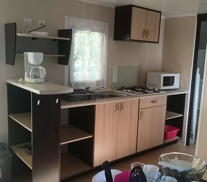 MOBILE HOME OPHEA 3 personnes , avec douche et toilettes , 2 chambres , 1 lit de 140/190 et dans la deuxième chambre 1 lit 70 /190, une terrasse couverte et salon de jardin. une cuisine avec son frigo , son évier et sa plaque de cuisson