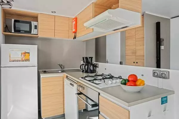Séjour / coin cuisine : Banquette, Bouilloire, Cafetière électrique (filtre), Cuisine équipée, Evier, Lave-vaisselle, Micro-ondes, Plaque de cuisson 4 feux gaz, Réfrigérateur avec freezer, Table et chaises