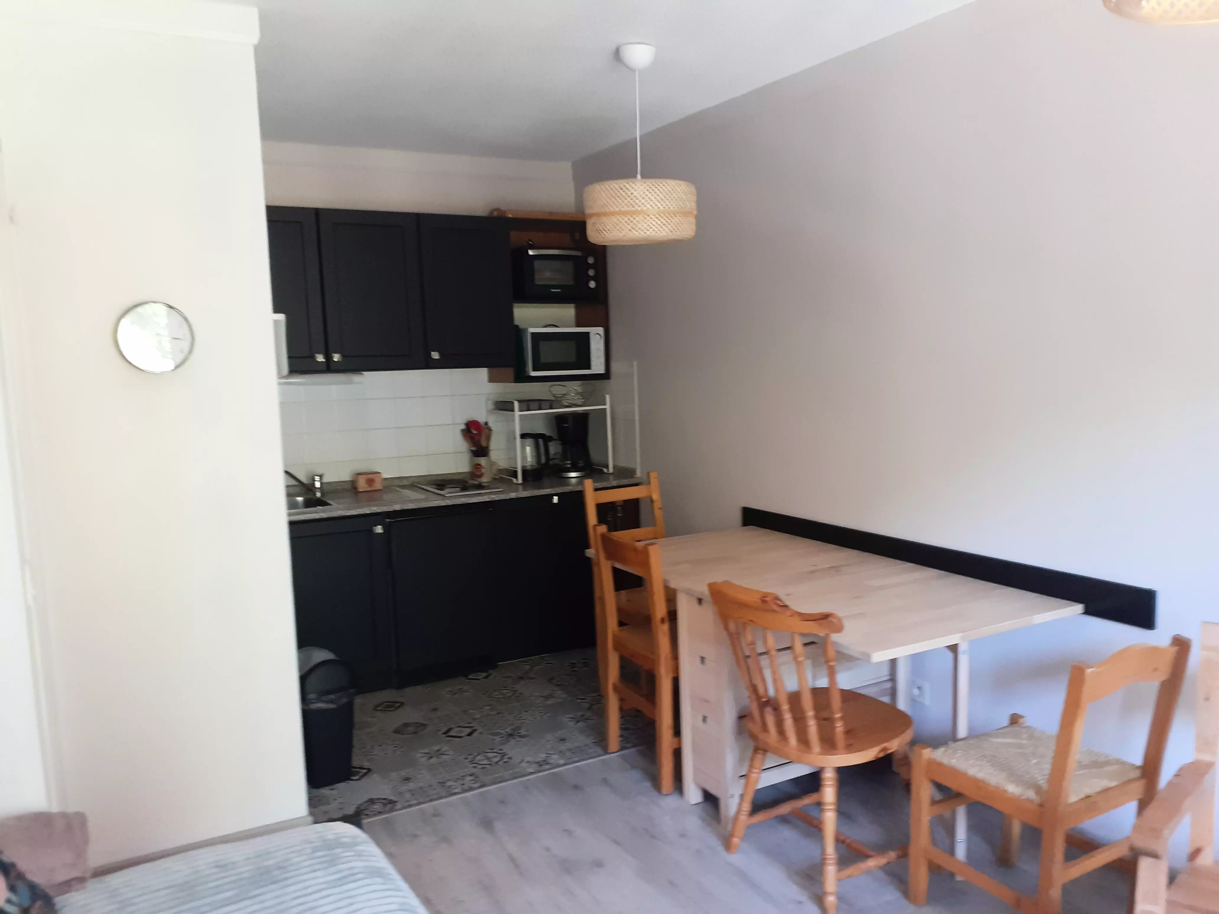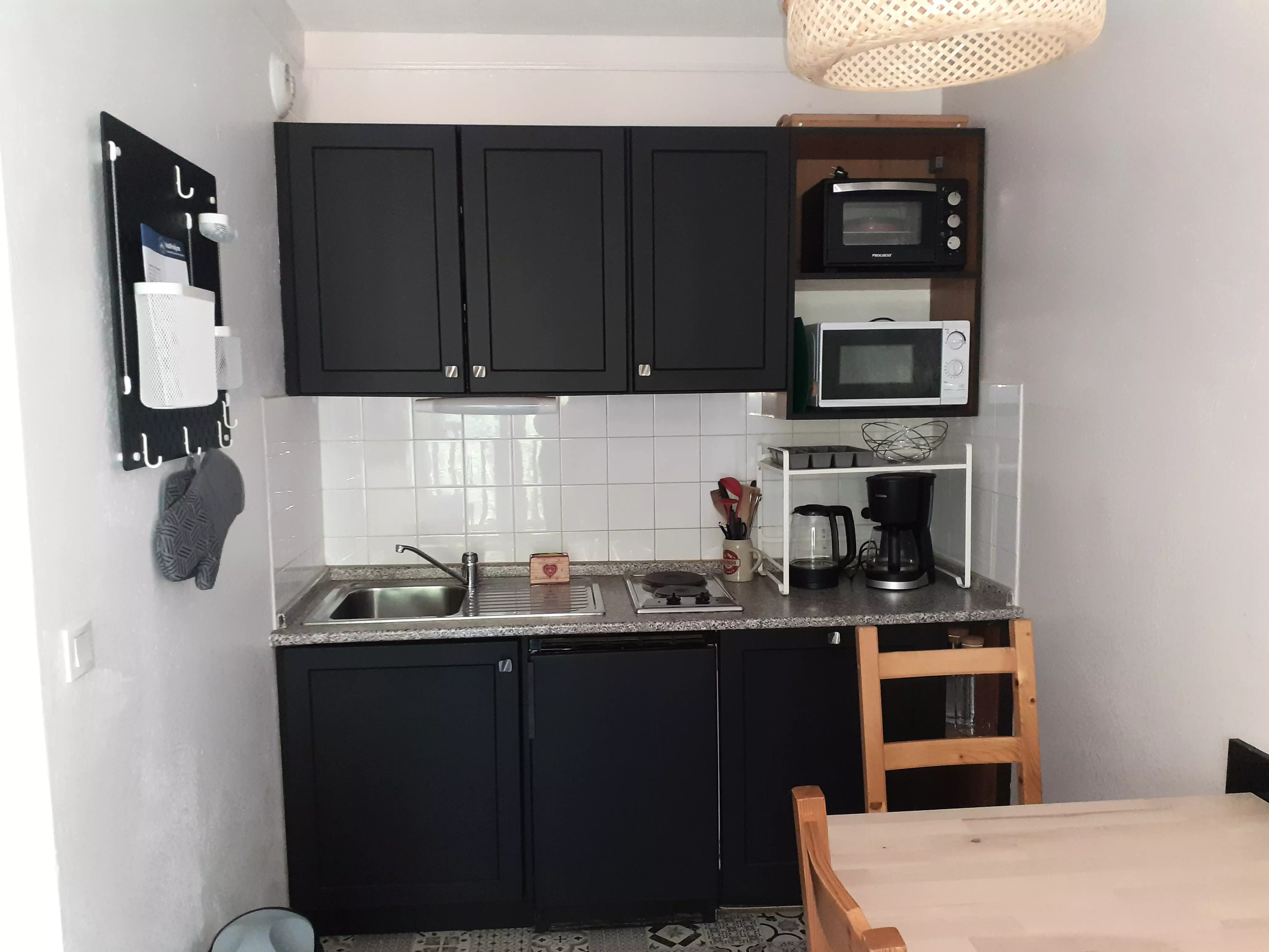 - Coin cuisine équipé : plaques électrique 2 feux, réfrigérateur, lave vaisselle, micro-ondes, mini-four, cafetière à filtre, bouilloire, service à raclette