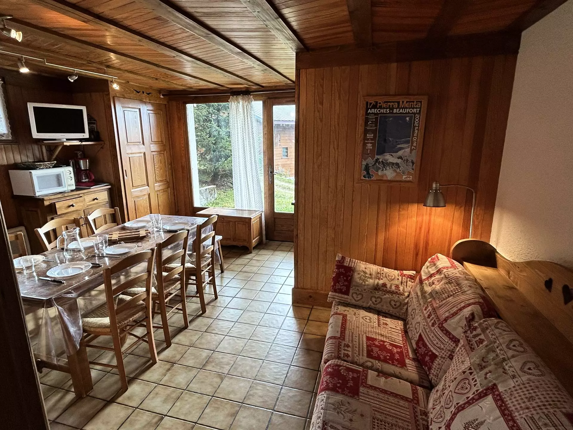 Pour accéder à l'appartement, il faut descendre 25m via un chemin de neige. Situé au rez de chaussée, l'appartement plein sud, bénéficie d'une vue dégagé sur le Massif du Beaufortain et le Mont Bisanne.