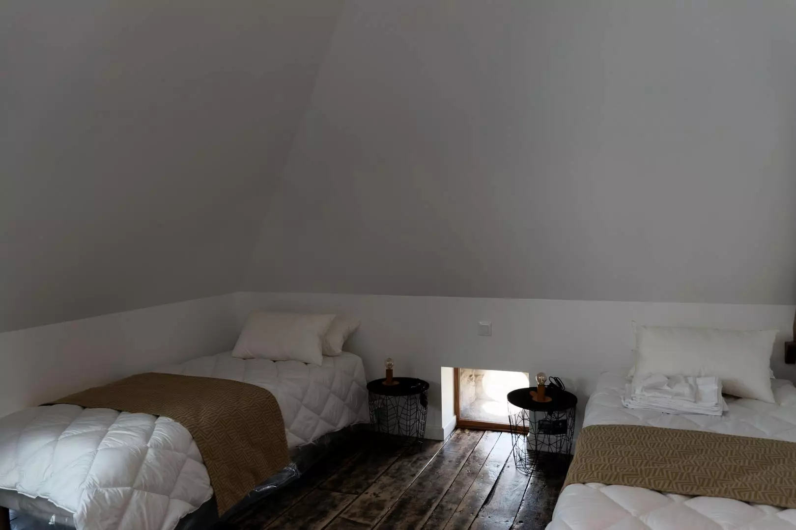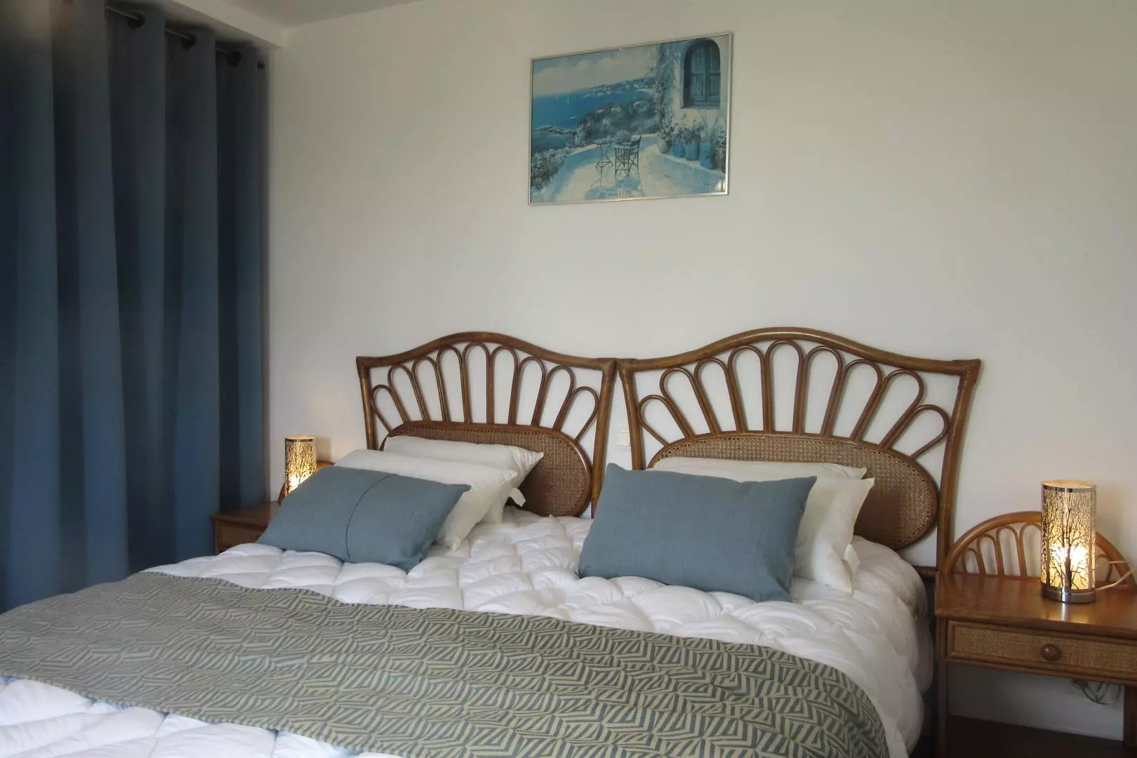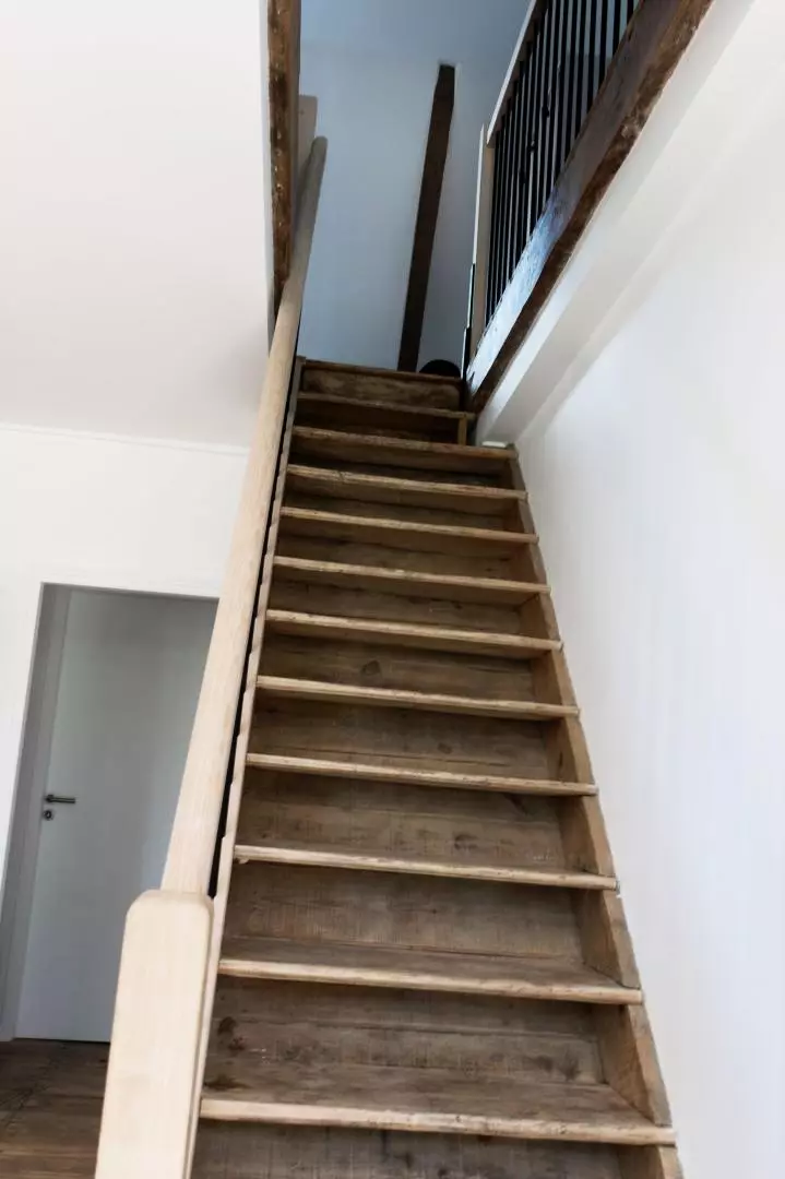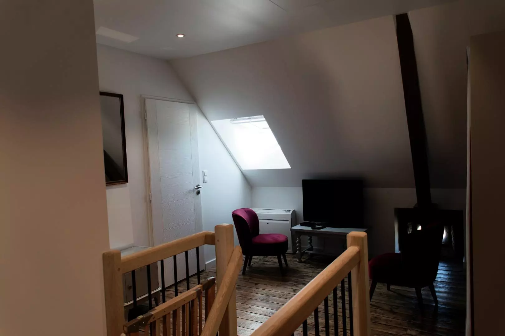 A l'étage un coin salon avec téléviseur dessert 1 chambre lit doubles 140x200, 1 chambre 2 lits 90 cm qui peuvent se jumeler et 1 chambre 3 lits simples 90 cm, dont 2 peuvent être jumelés.