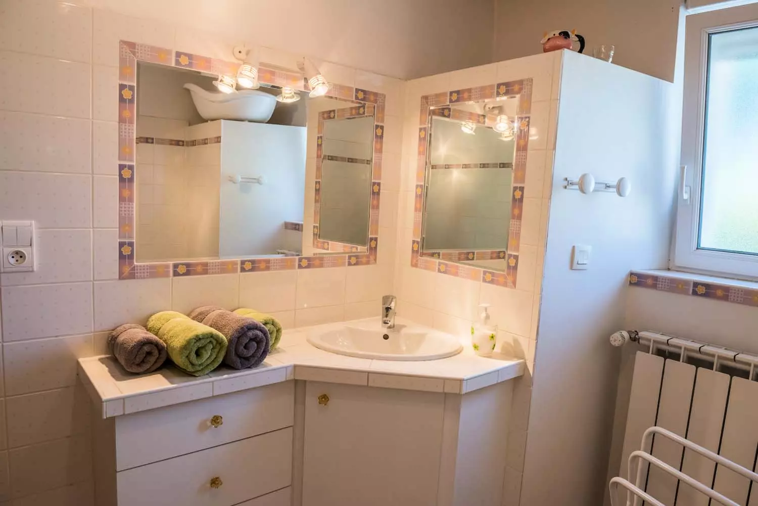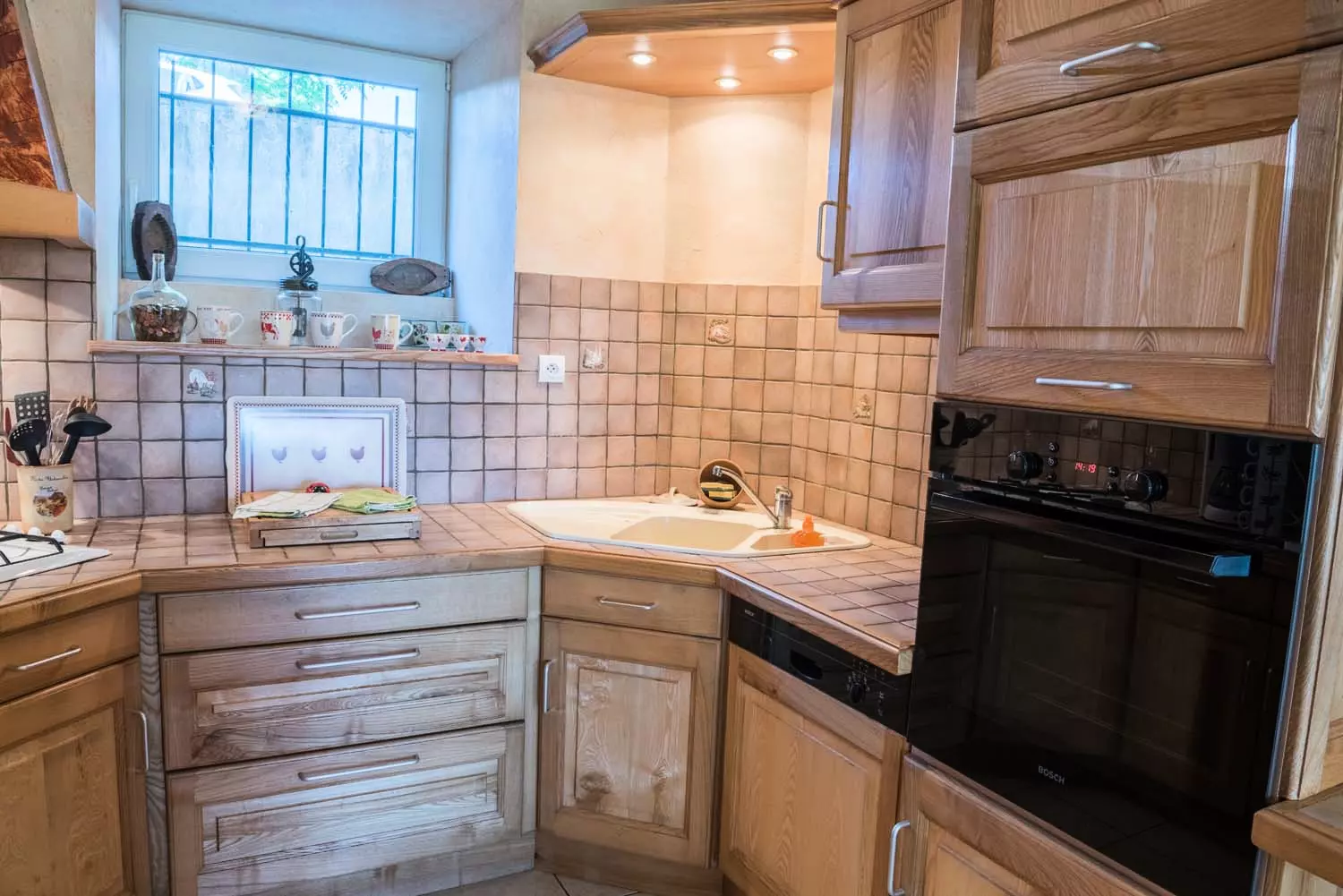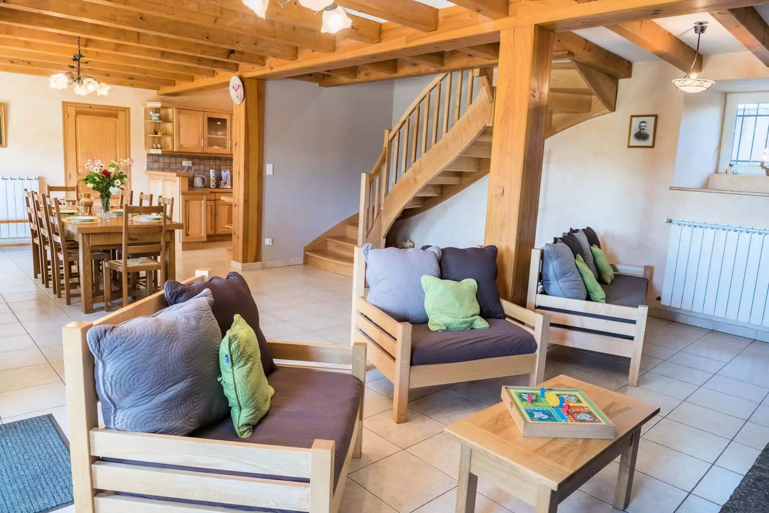 Au rez de chaussée : grande pièce à vivre : cuisine intégrée , salle à manger, cheminée granit avec poêle à bois (gratuit), salon avec télévision tnt, wifi fibre gratuit, coin buanderie avec toilette indépendant.