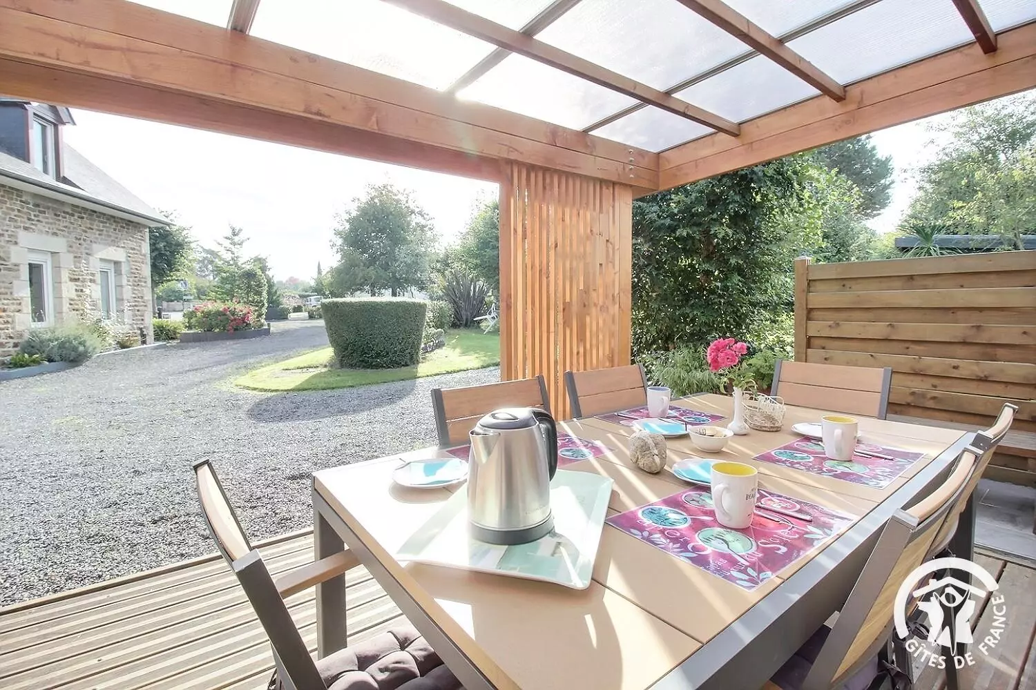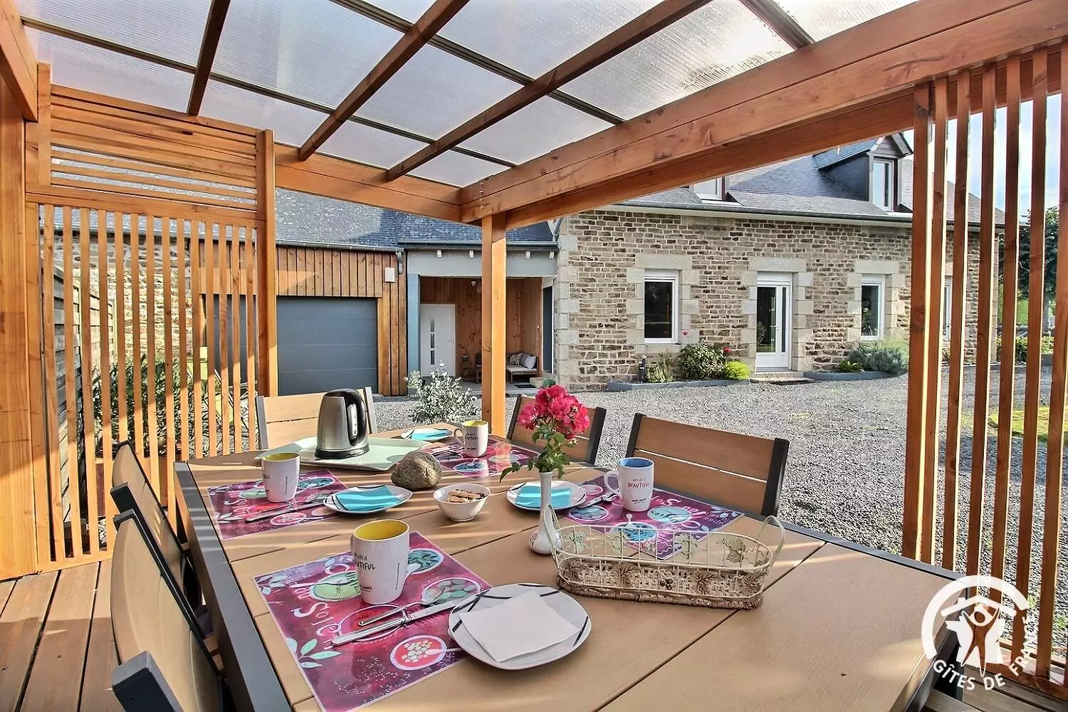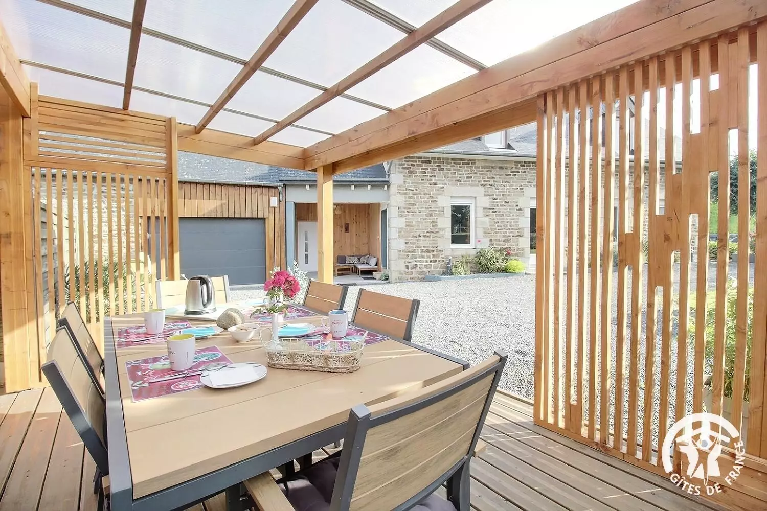 - pergola avec table de jardin sur terrasse en bois