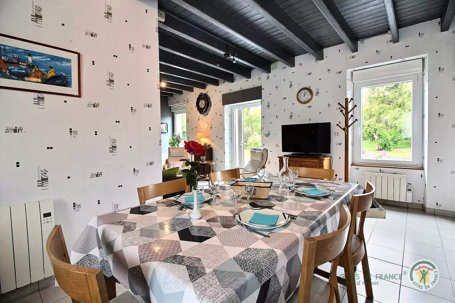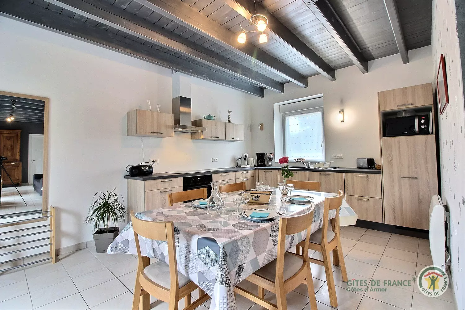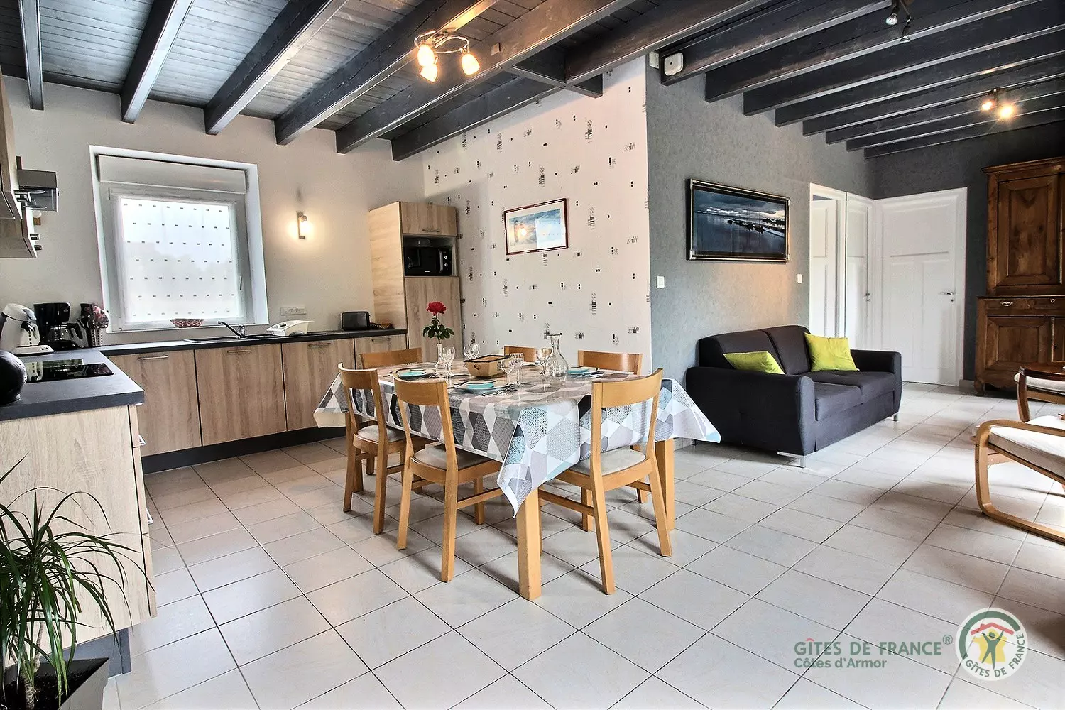 Le plus de ce gîte : deux VTT adultes à disposition et trois vélos enfants de 3 à 8/10 ans et une table de tennis de table. À l'entrée du bourg de Coëtmieux, cette jolie maison en pierre, mitoyenne à un tiers et à proximité de l'habitation des propriétaires, vous accueille confortablement, pour un séjour près de la mer.