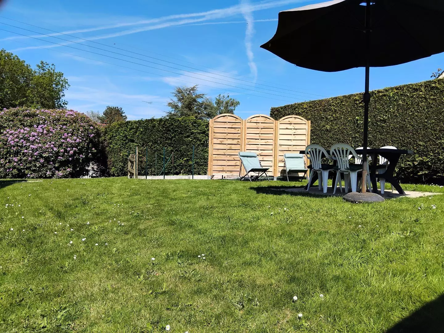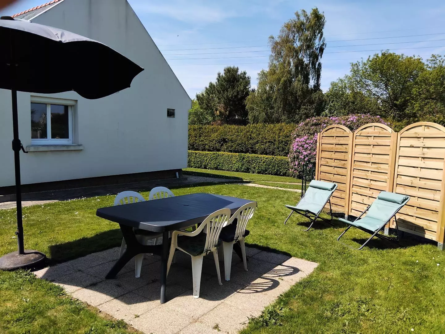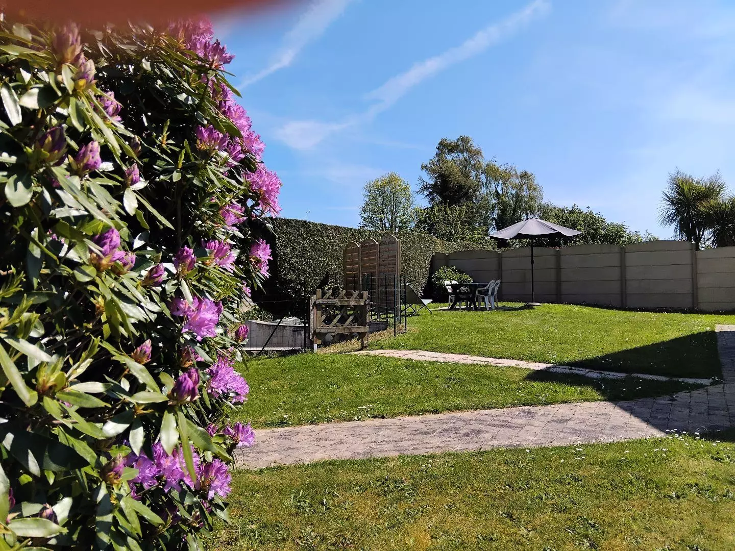 Terrasse, terrain clos de 500 m². Stationnement dans l'allée, devant le portail.