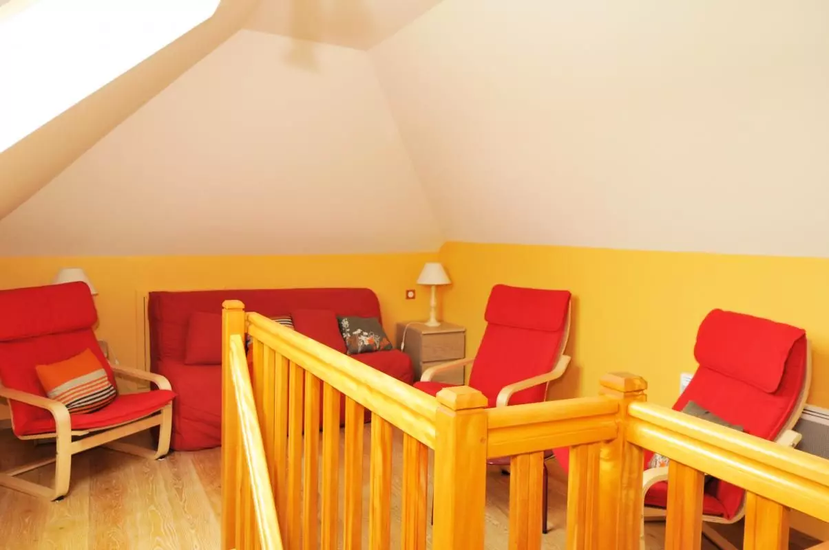 A l’étage : salon avec TV + couchage BZ 160x200. Lit bébé. Grande terrasse plein sud vue sur les vignes.
