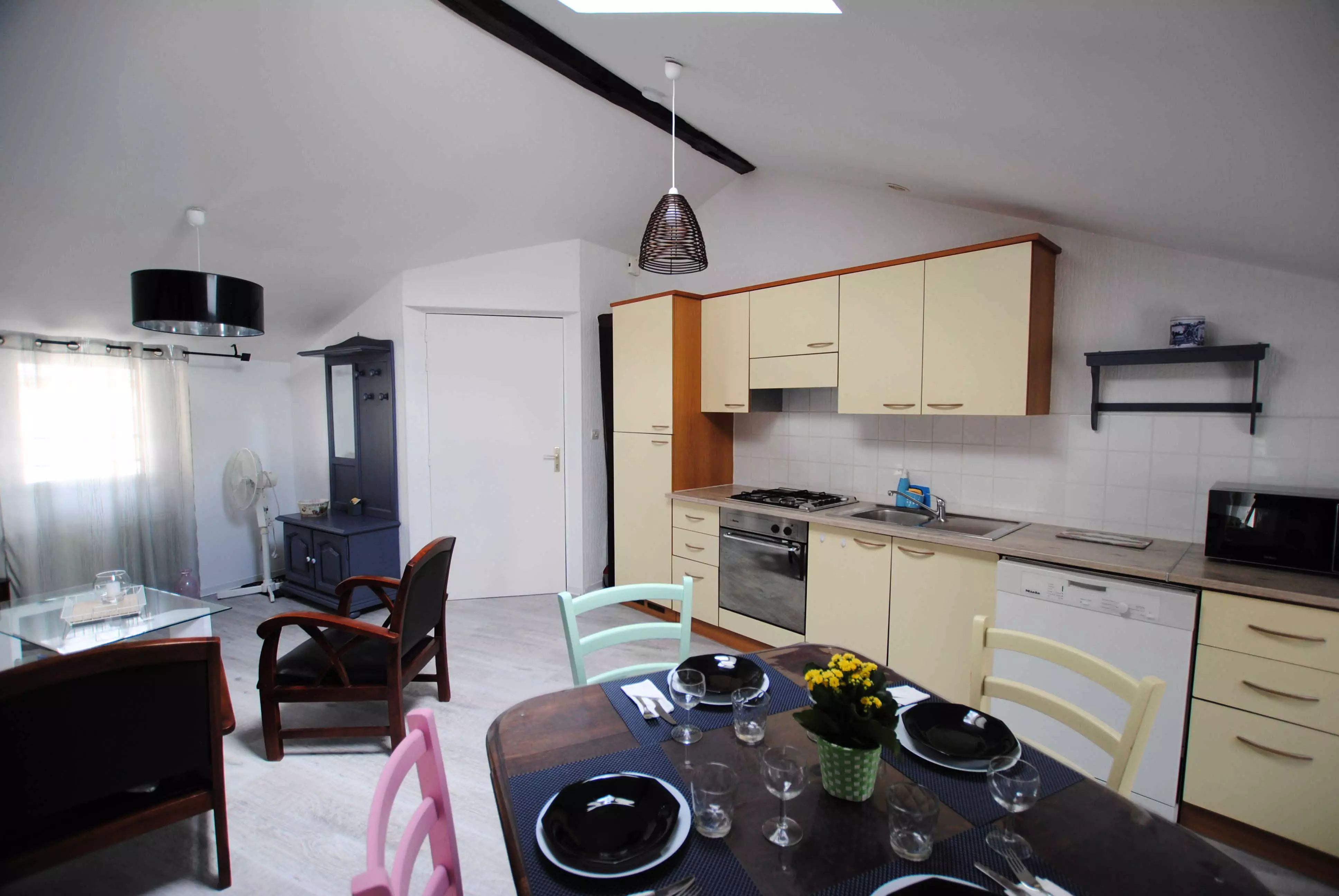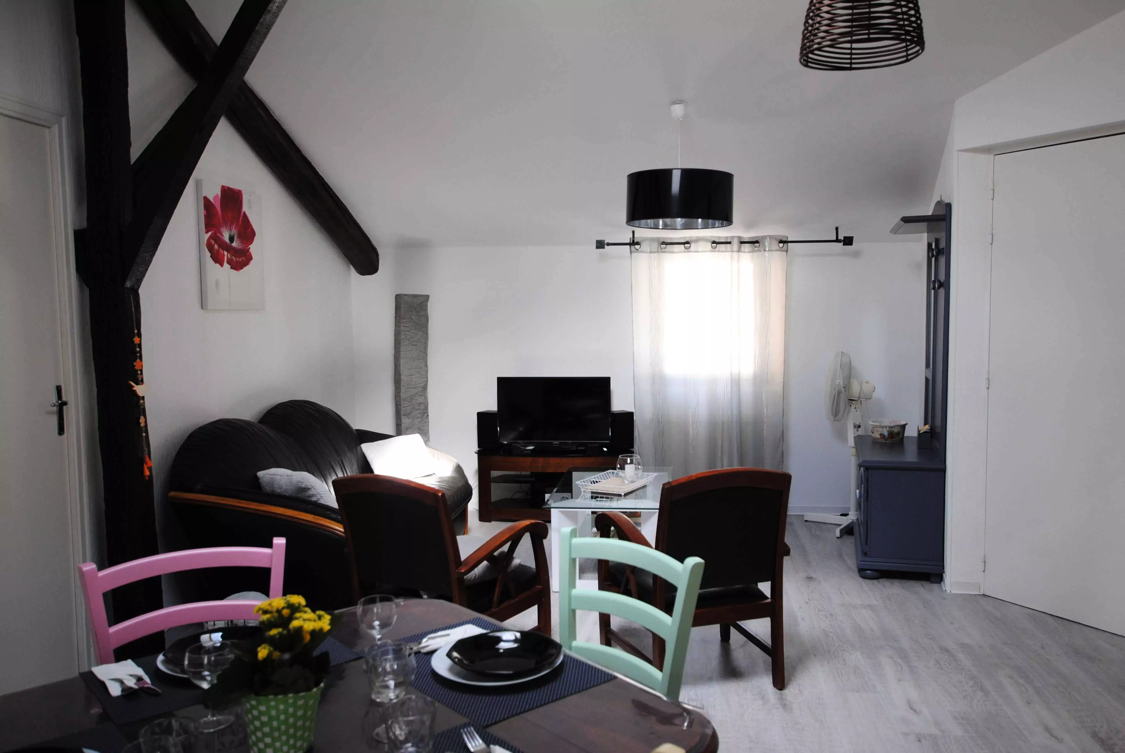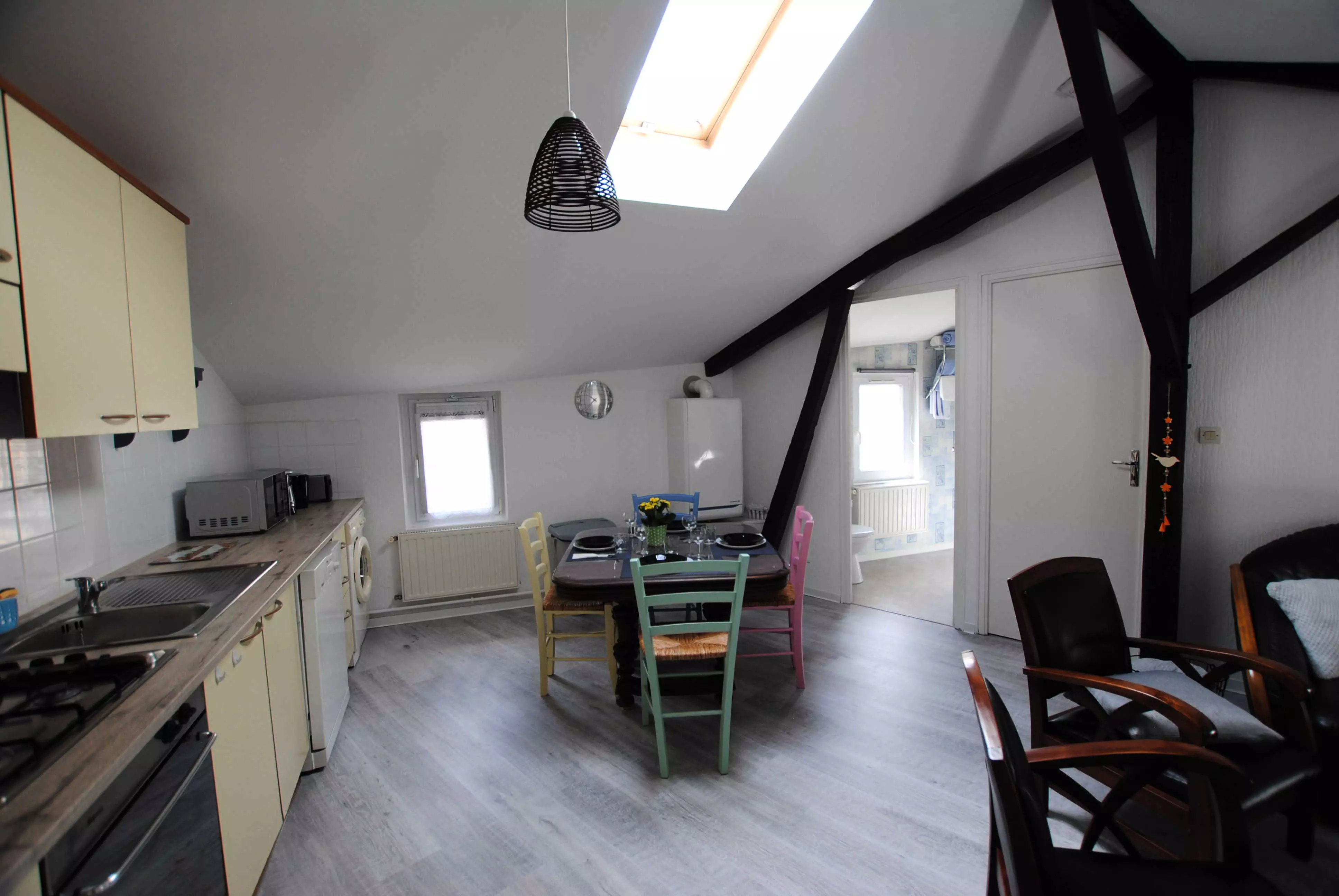 Appartement situé au deuxième étage d'une charmante maison de ville, au calme et en plein centre-ville, il est équipé d'une pièce à vivre avec coin repas, coin salon et cuisine équipée, d'une chambre avec un lit en 140*190 ainsi que d'une salle d'eau avec WC.