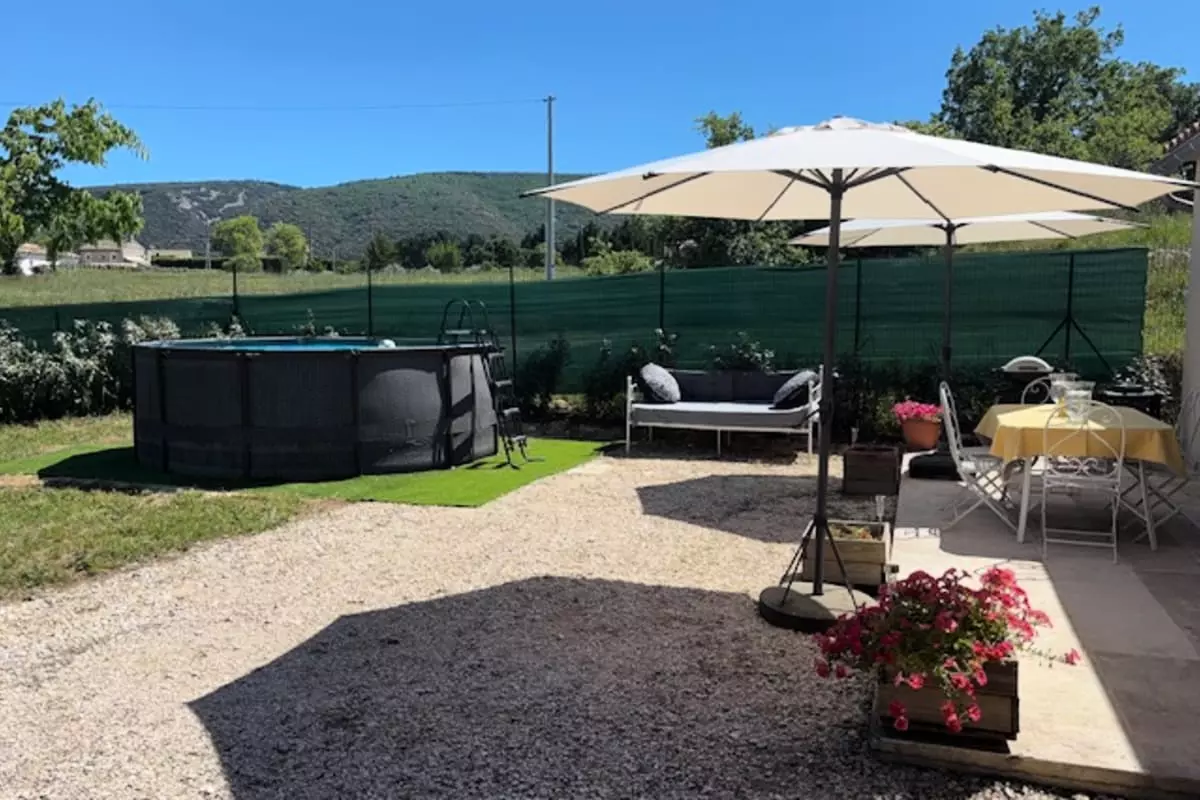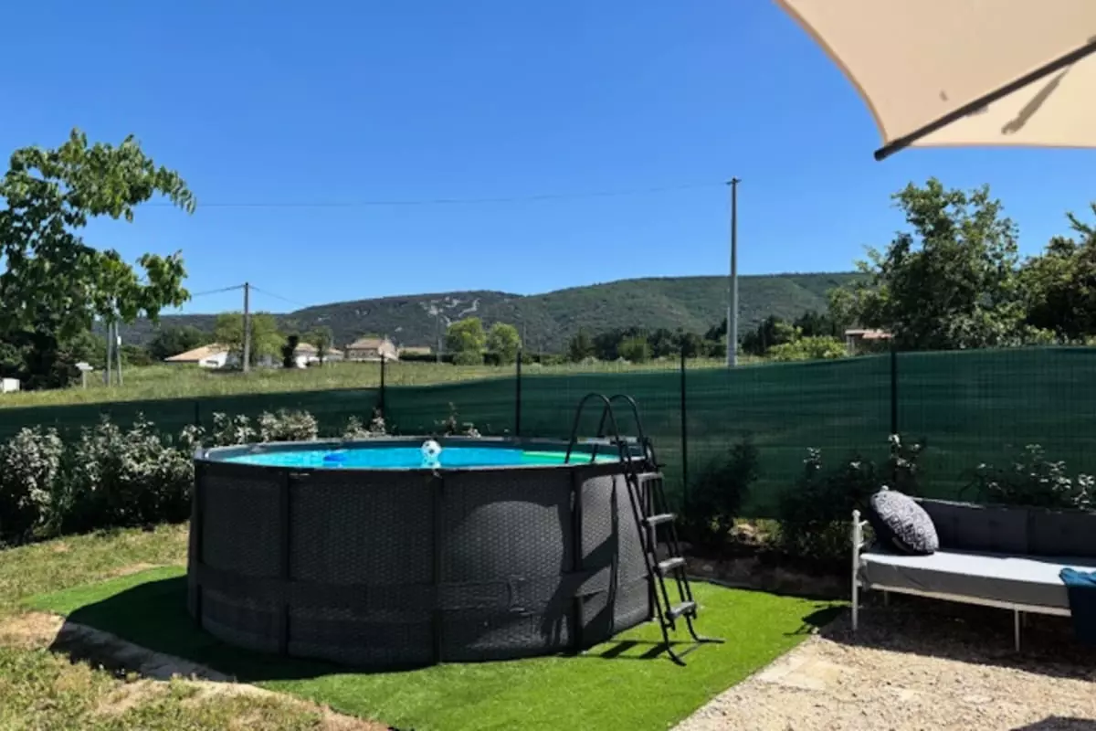 L'extérieur vous invite à la détente avec sa piscine hors-sol, un jardin de relaxation et une terrasse aménagée pour vos repas estivaux. Table, barbecue et un coin lounge vous attendent pour des moments conviviaux en plein air, sous le ciel bleu de la région.