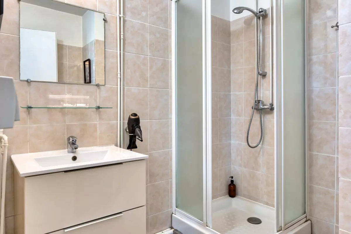 La salle d'eau se compose d’un meuble vasque, d’un sèche-serviettes, d’une douche. Les toilettes sont séparées.