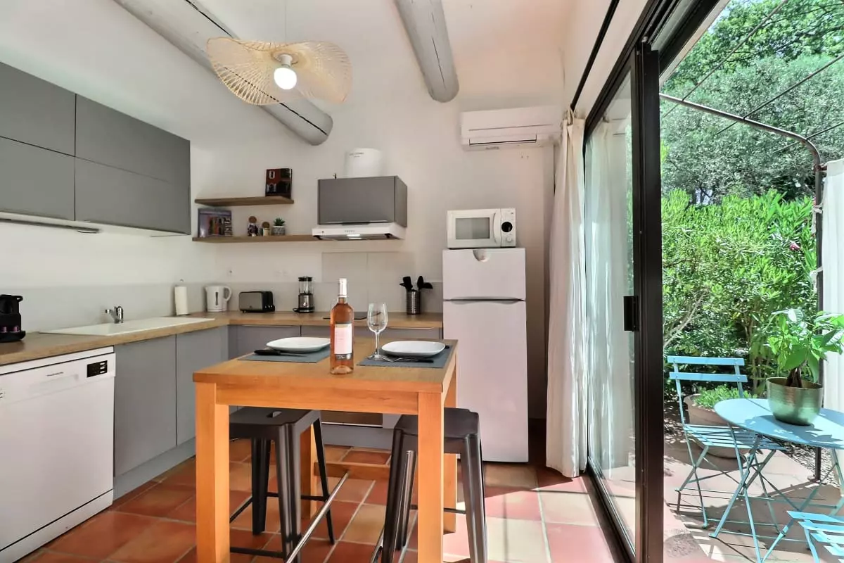 Le salon, chaleureux et accueillant, est équipé d’un canapé confortable, d’un fauteuil, d’un pouf, d’une table basse et d’une télévision. À côté, une cuisine séparée, entièrement équipée, vous invite à préparer vos repas avec tout le nécessaire : lave-vaisselle, four, plaques de cuisson, réfrigérateur, micro-ondes, cafetière, bouilloire, grille-pain et vaisselle. Chaque détail a été pensé pour votre confort.