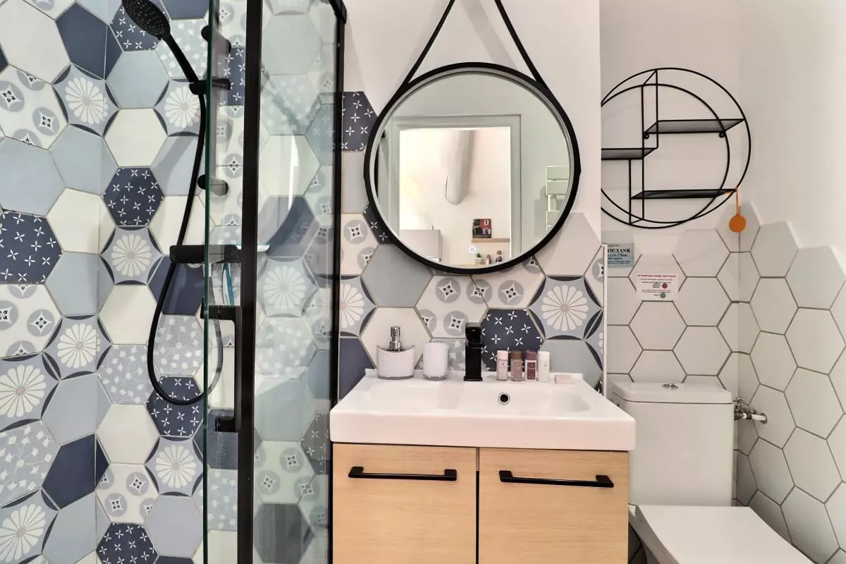 La chambre, véritable cocon de tranquillité, dispose d’un lit double (140x200), d’un espace de rangement et d’un accès direct à la terrasse. Réveillez-vous chaque matin avec une vue imprenable sur la nature provençale. La salle de bain moderne complète l’espace avec une douche, un meuble sous vasque et des toilettes. Draps et serviettes sont fournis pour un séjour sans souci.