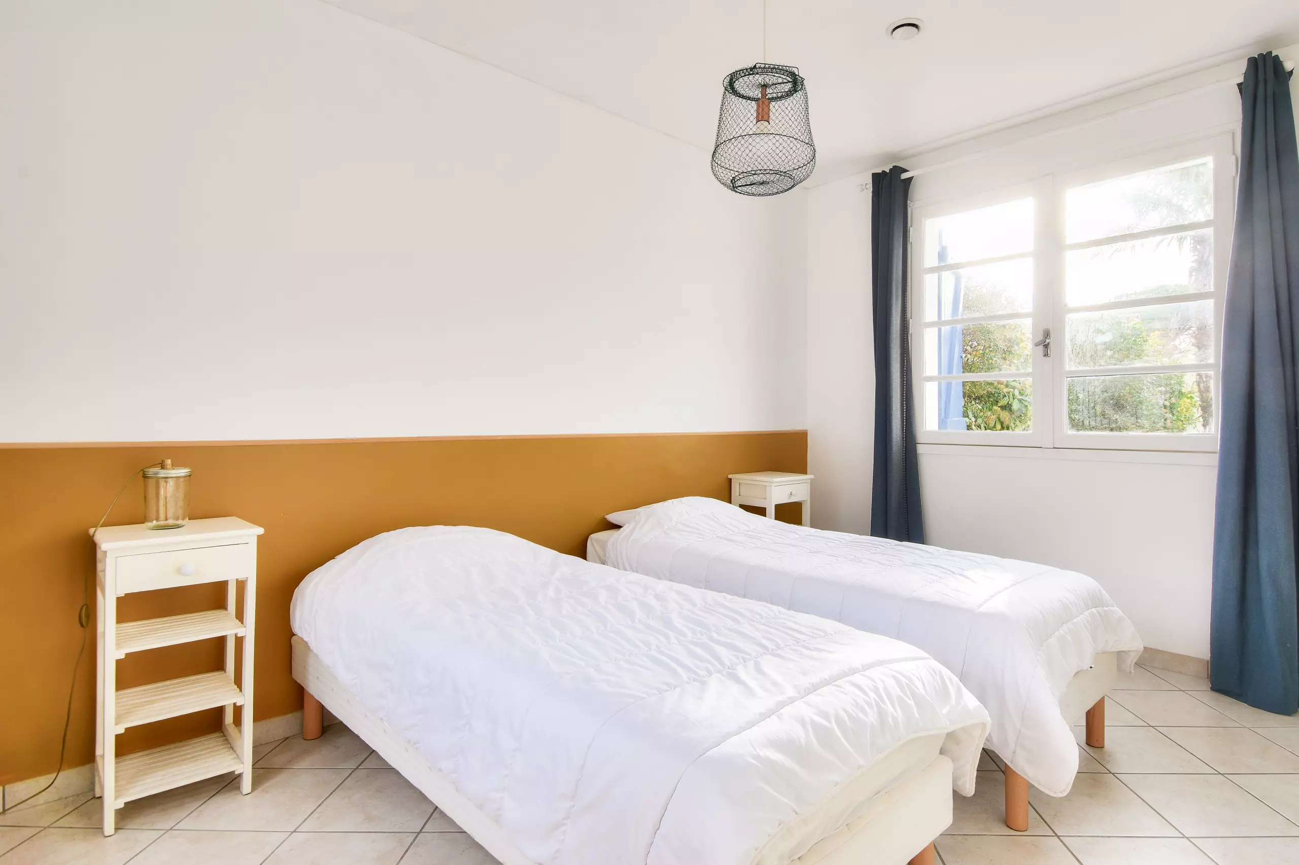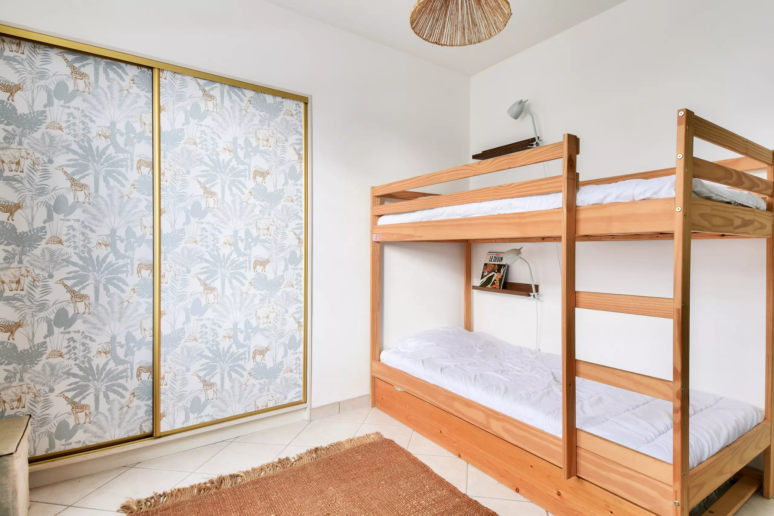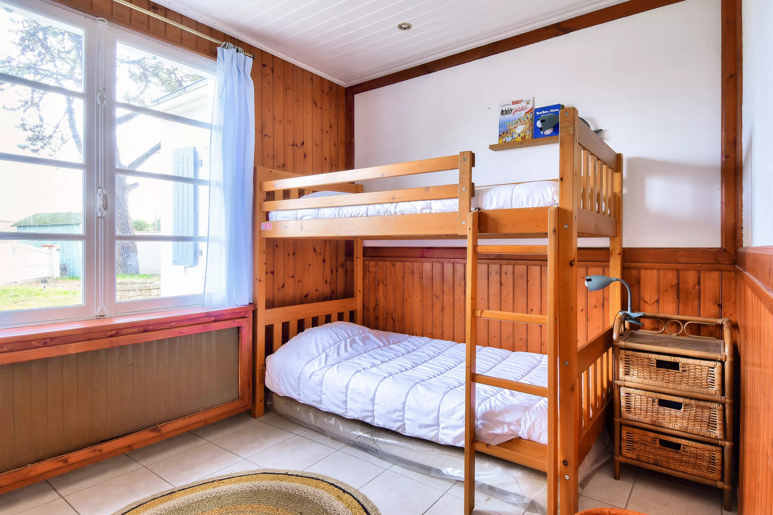 Côté nuit, la maison dispose de cinq chambres confortables, pensées pour accueillir jusqu'à 6 adultes et 4 enfants. Une première chambre est équipée d'un lit Queen Size (160x200), une seconde d'un lit double (140x200), une troisième de lits simples (90x200), et deux autres chambres sont aménagées avec des lits superposés (80x200), idéales pour les enfants. La maison dispose également de deux WC séparés, d'une salle d'eau avec douche et sèche-cheveux, ainsi que d'une salle de bain avec baignoire, pour le confort de tous.