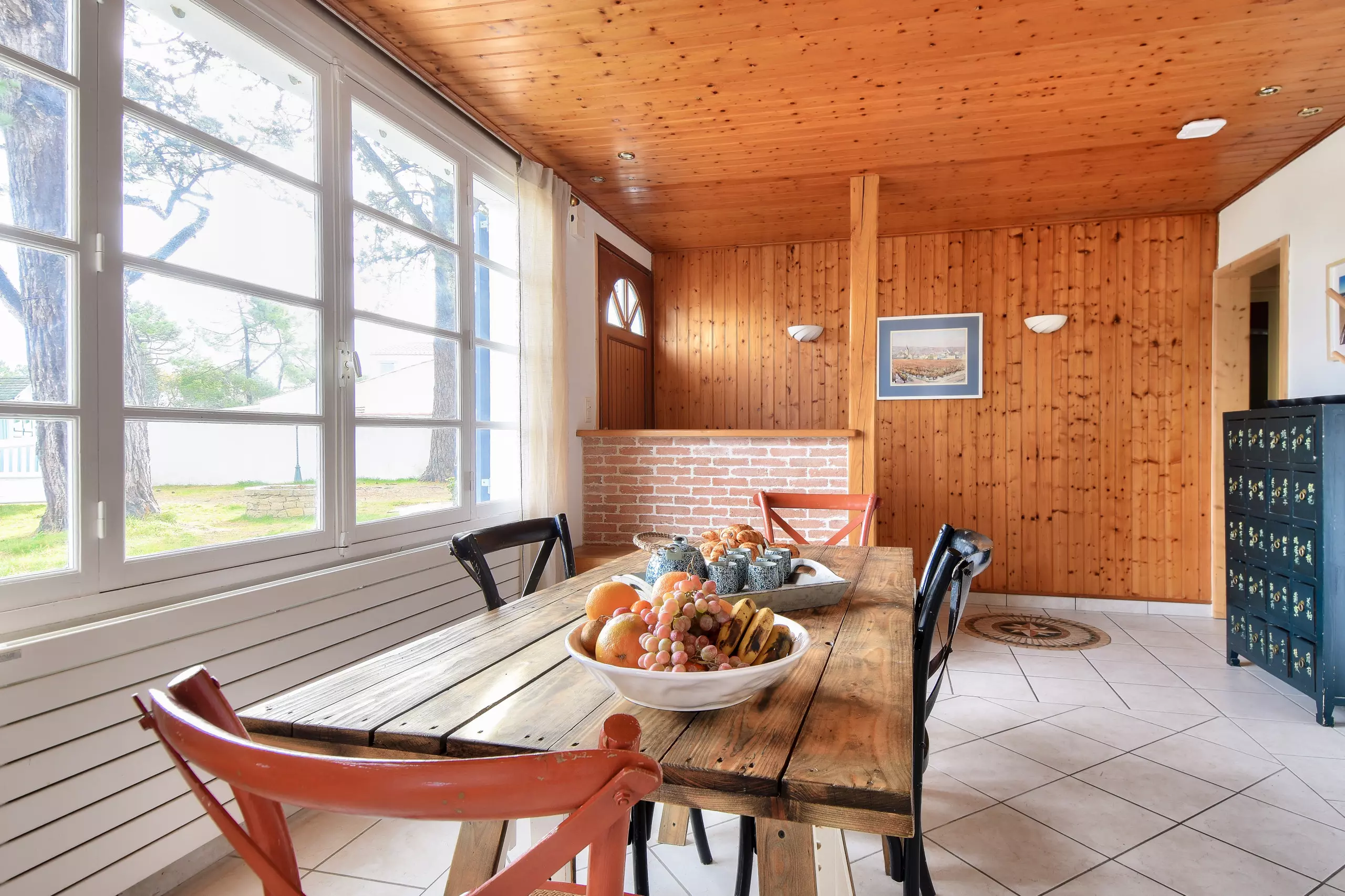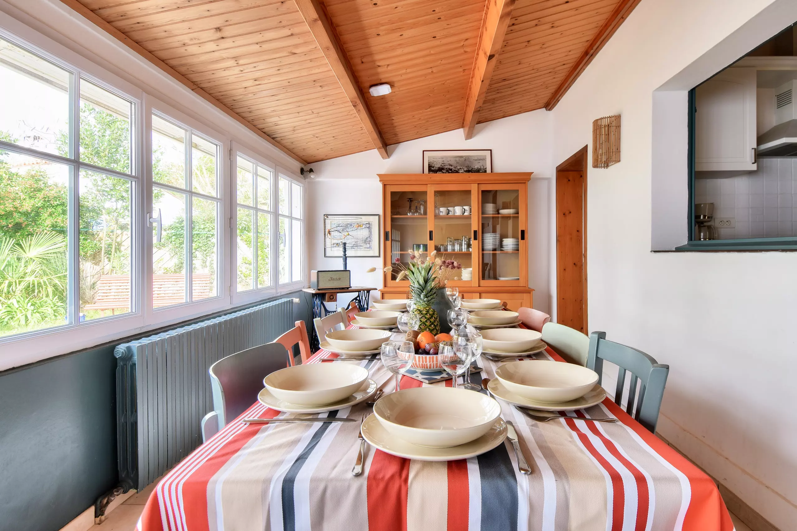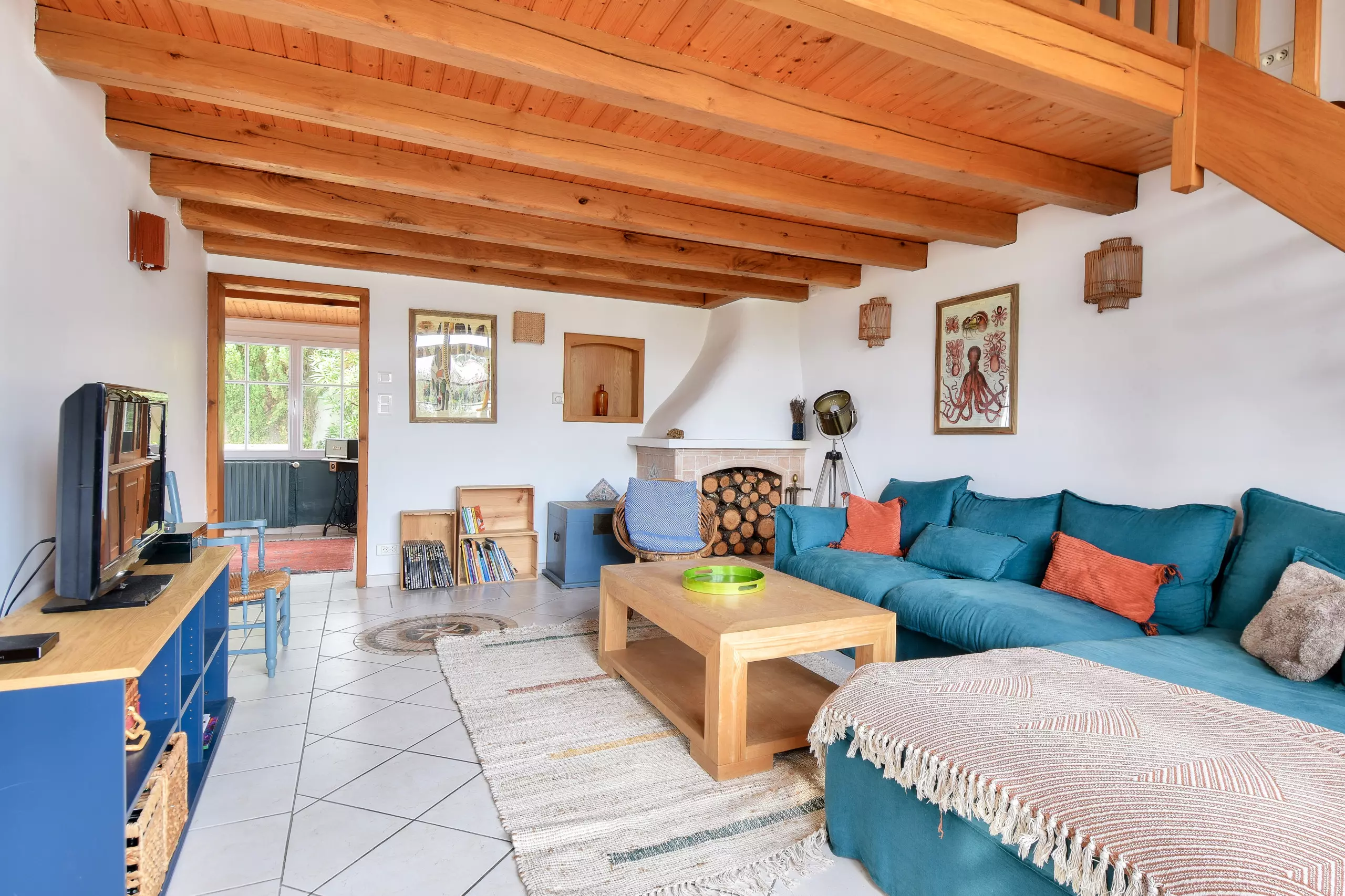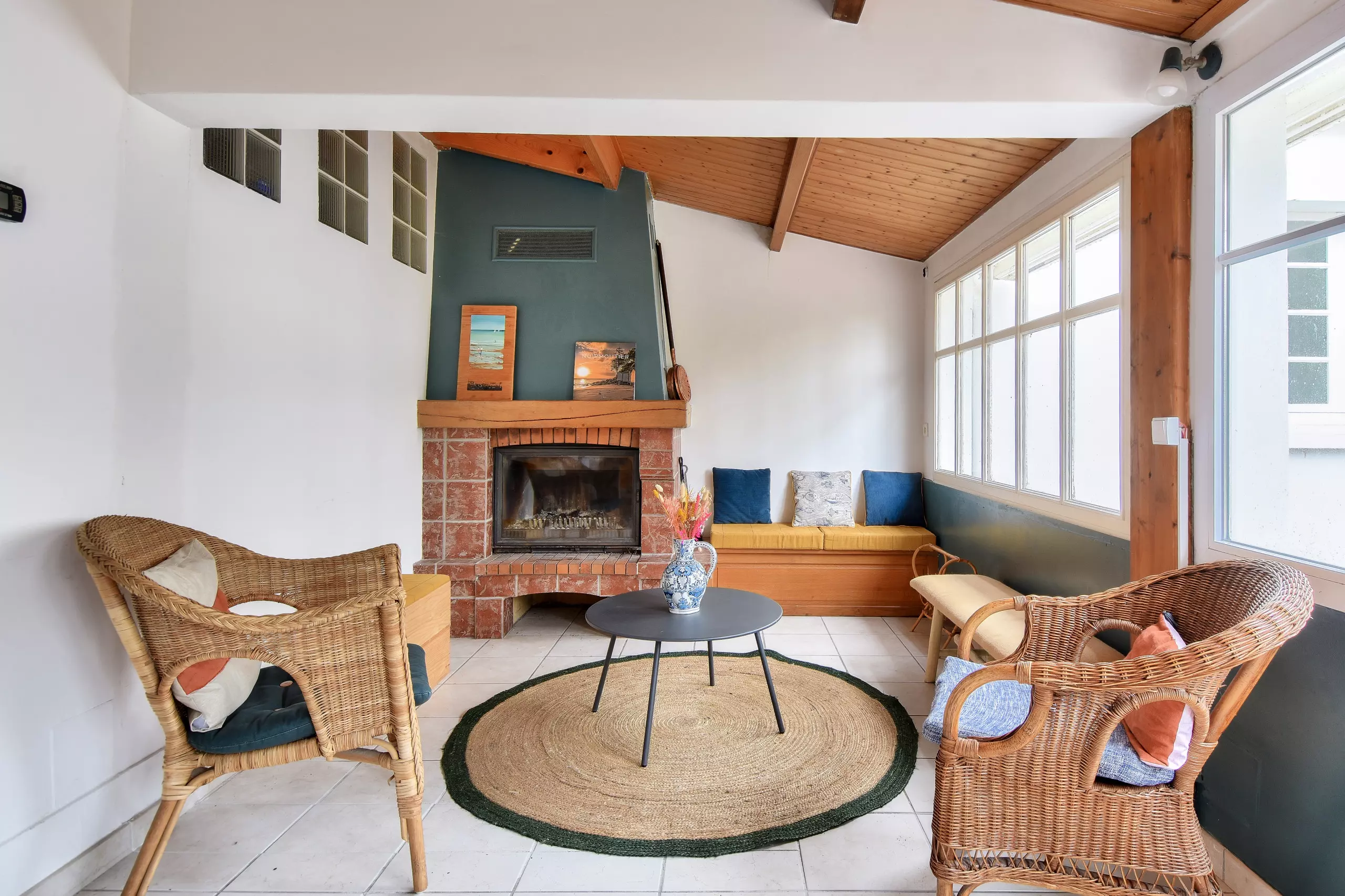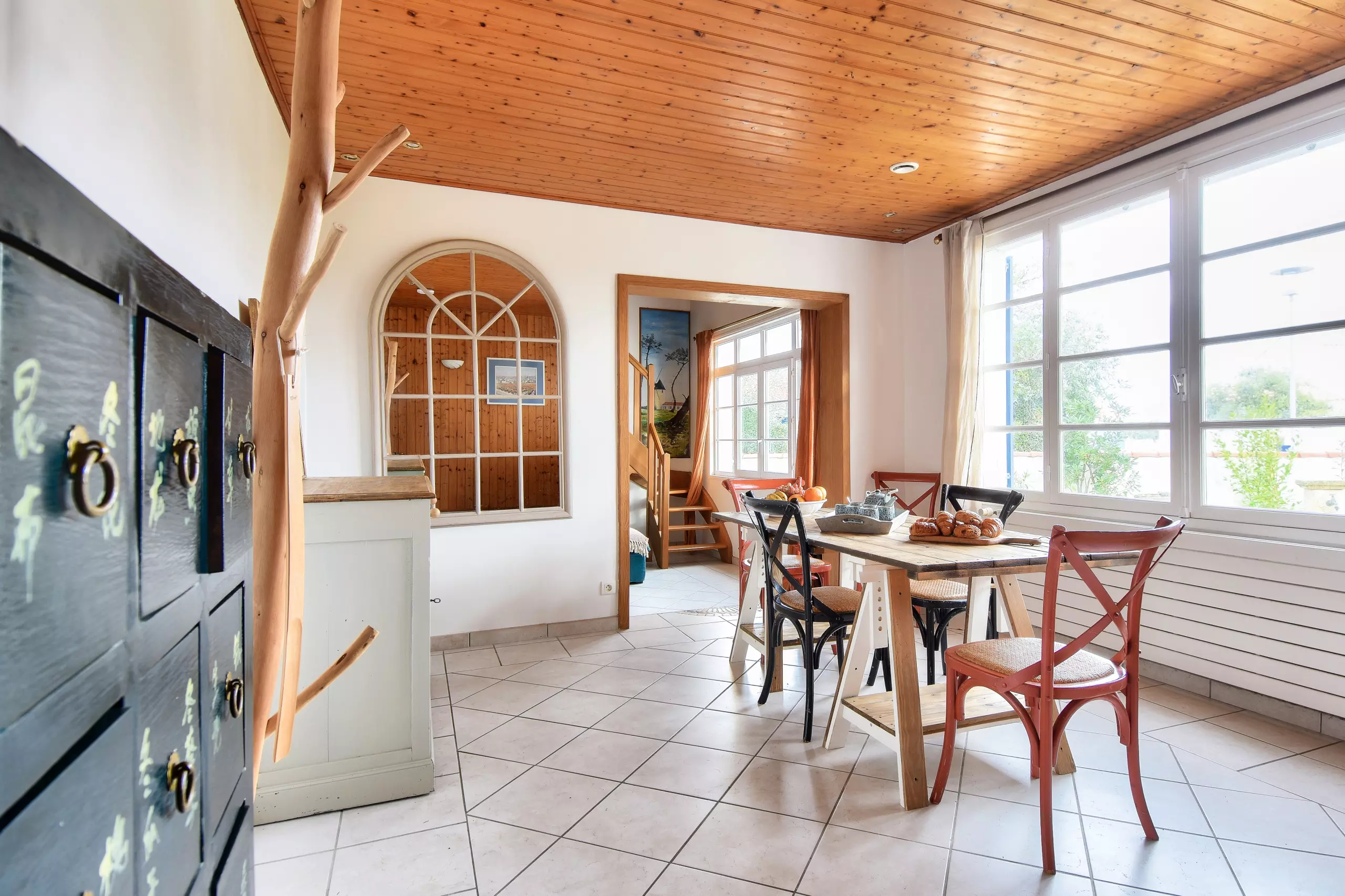 Dès l'entrée dans la maison, vous découvrirez un petit séjour donnant accès à un grand salon TV chaleureux, surplombé par une mezzanine aménagée en salle de jeux, avec plein de jouets pour enfants et jeux de société. Un espace idéal pour se retrouver après une journée à la plage. La véranda, baignée de lumière, vous séduira avec son petit salon installé face à la cheminée et sa grande table à manger, parfaite pour vos repas dans une ambiance chaleureuse, tout en profitant de la vue sur le jardin et la piscine.