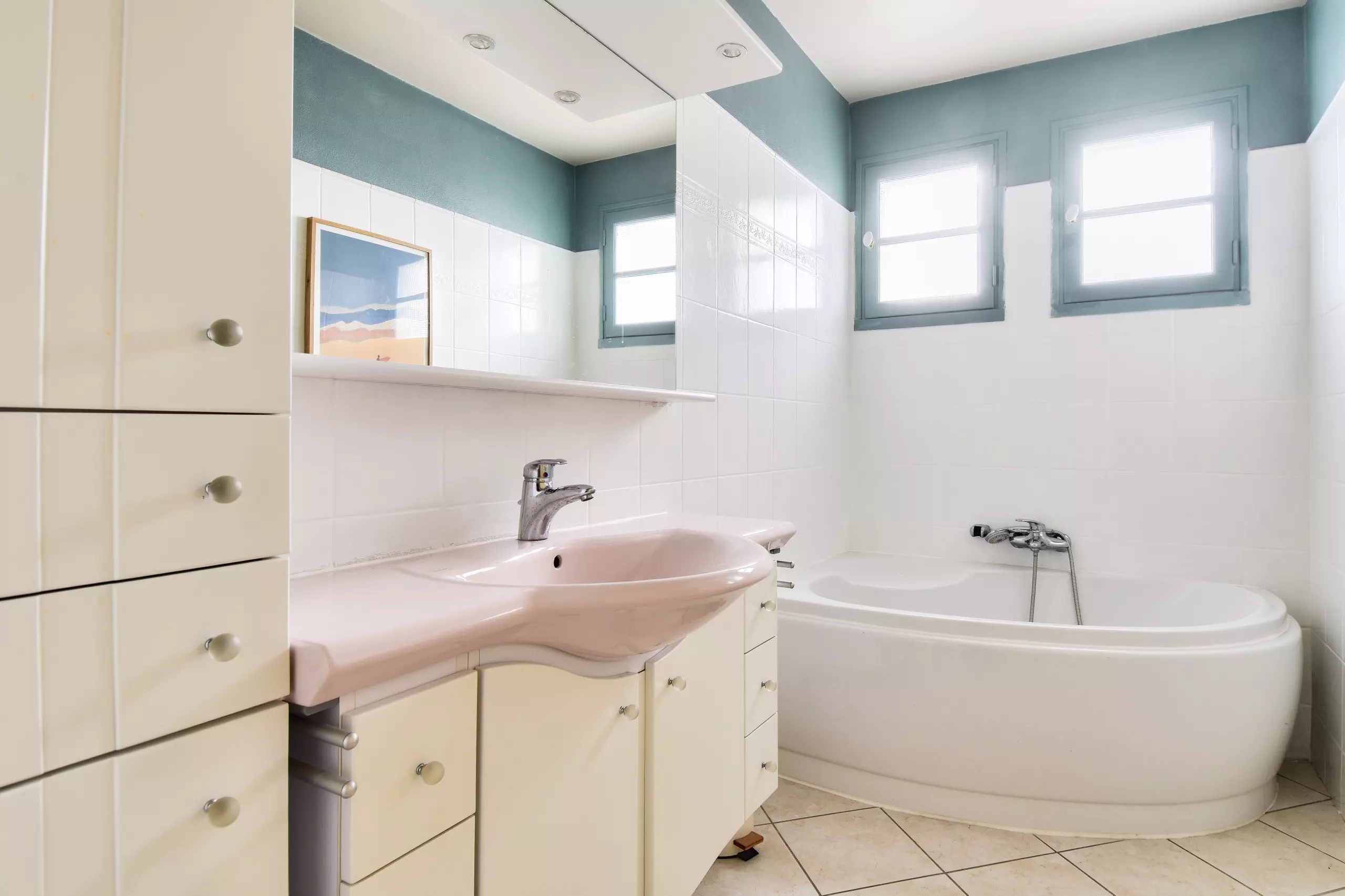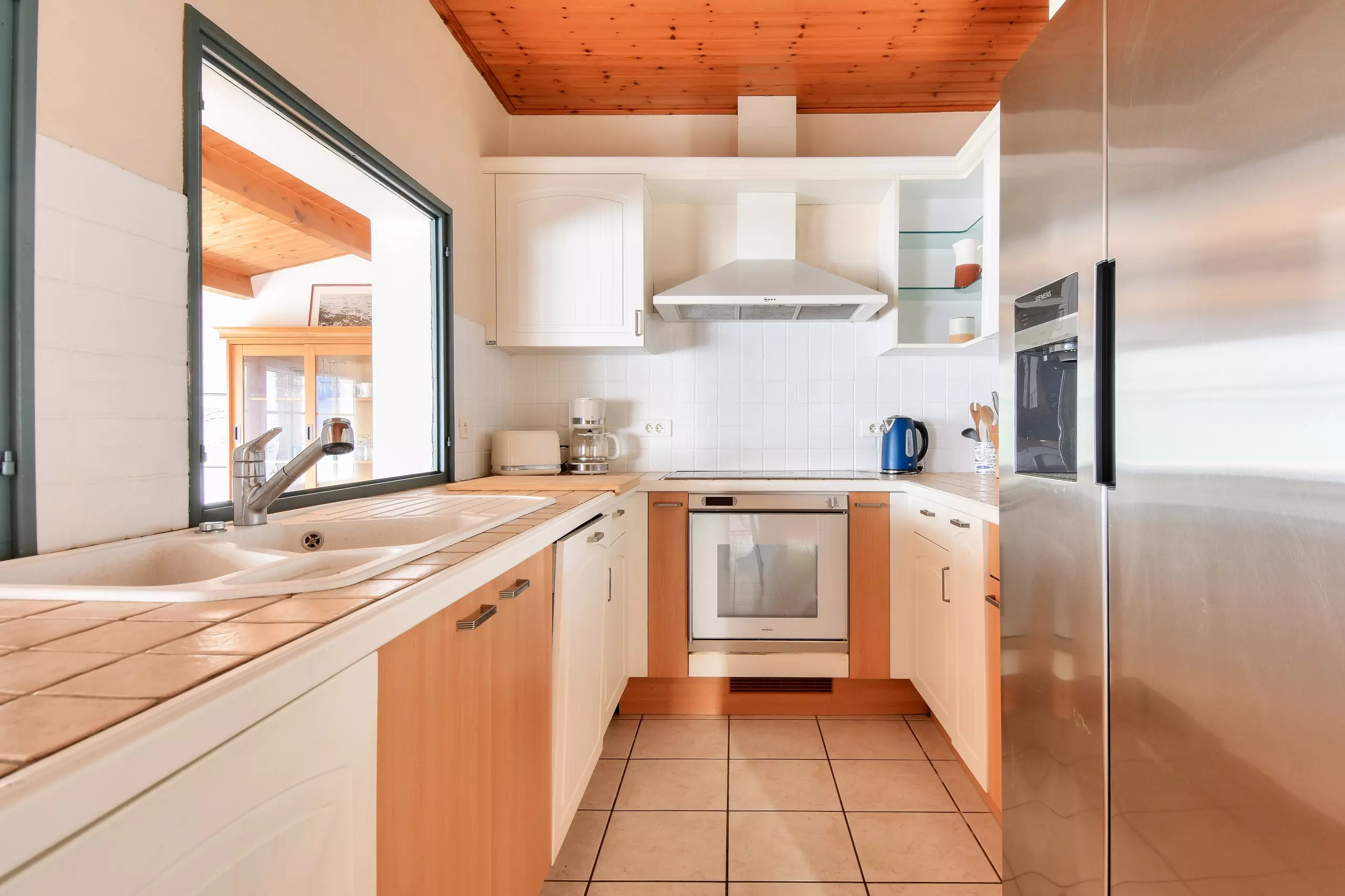 La cuisine américaine, moderne et parfaitement équipée, vous offre tout le nécessaire pour préparer vos repas : plaques de cuisson à induction, réfrigérateur, congélateur, micro-ondes, four, lave-vaisselle, cafetière filtre et Nespresso, grille-pain, bouilloire ainsi que l'ensemble des ustensiles indispensables.