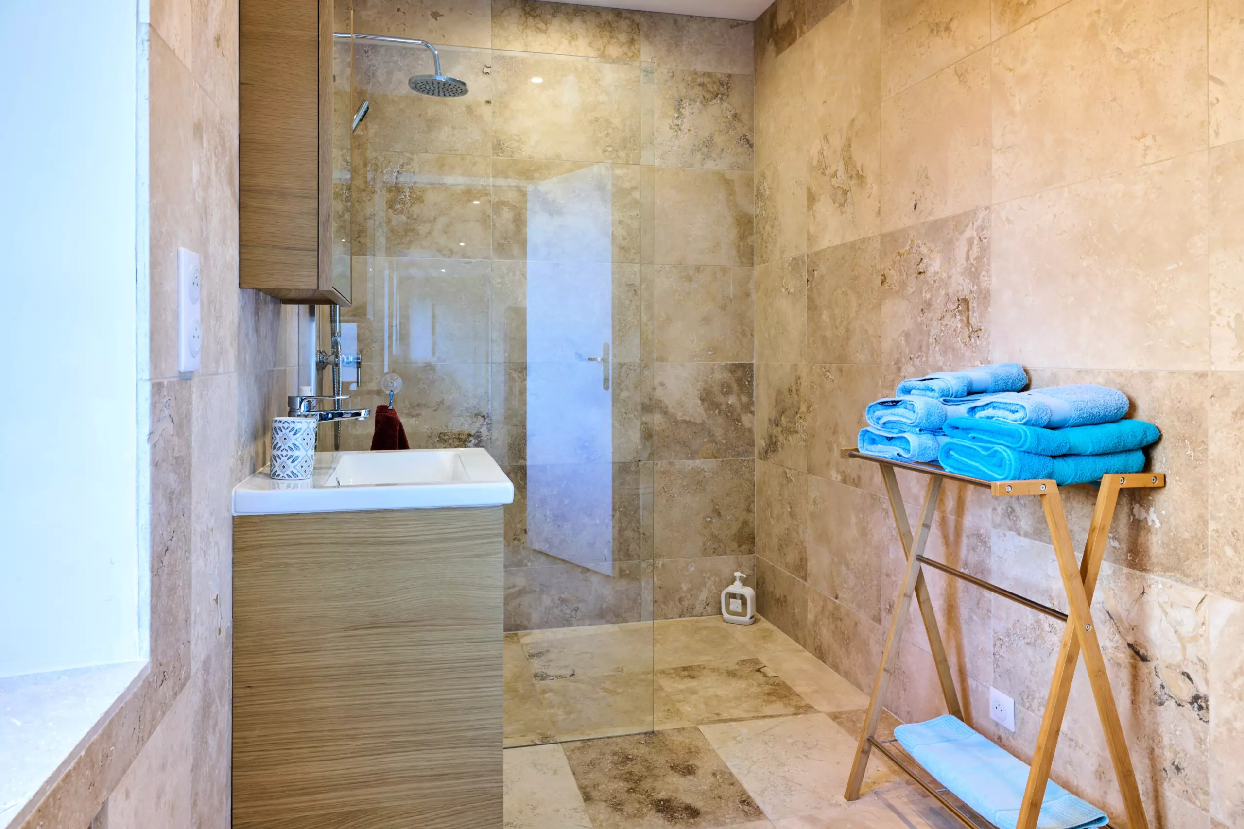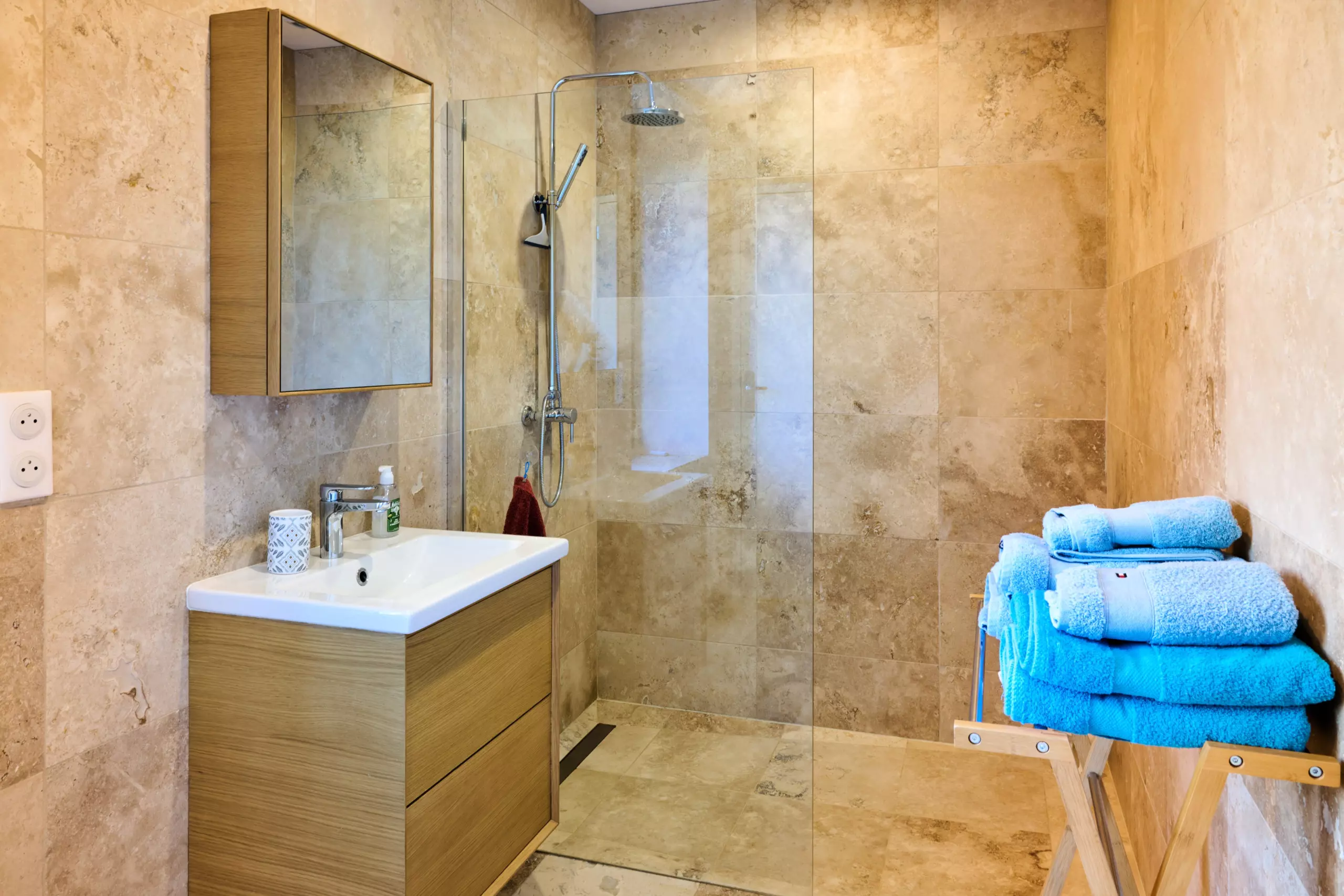 La salle d'eau contemporaine dispose d'une douche à l'italienne, idéale pour se détendre après une journée de découvertes.