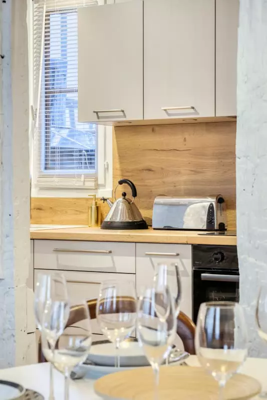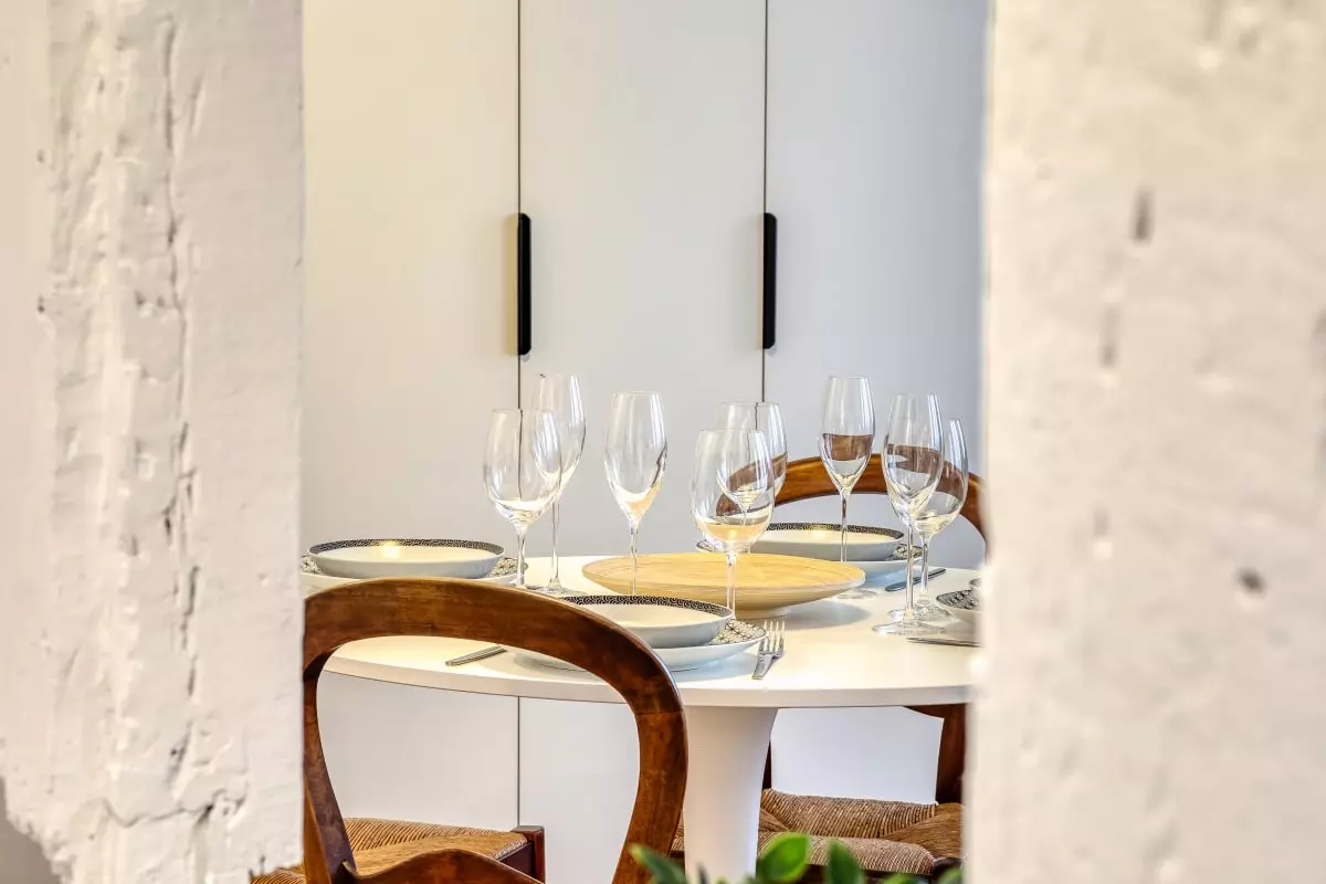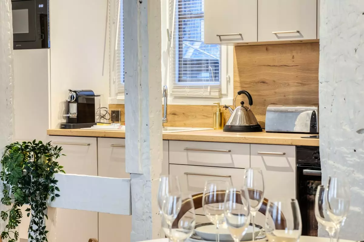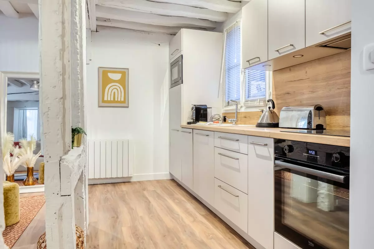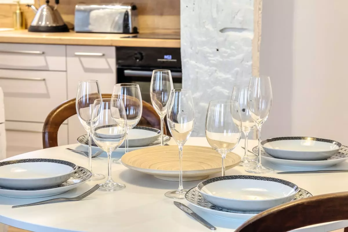 La cuisine, aménagée et entièrement équipée, vous permet de cuisiner simplement comme à la maison : plaques, four, four micro-ondes, réfrigérateur, bouilloire, grille-pain, Nespresso et de nombreux ustensiles. Que vous restiez une nuit ou plusieurs jours, tout est pensé pour un séjour fluide et pratique.
