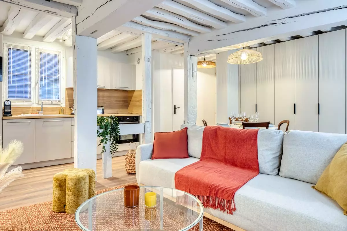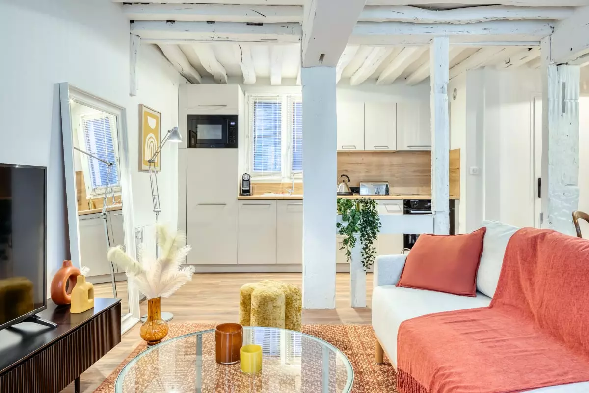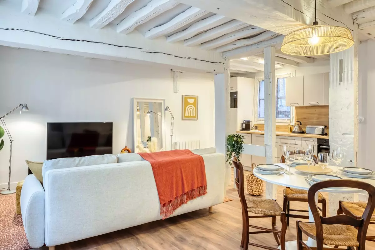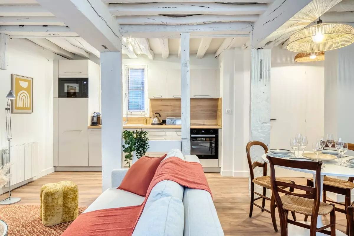 Entièrement rénové en décembre 2025, Le Matisse est un élégant F2 au style chic et intimiste, où le charme normand s’invite avec de belles poutres apparentes. Dès l’entrée, vous découvrez un séjour cosy avec cuisine ouverte, parfait pour se poser et se sentir tout de suite chez soi. Le salon vous attend pour vos moments de détente : canapé-lit confortable (1 personne), TV pour les soirées cocooning, et une table pour 4 idéale pour partager un repas, travailler ou préparer votre itinéraire du lendemain.