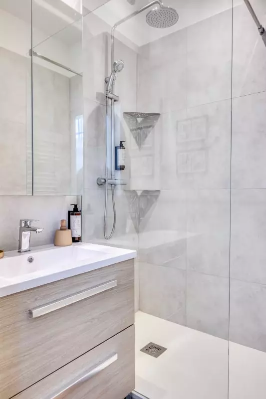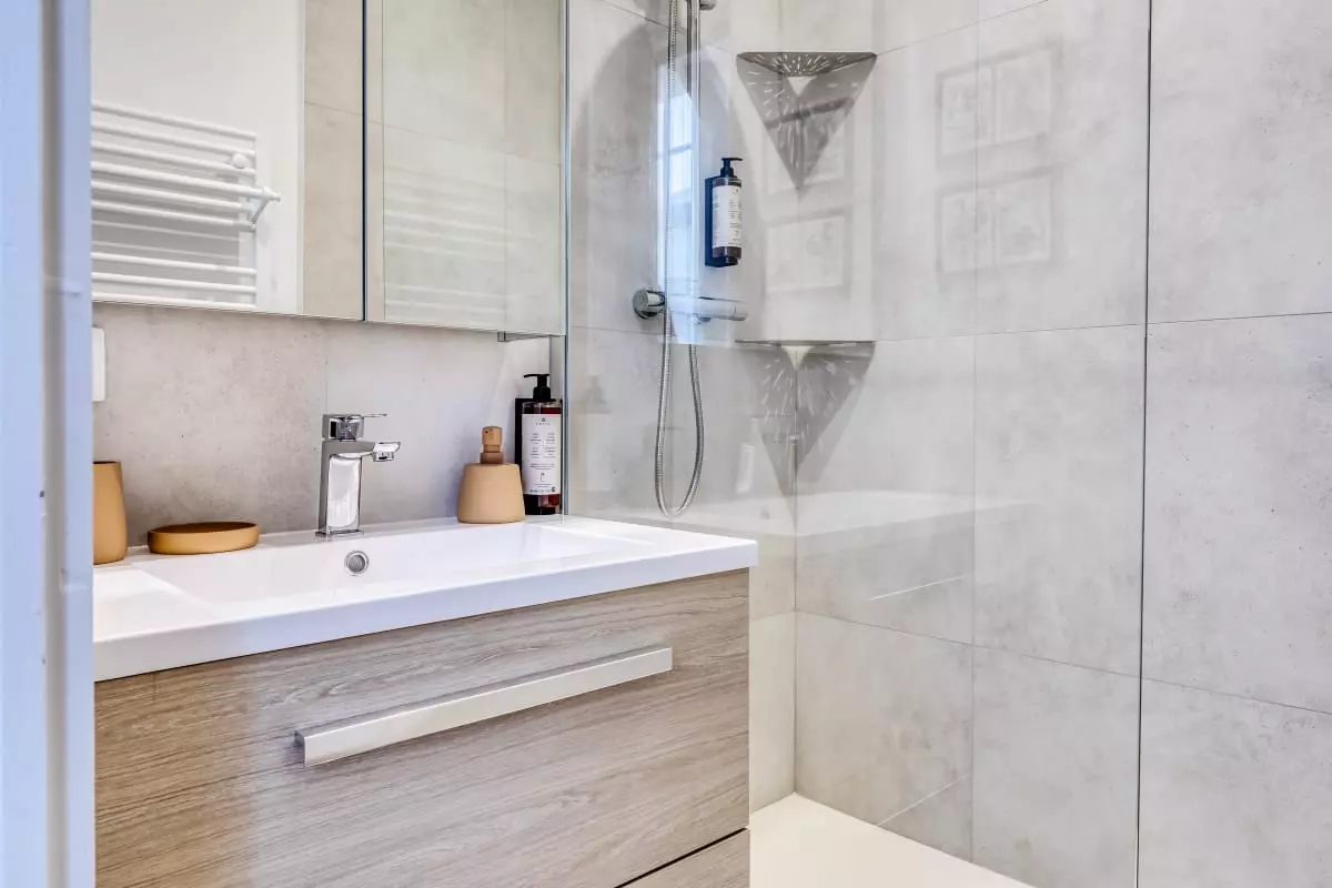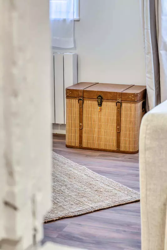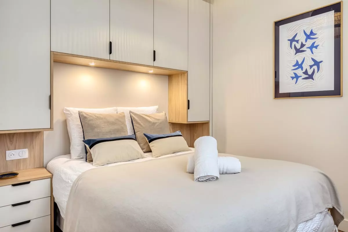 Côté nuit, la chambre offre une parenthèse calme et reposante avec un lit double (140x200), parfait pour récupérer après une journée de découvertes. Vous trouverez de nombreux rangements dans la chambre et dans l’appartement, très appréciables pour les séjours plus longs. La salle d’eau moderne, attenante à la chambre, dispose d’une douche, d’un meuble lavabo et d'un sèhe-cheveux. . Les WC séparés intègrent une machine à laver séchante, un vrai plus pour les escapades prolongées. Du matériel de repassage est également à disposition.