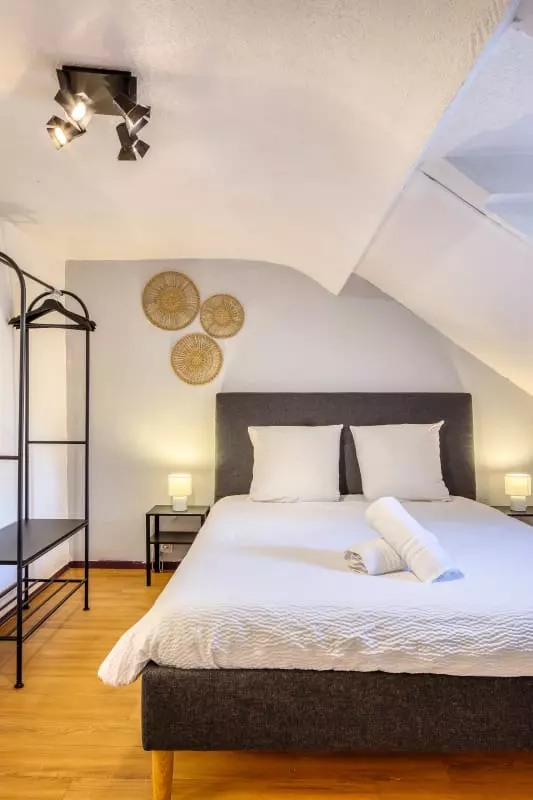 La chambre dispose d’un lit double confortable et de rangements. La salle d’eau, au charme atypique, comprend une douche et des WC.