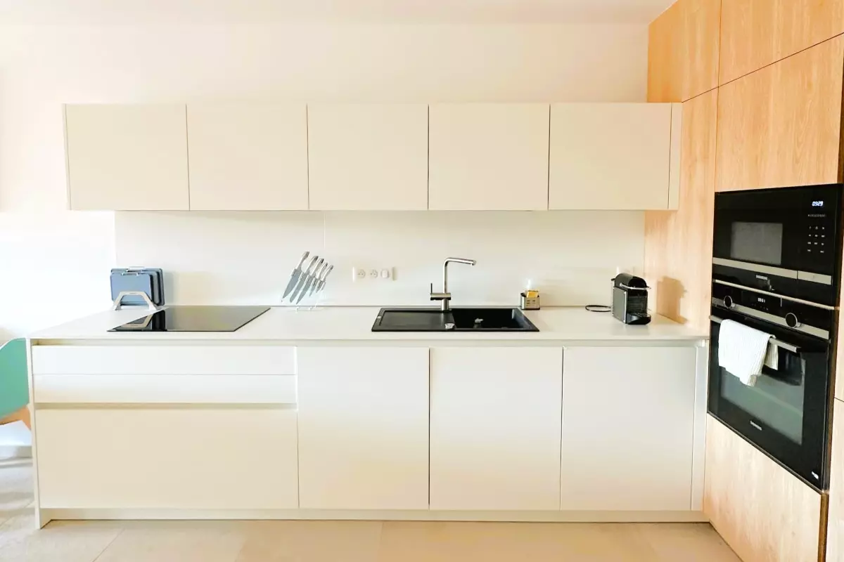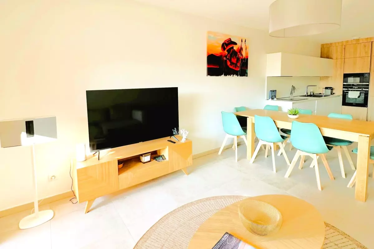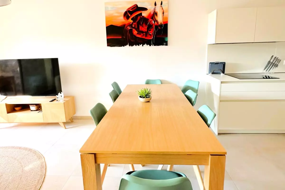 Notre appartement duplex offre un espace de vie spacieux et lumineux, avec une cuisine entièrement équipée, un coin repas, et un salon confortable. Montez à l'étage pour découvrir deux chambres joliment décorées, et chacune avec sa propre salle de bains.