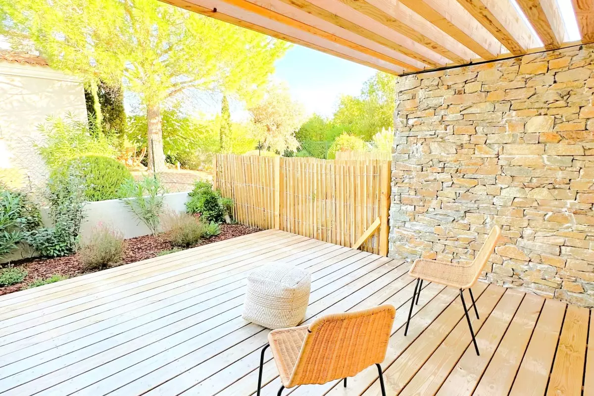 Depuis la terrasse couverte avec le barbecue Weber, vous pourrez profiter de repas en plein air.