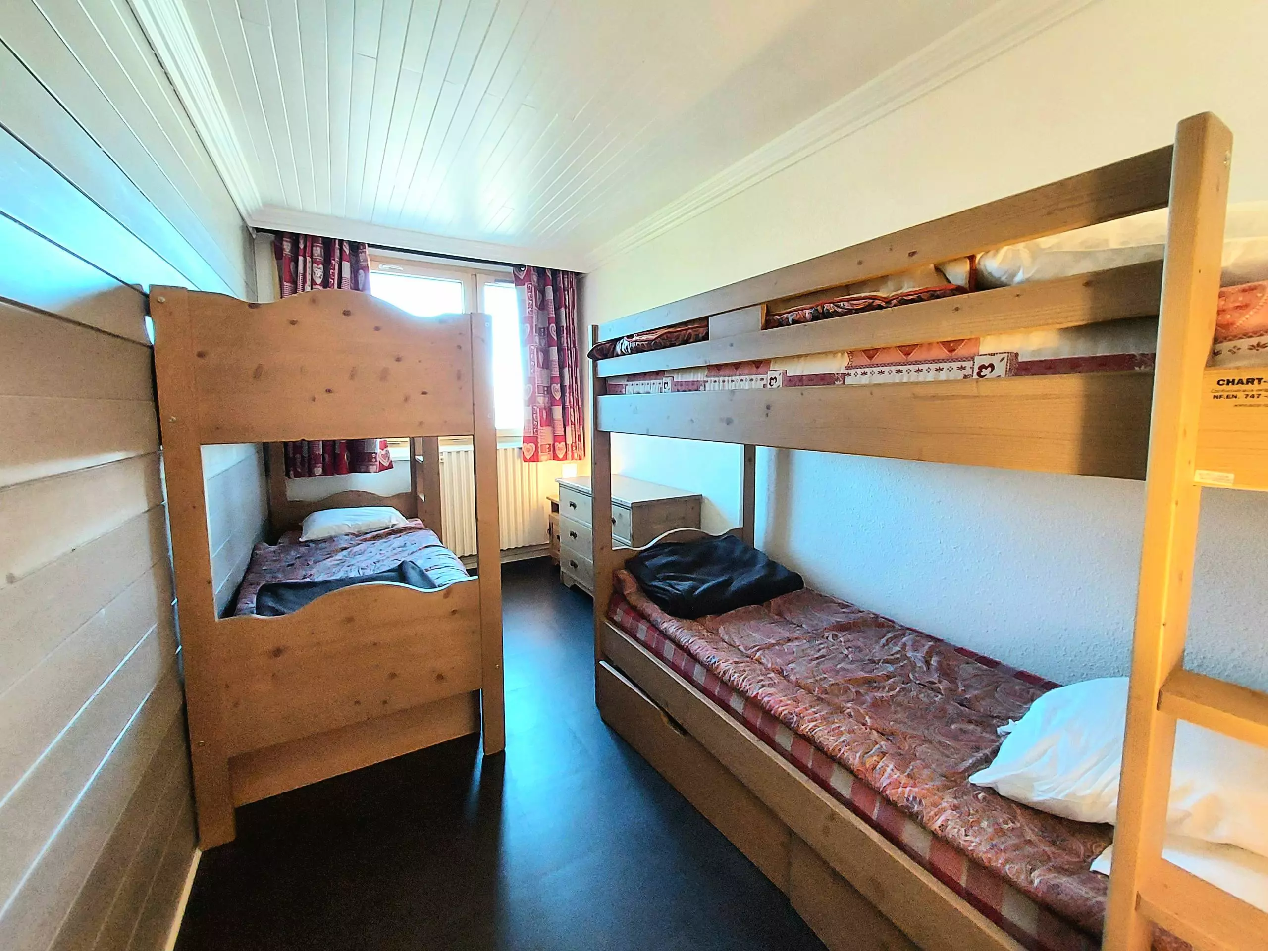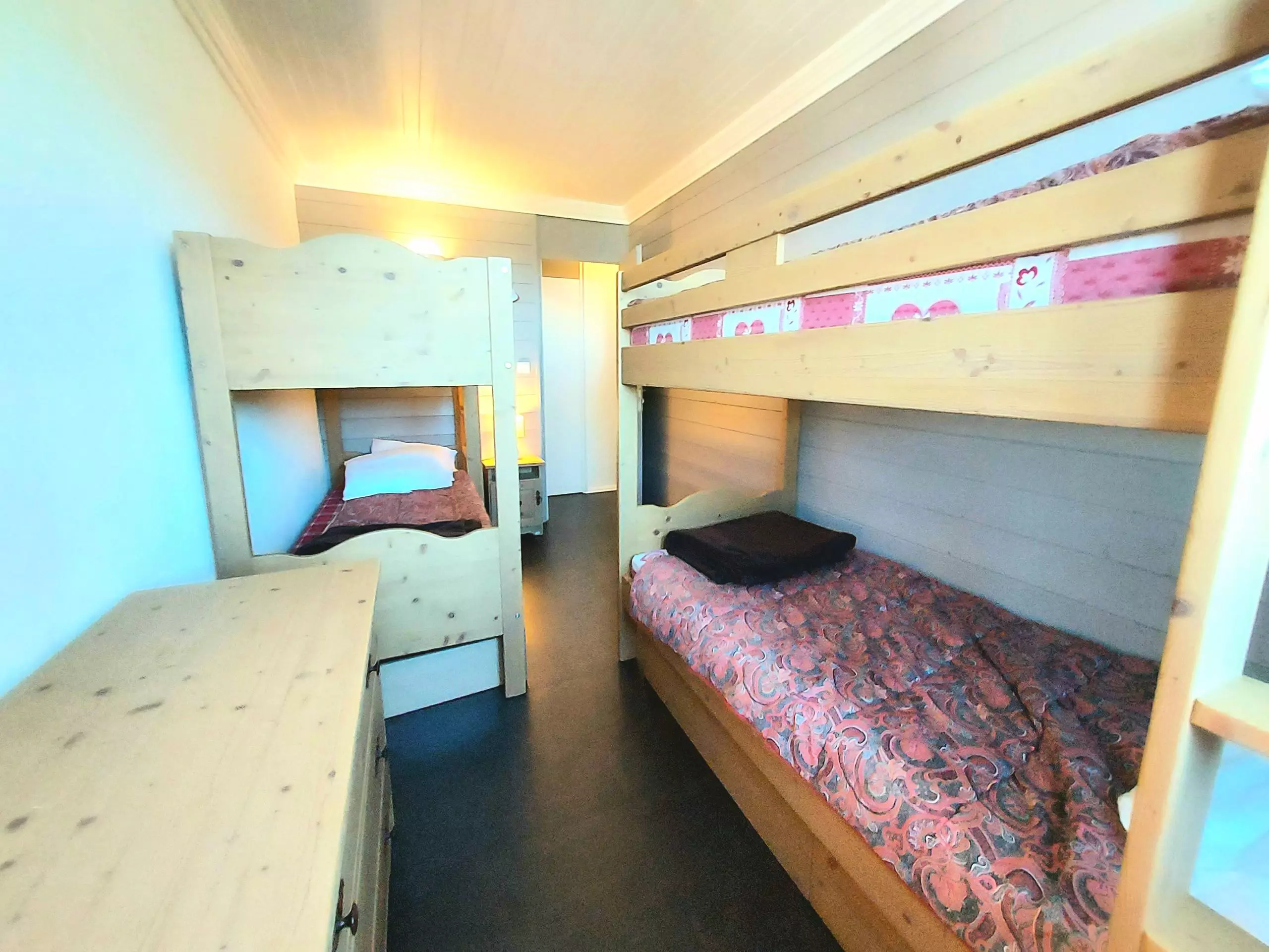 - Chambre avec deux lits superposés, rangement sous-lit.