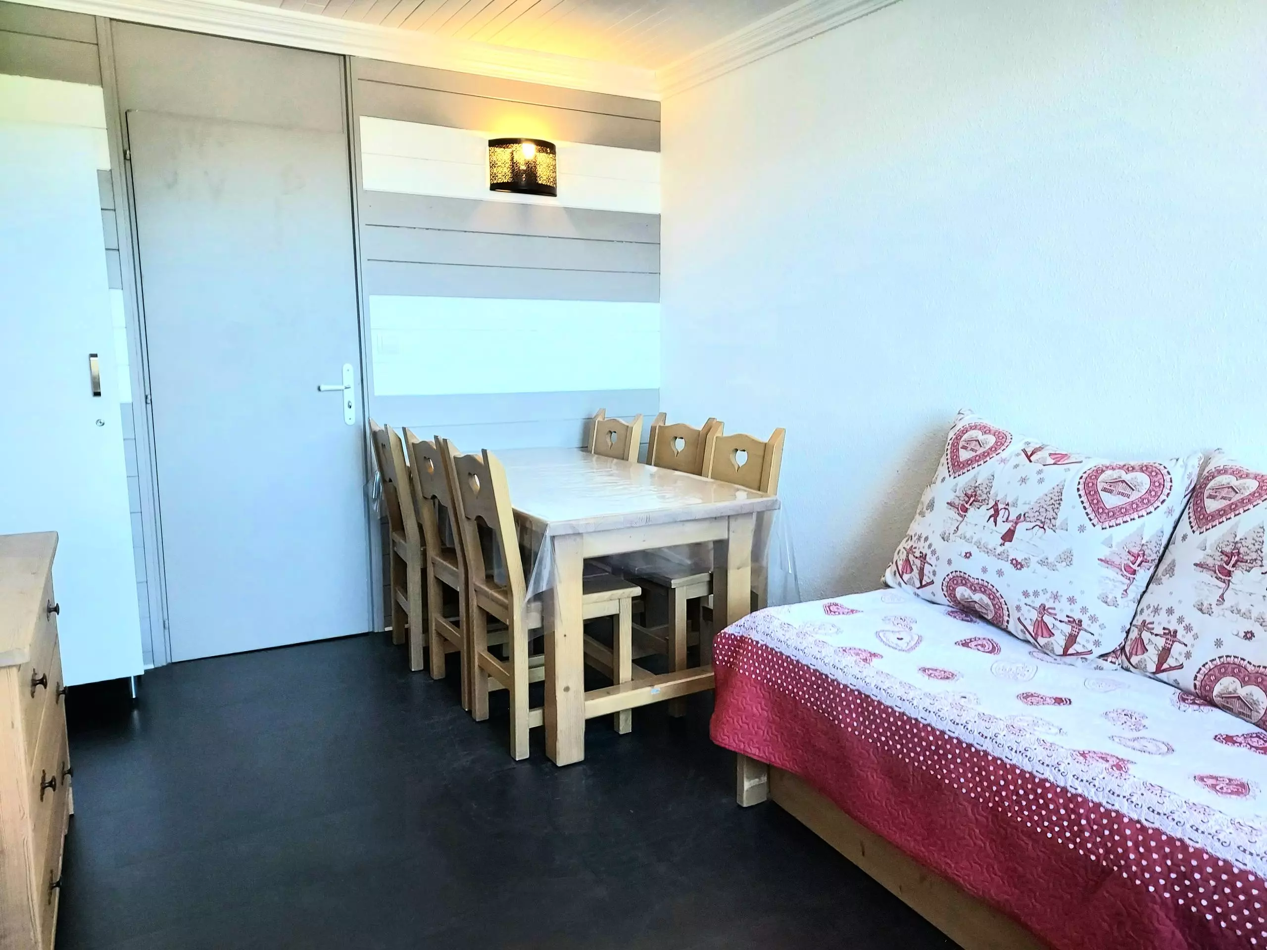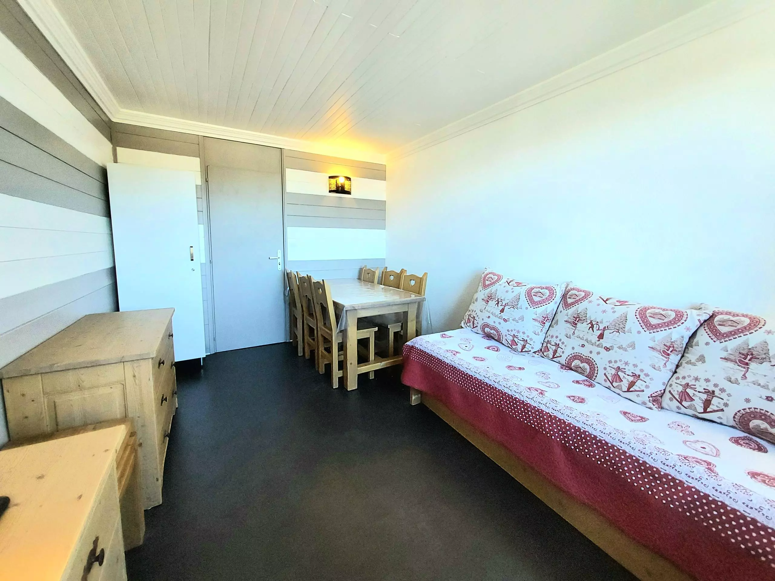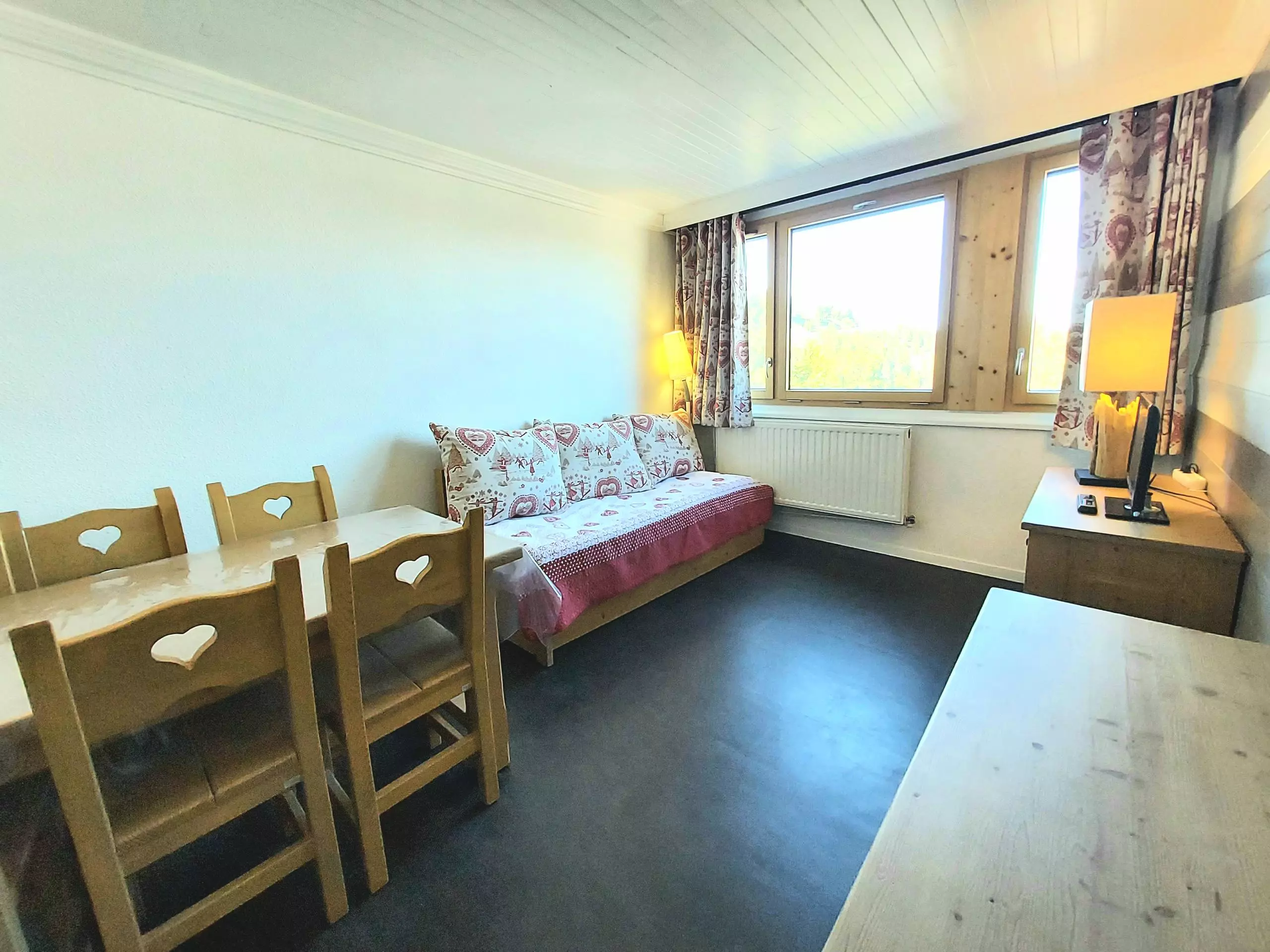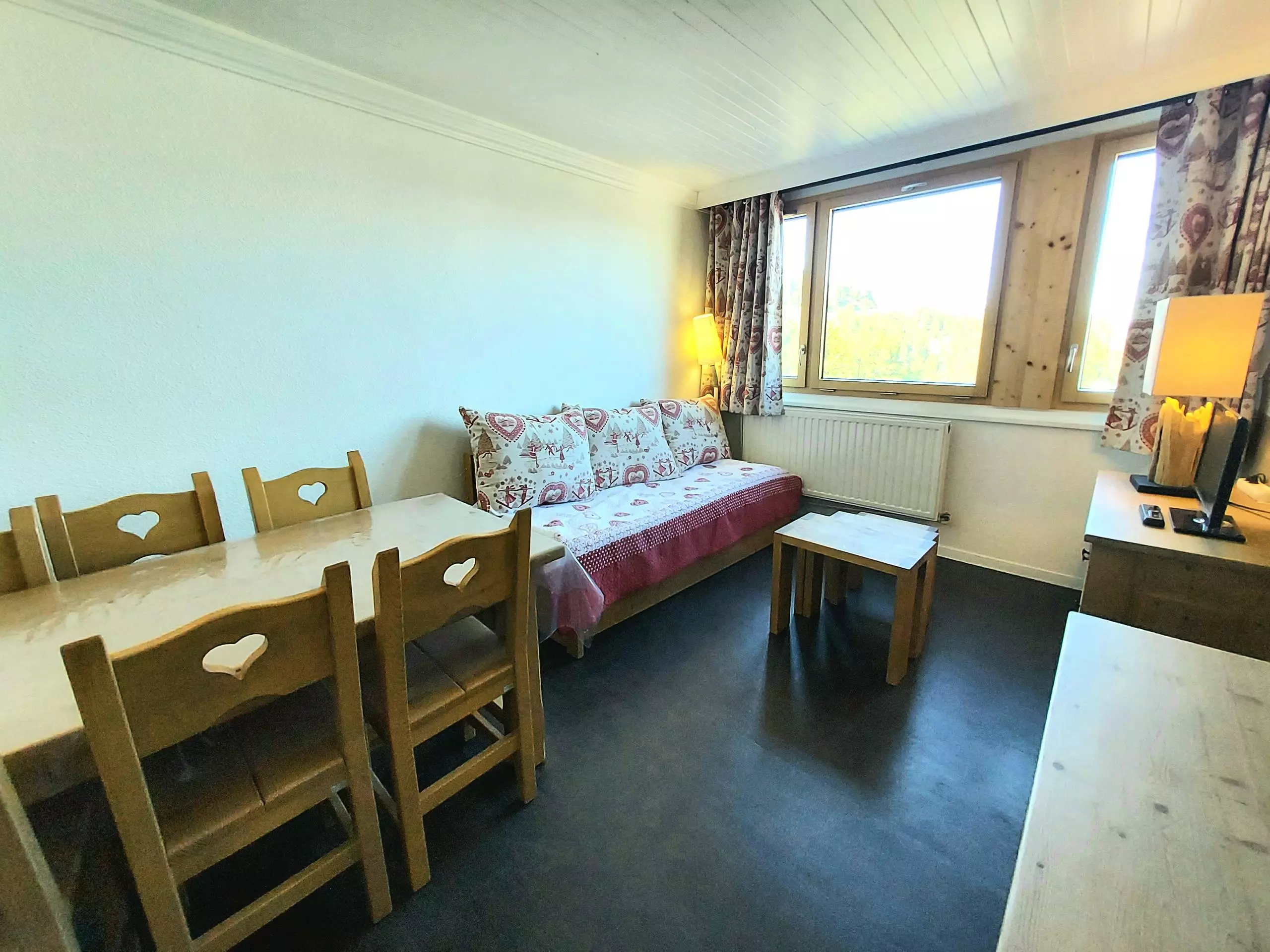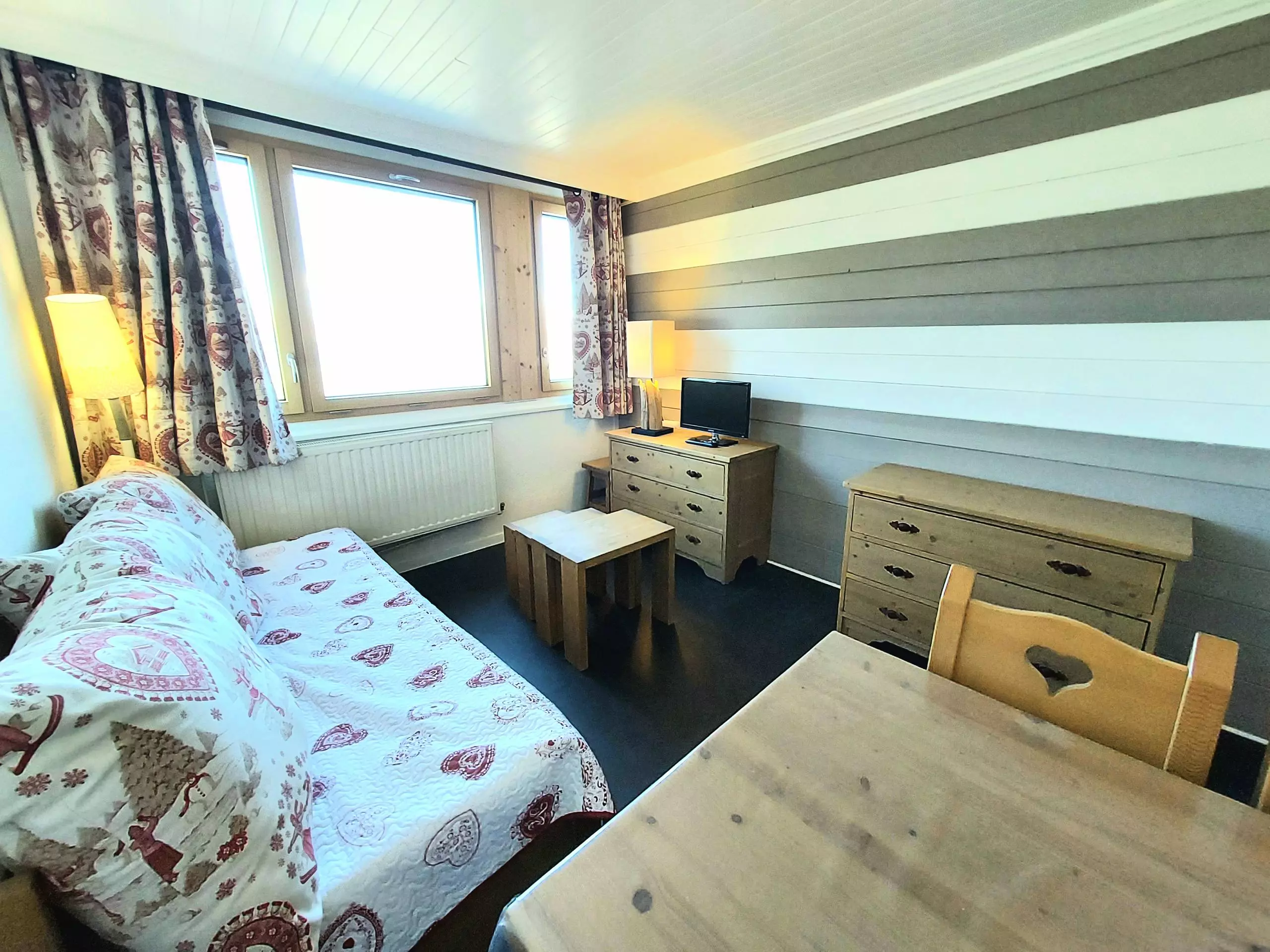 - Séjour avec téléviseur, un lit simple, un lit gigogne et coin repas.
