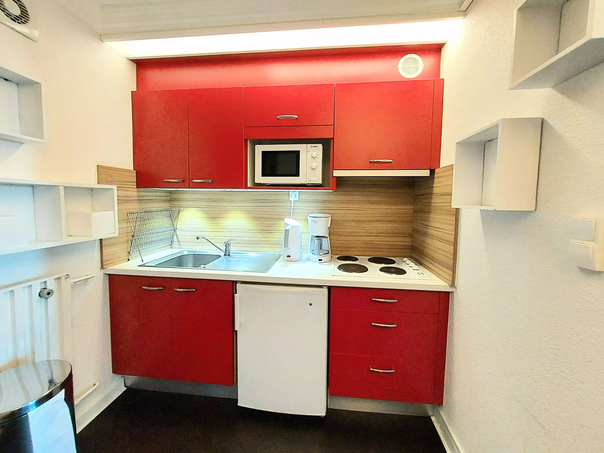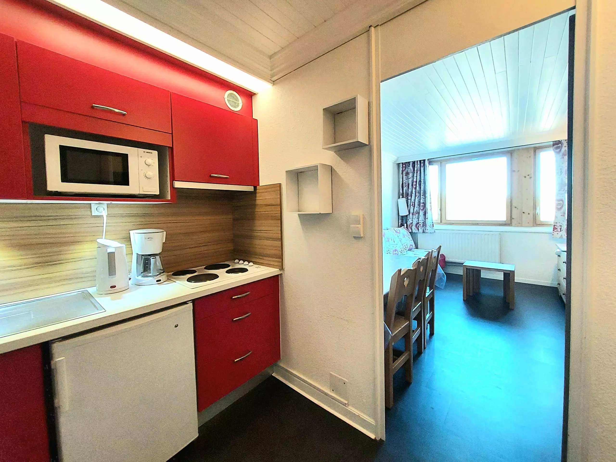 - Cuisine séparée avec réfrigérateur, grand placard de rangement, plaques électriques, micro-ondes, Airfryer.