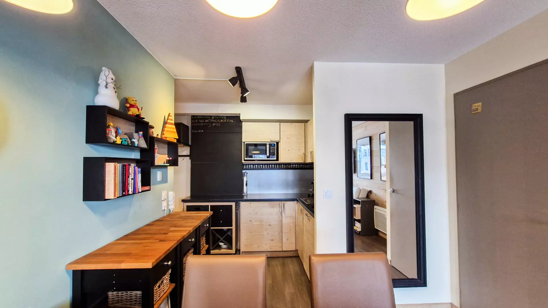 - Cuisine ouverte avec plaques vitrocéramiques, lave-vaisselle, micro-onde grill