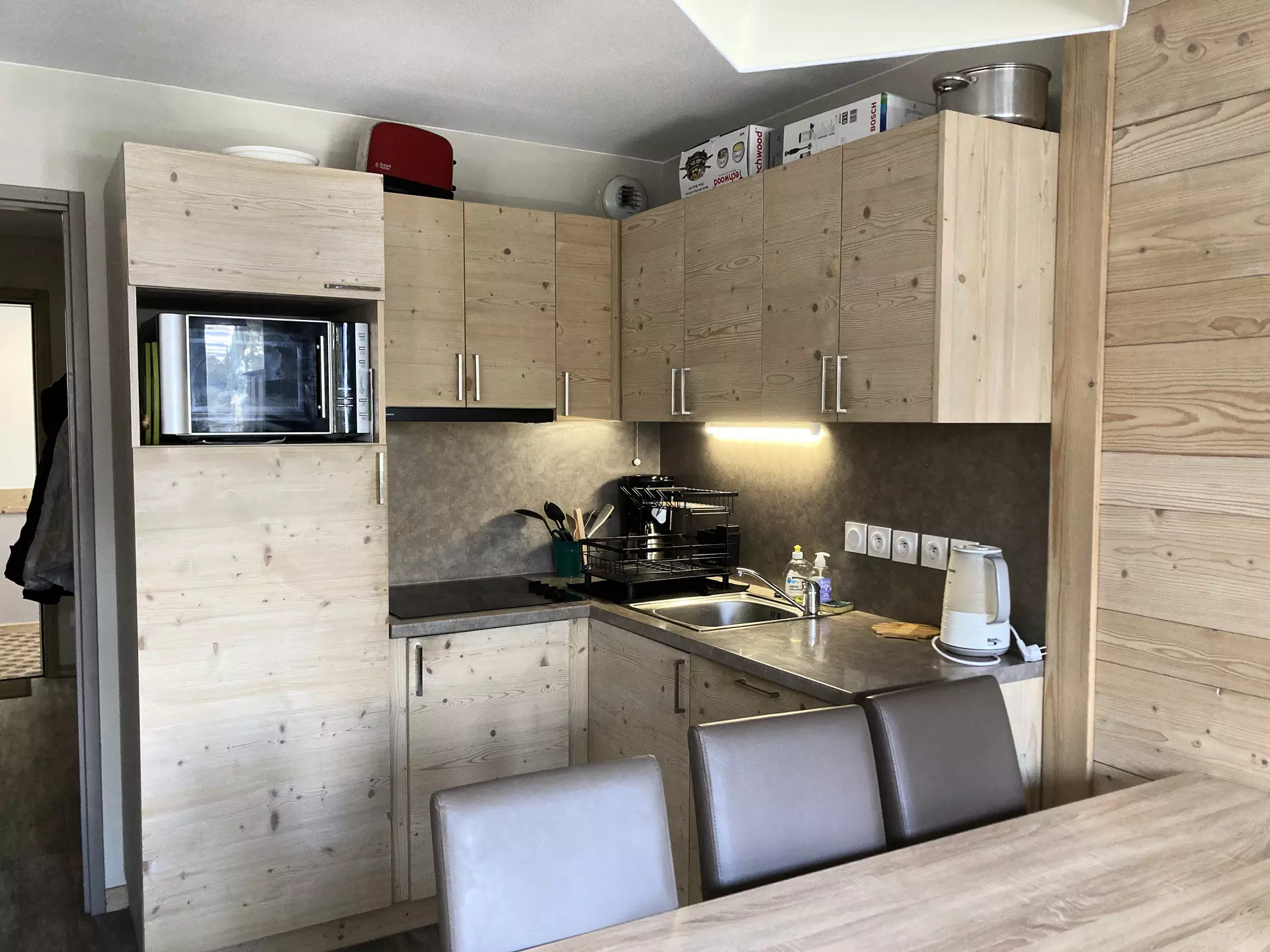 - Cuisine ouverte avec plaques vitrocéramiques, lave-vaisselle et micro-onde grill