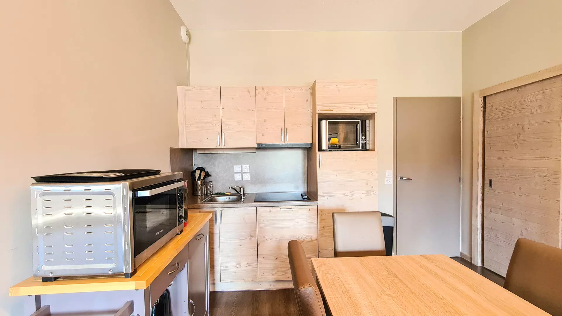 - Cuisine ouverte avec plaques vitrocéramiques, lave-vaisselle, four et micro-onde