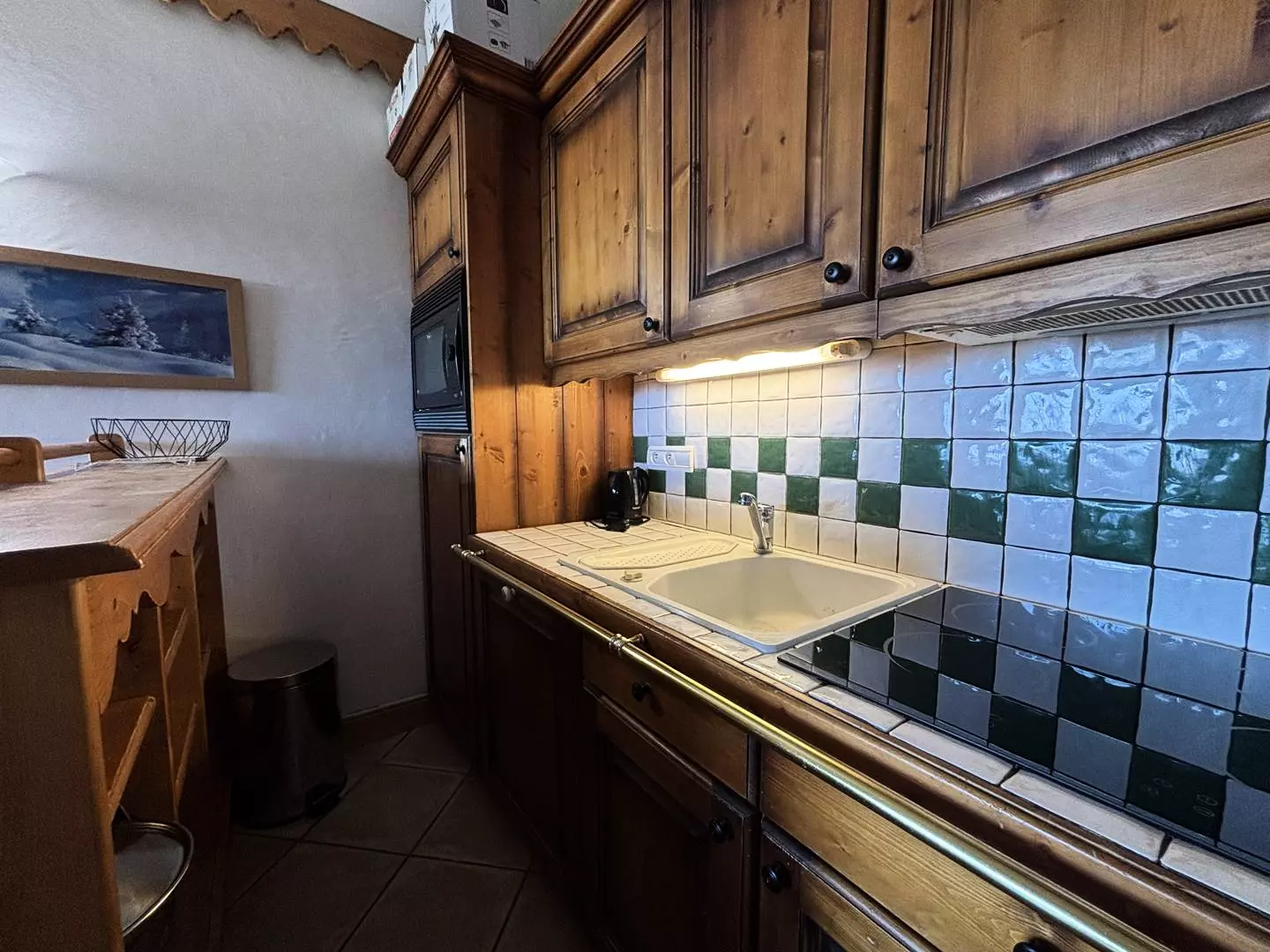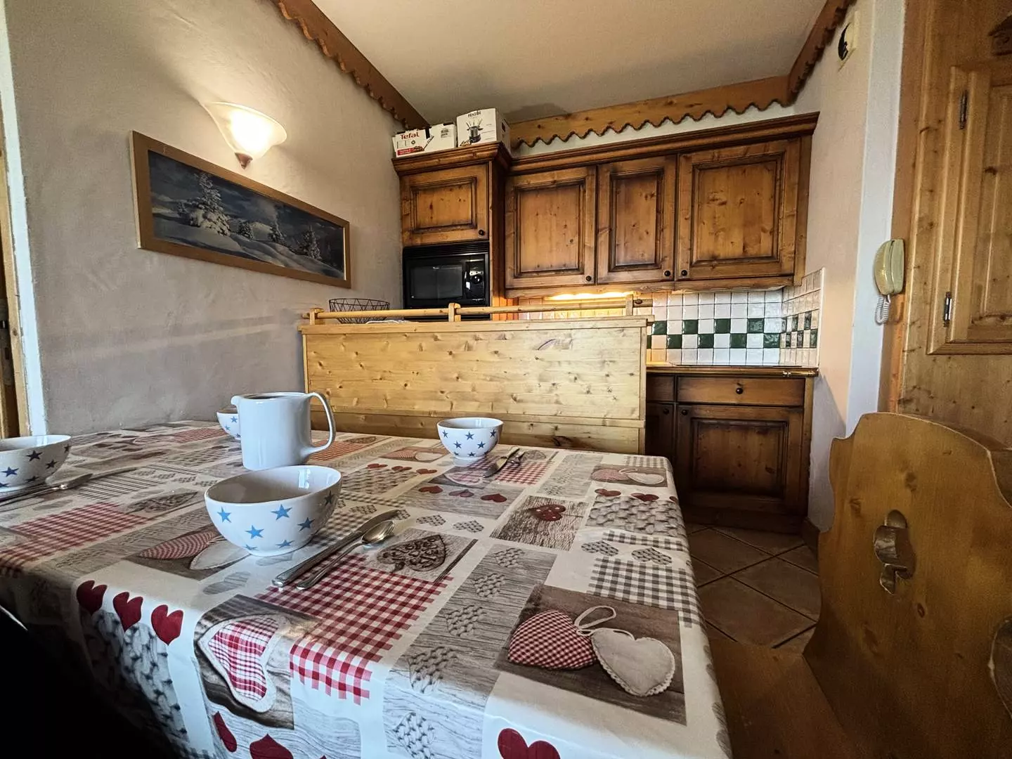 - La cuisine, ouverte sur le séjour, est entièrement équipée avec un lave-vaisselle, un réfrigérateur, une cafetière (Nespresso et filtre), des plaques à induction, un four combiné micro-ondes, un appareil à raclette et un appareil à fondue.