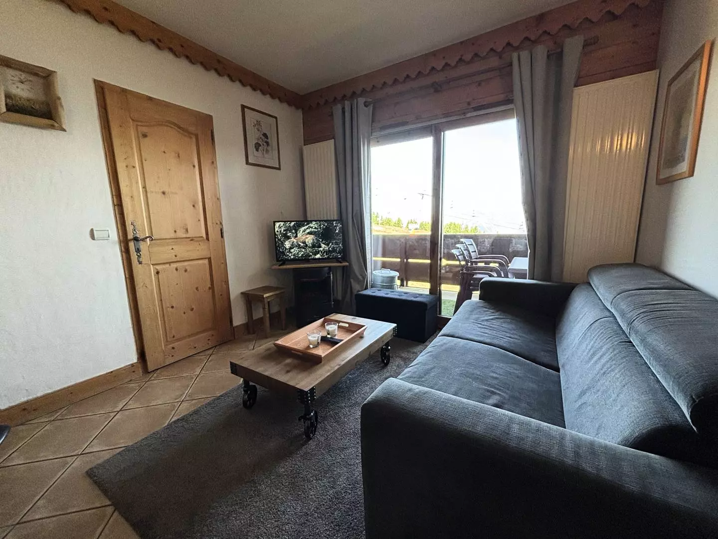 - Le séjour, lumineux, est équipé d'un canapé convertible en lit 2 places d'un téléviseur et d'une cheminée électrique. Il ouvre sur long balcon vous offrant une vue magnifique sur les montagnes.