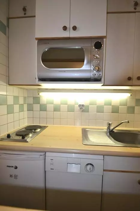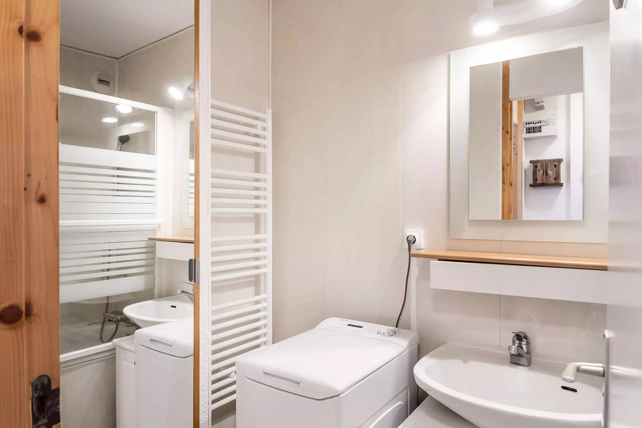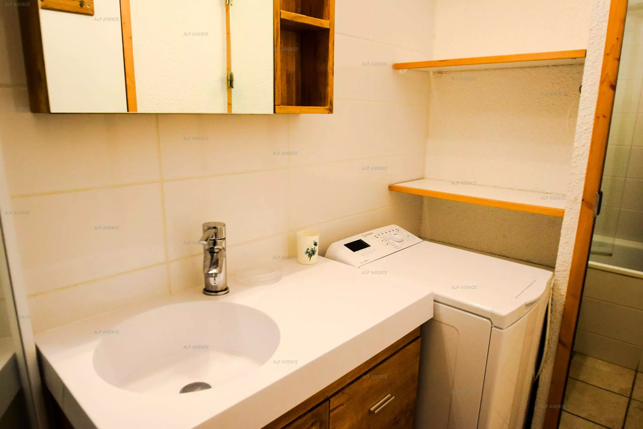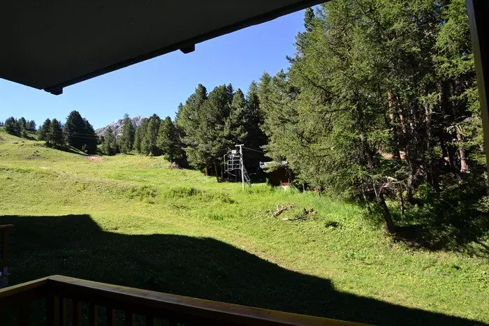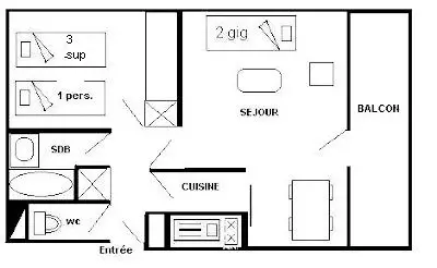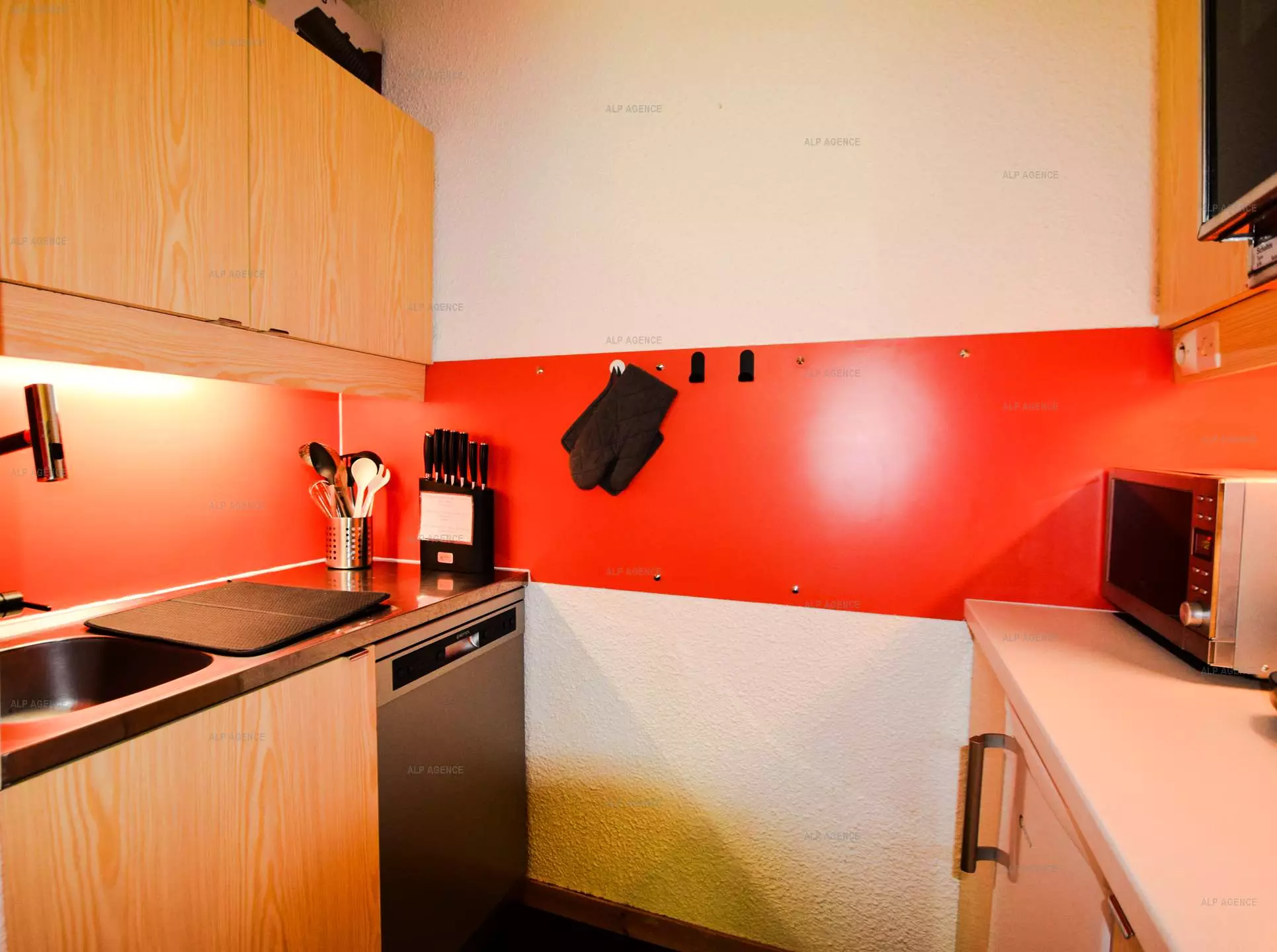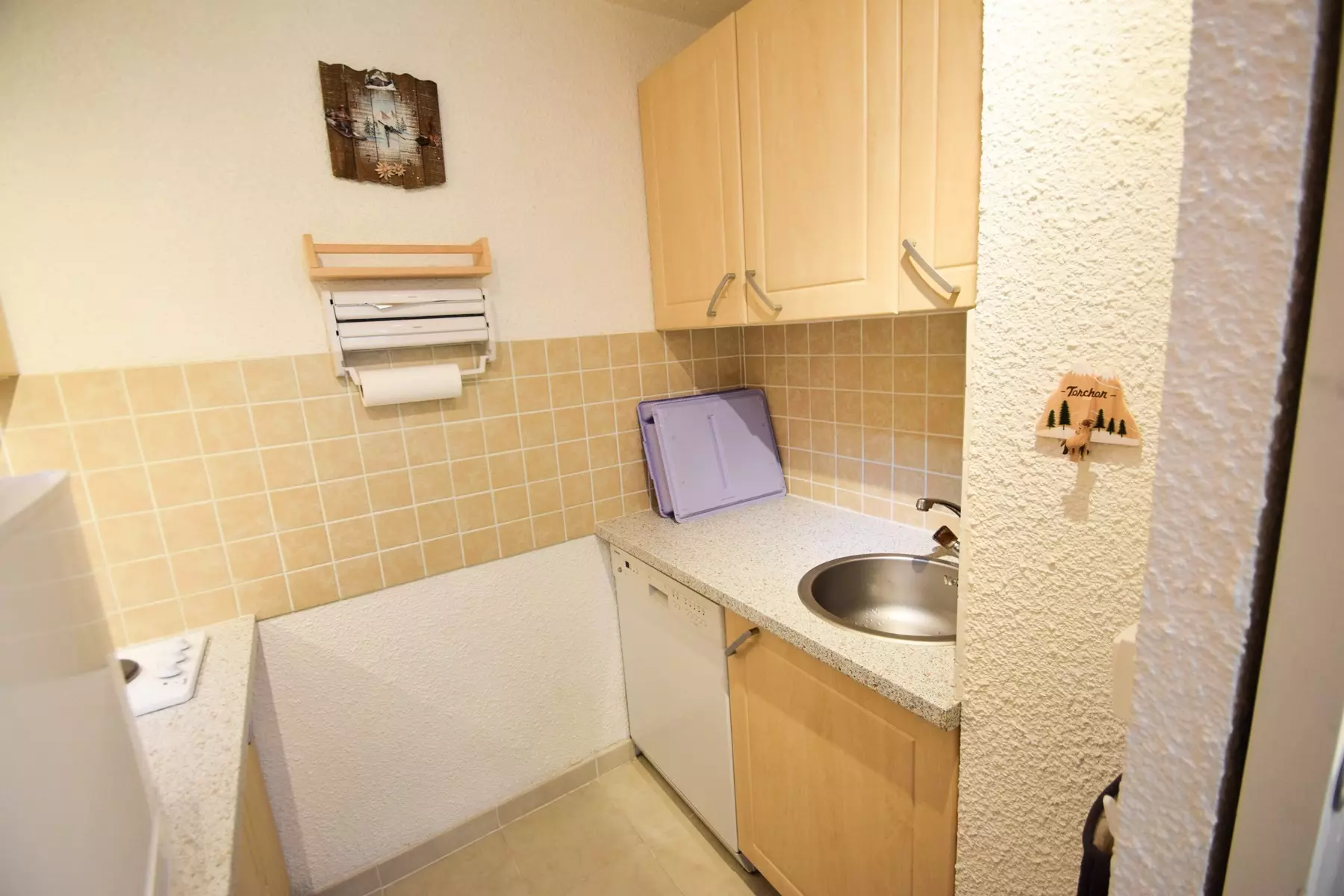 Appartement divisible 5 pers, 28m2, exposé Sud/Ouest, 2 balcons vue sur la forêt. 1er étage de la résidence accès par escaliers - Cuisine : séparée, 2 plaques vitrocéramiques, réfrigérateur, four, lave-vaisselle, four micro-ondes, cafetière Tassimo. Séjour : coin repas, 1 canapé-lit 2 pers - TV - Partie divisible : 1 lit 1p. et 1 lit gigogne (1+1) - SDB : baignoire, lave linge - WC séparés - Literie : 2 couettes simples et 2 doubles - Appartement non fumeur, animaux non admis