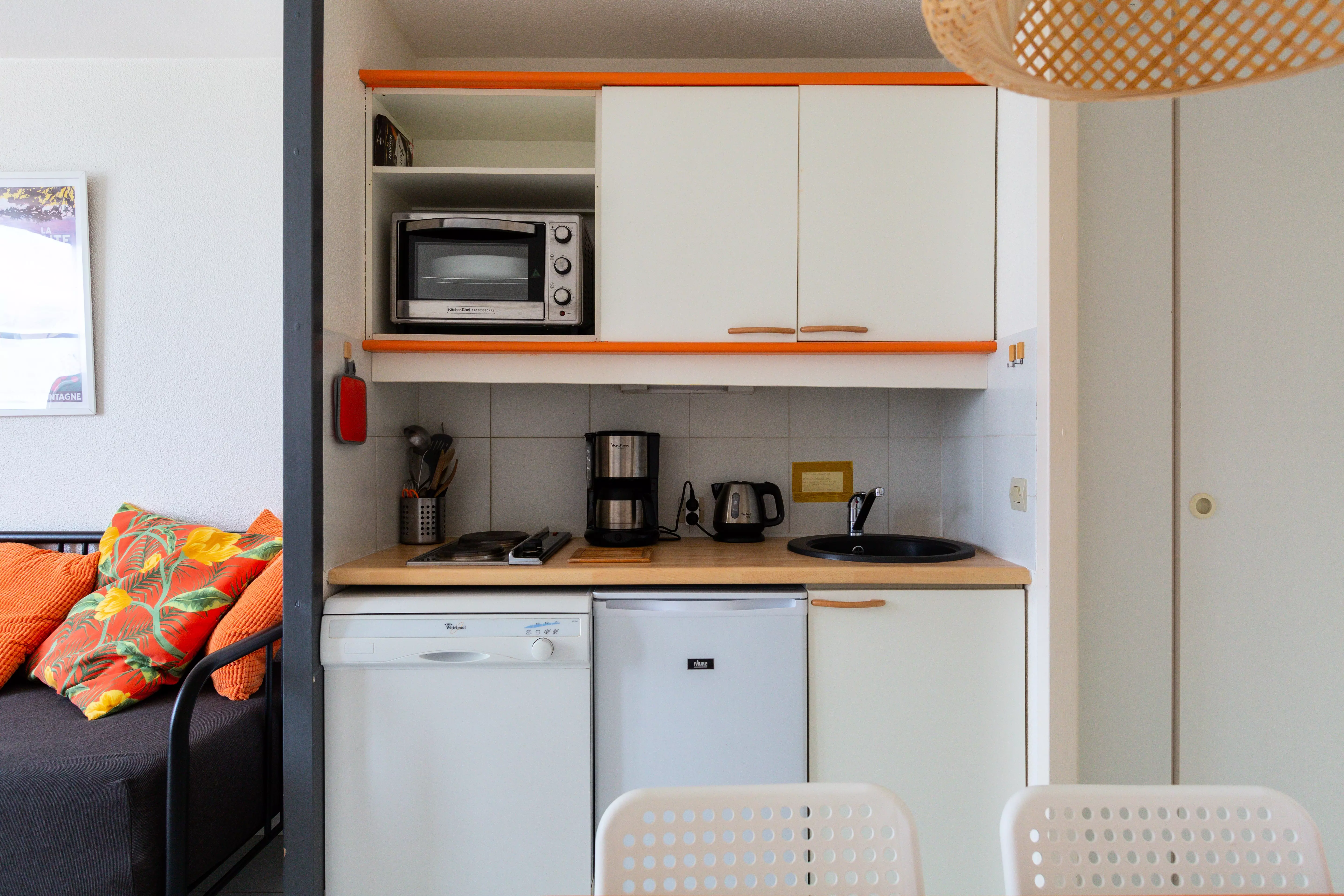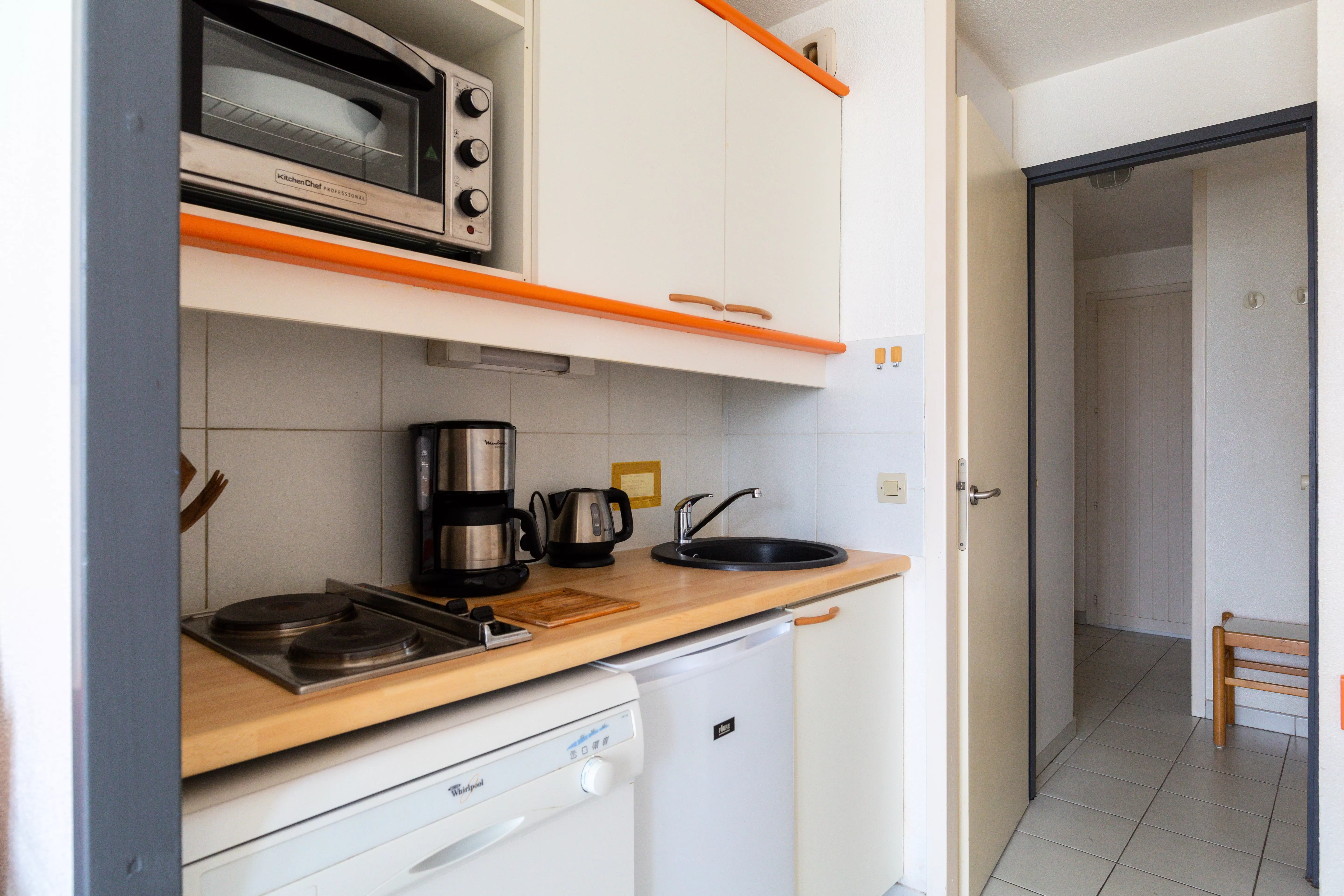- Cuisine entièrement équipée : réfrigérateur, plaque électrique, micro-ondes, lave-vaisselle, cafetière, grille-pain, vaisselle et couverts.