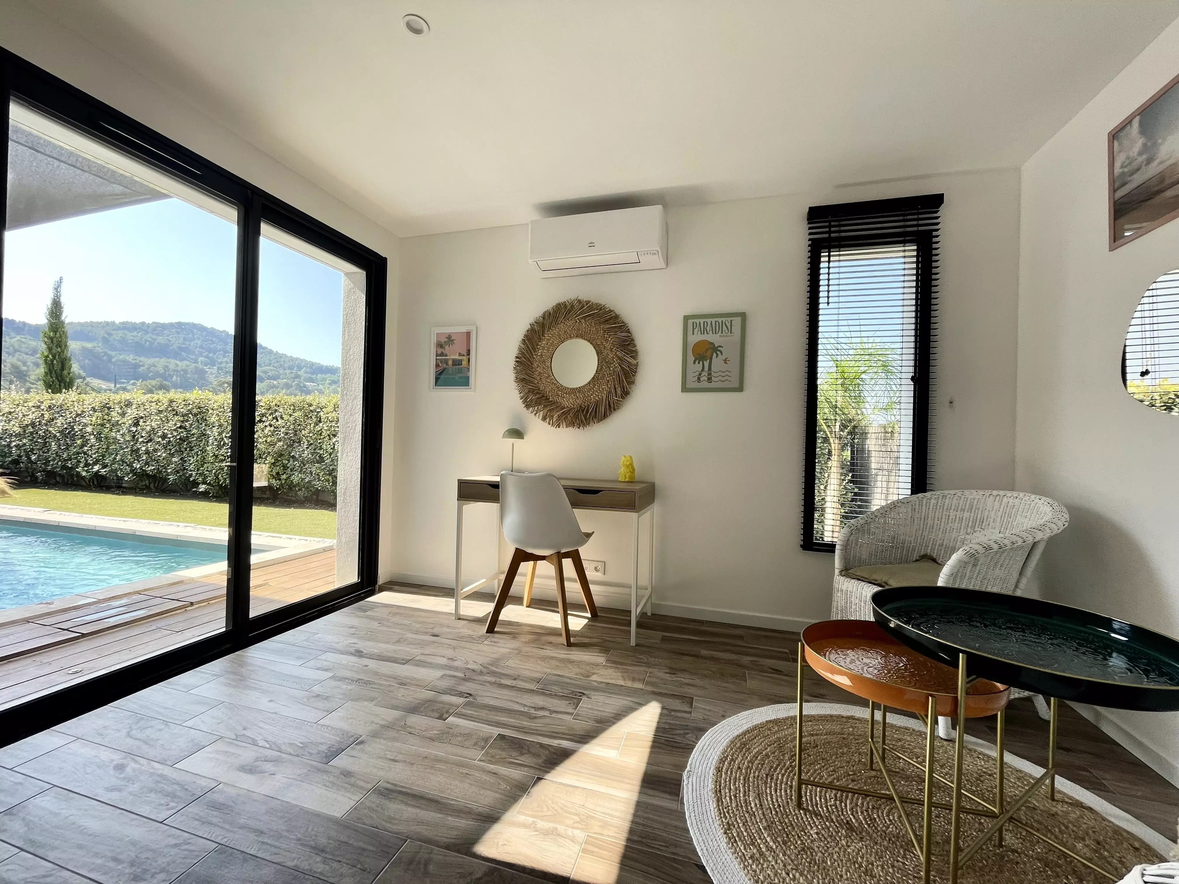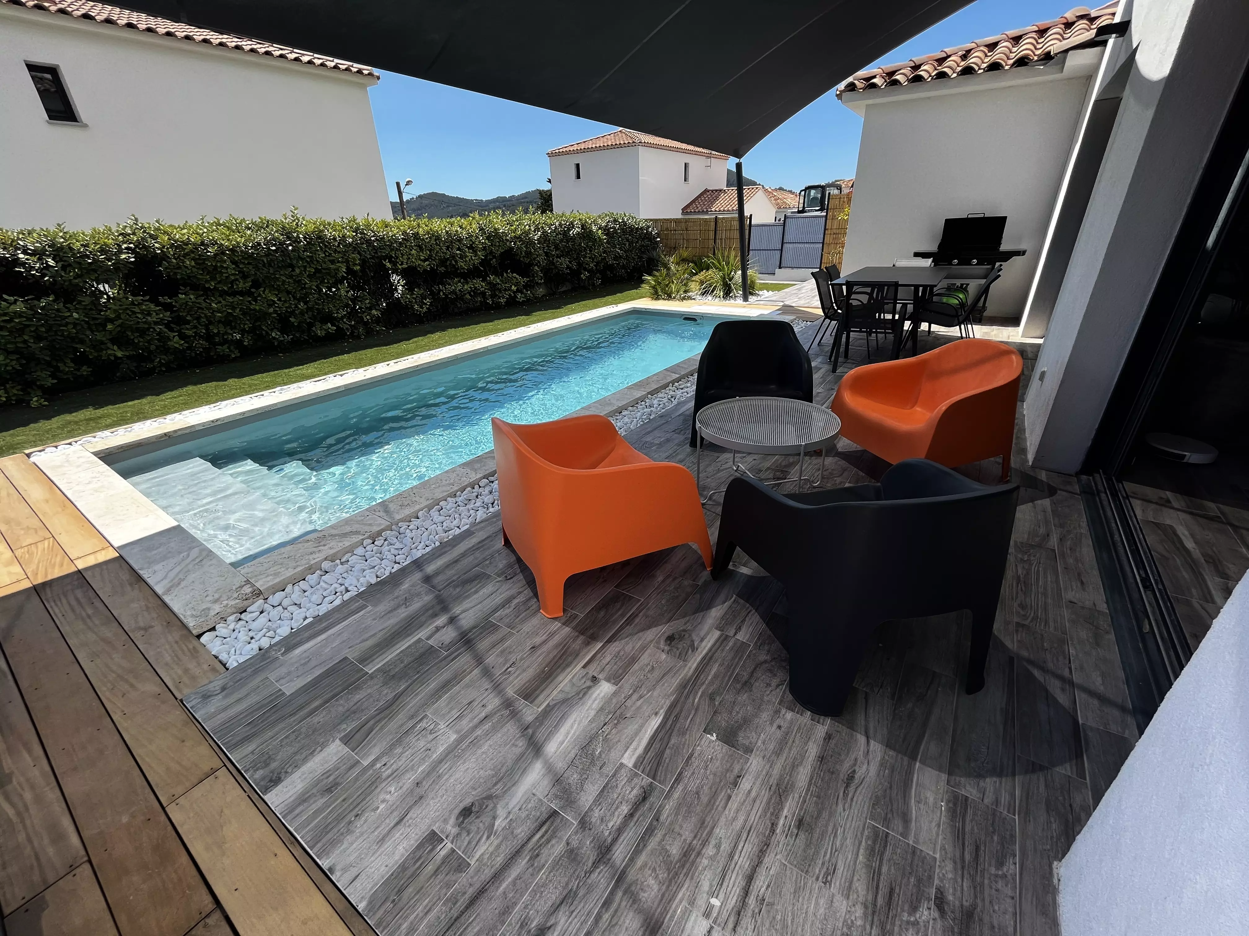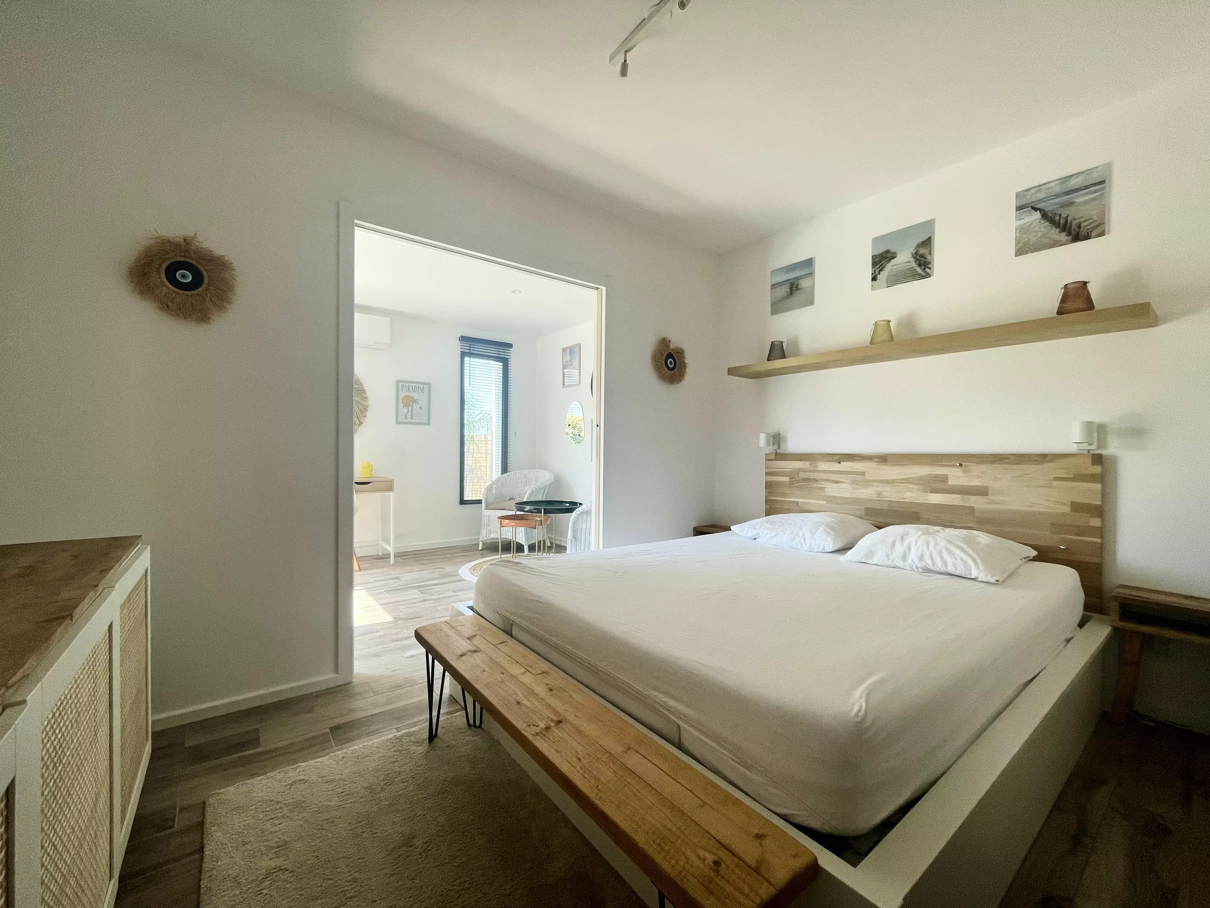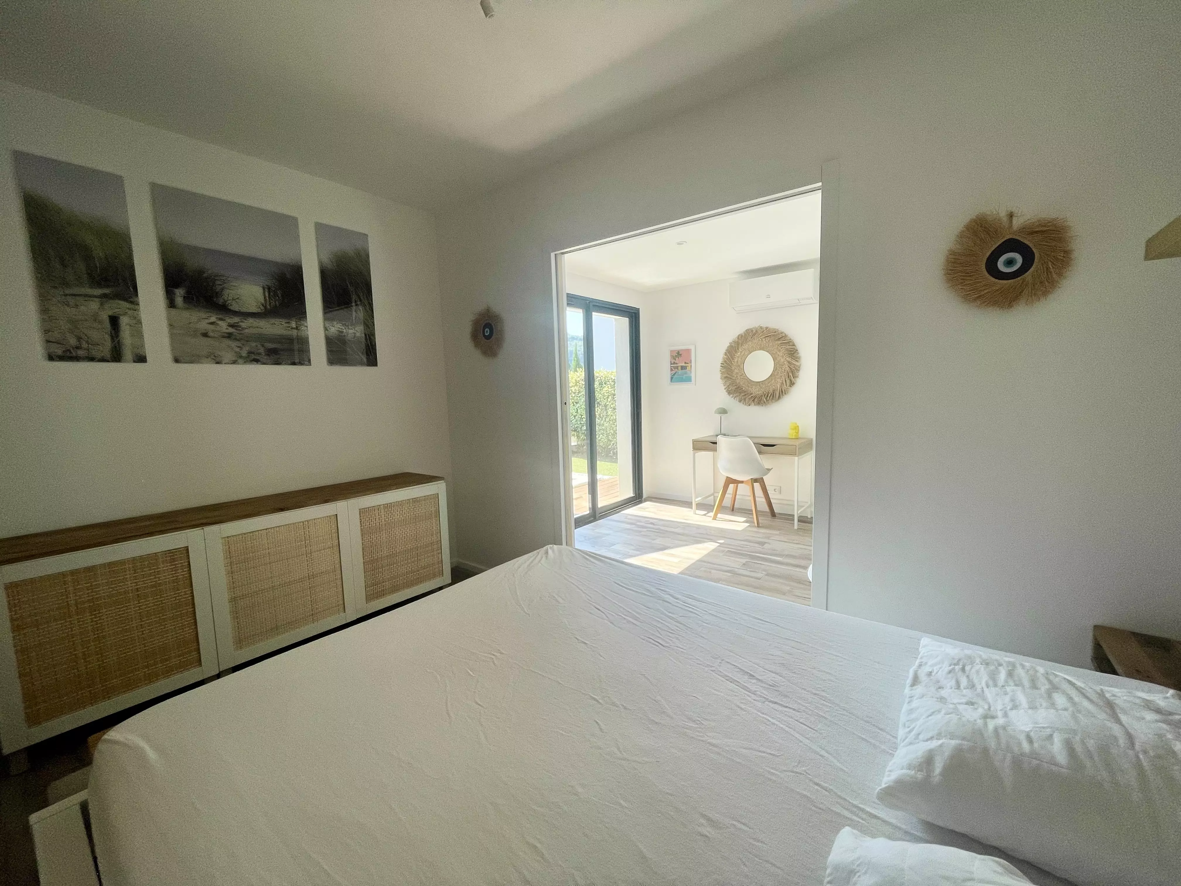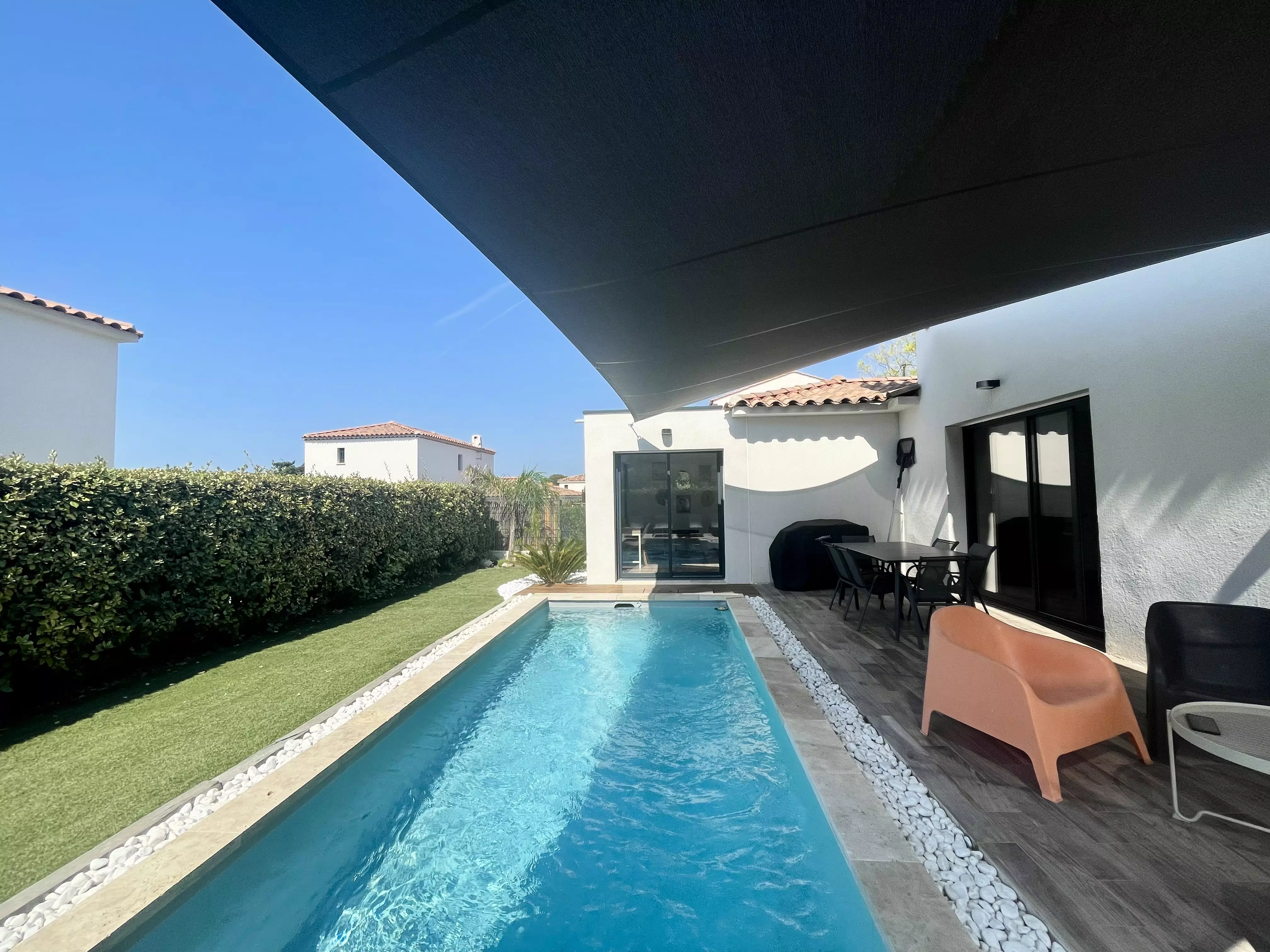 Les atouts de votre location : Cette villa lumineuse séduit par sa décoration chaleureuse et son grand confort. Orientée plein sud, elle bénéficie d'un vaste jardin sans vis-à-vis avec terrasse, mobilier extérieur, chaises longues, barbecue, piscine et terrain de pétanque, idéal pour profiter pleinement des moments en extérieur. À l'intérieur, le séjour climatisé s'ouvre sur une cuisine américaine bien équipée, parfaite pour préparer les repas en toute convivialité. Les trois chambres et les deux salles d'eau offrent un espace pratique, tandis que le parking privé, l'accès internet haut débit et de nombreux rangements facilitent le séjour. Une villa accueillante, pensée pour des vacances confortables et agréables.