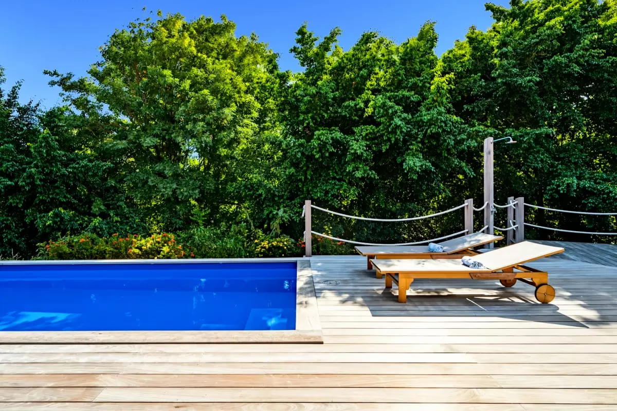 Sur la terrasse en bois exotique se trouvent le coin repas avec une grande table ainsi qu’un salon de jardin au bord de la piscine. Avec sa vue mer, elle est ensoleillée toute la journée pour une température idéale.