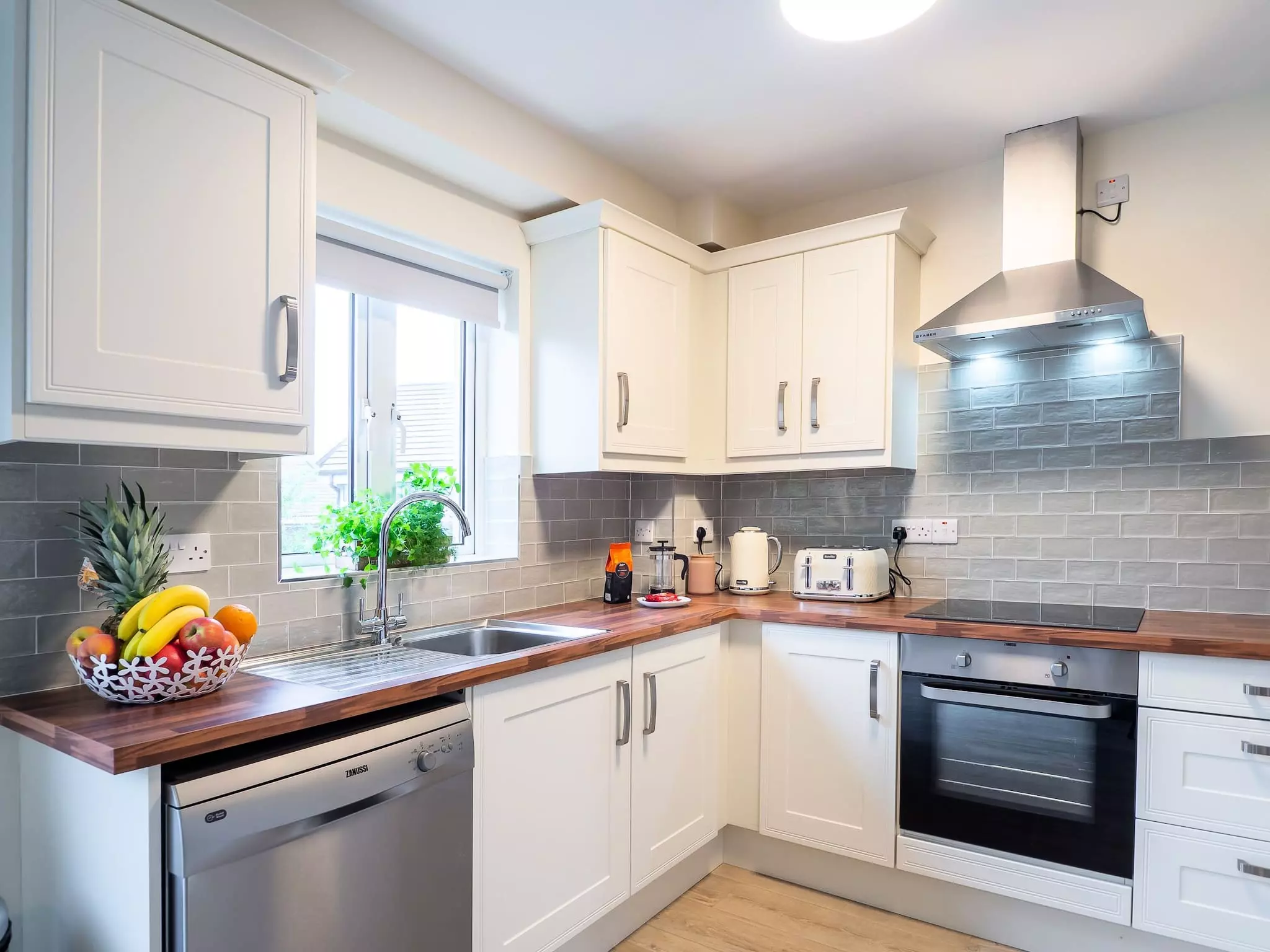 La cuisine américaine, Électrique, est équipée avec réfrigérateur, micro-ondes, four, congélateur, lave-vaisselle, vaisselle/couverts, ustensiles/cuisine, cafetière, grille pain et bouilloire.