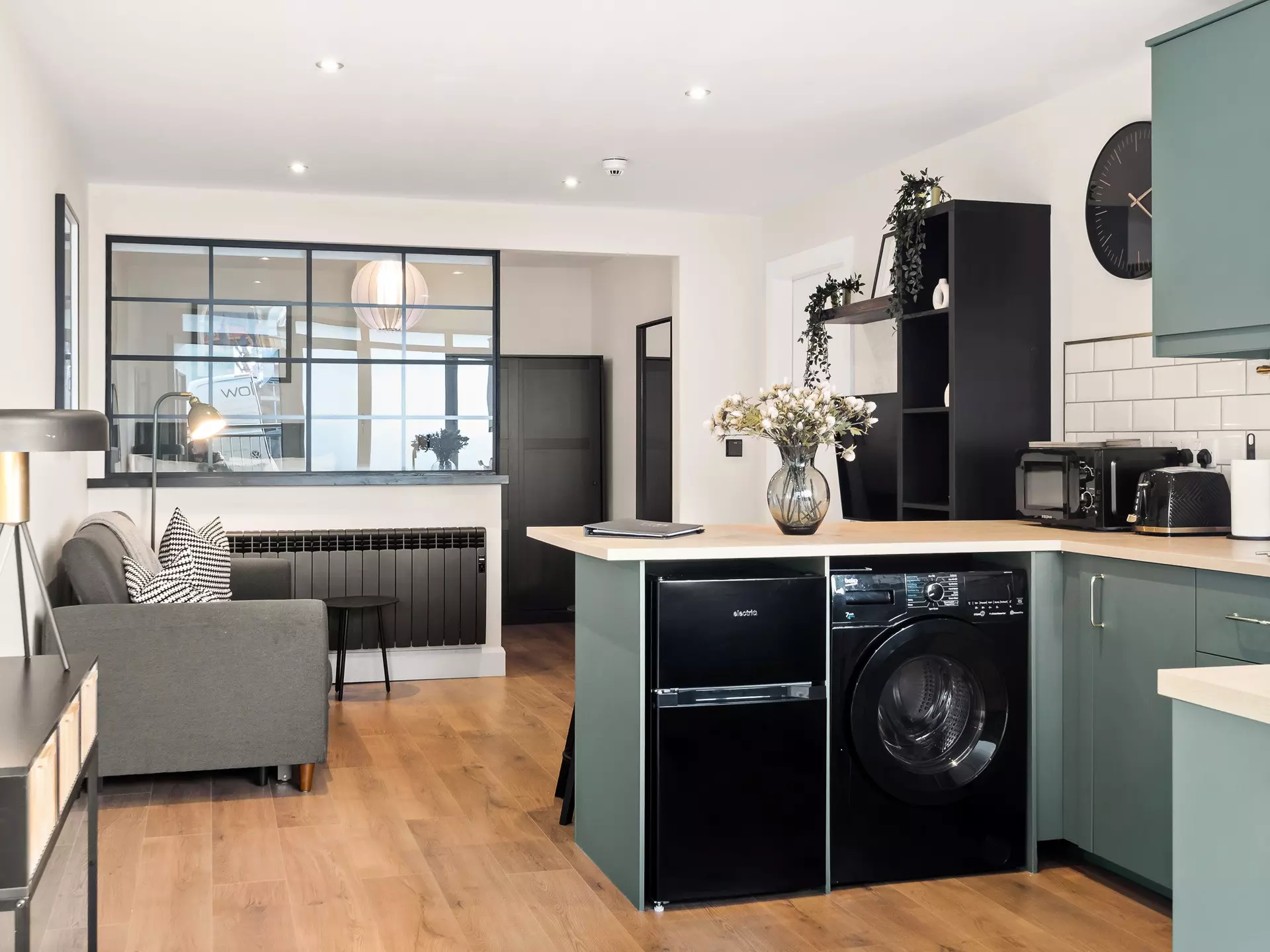 Elle dispose de lave-linge, sèche-linge, fer à repasser, accès internet (wifi), chauffage électrique, 1 Télévision.