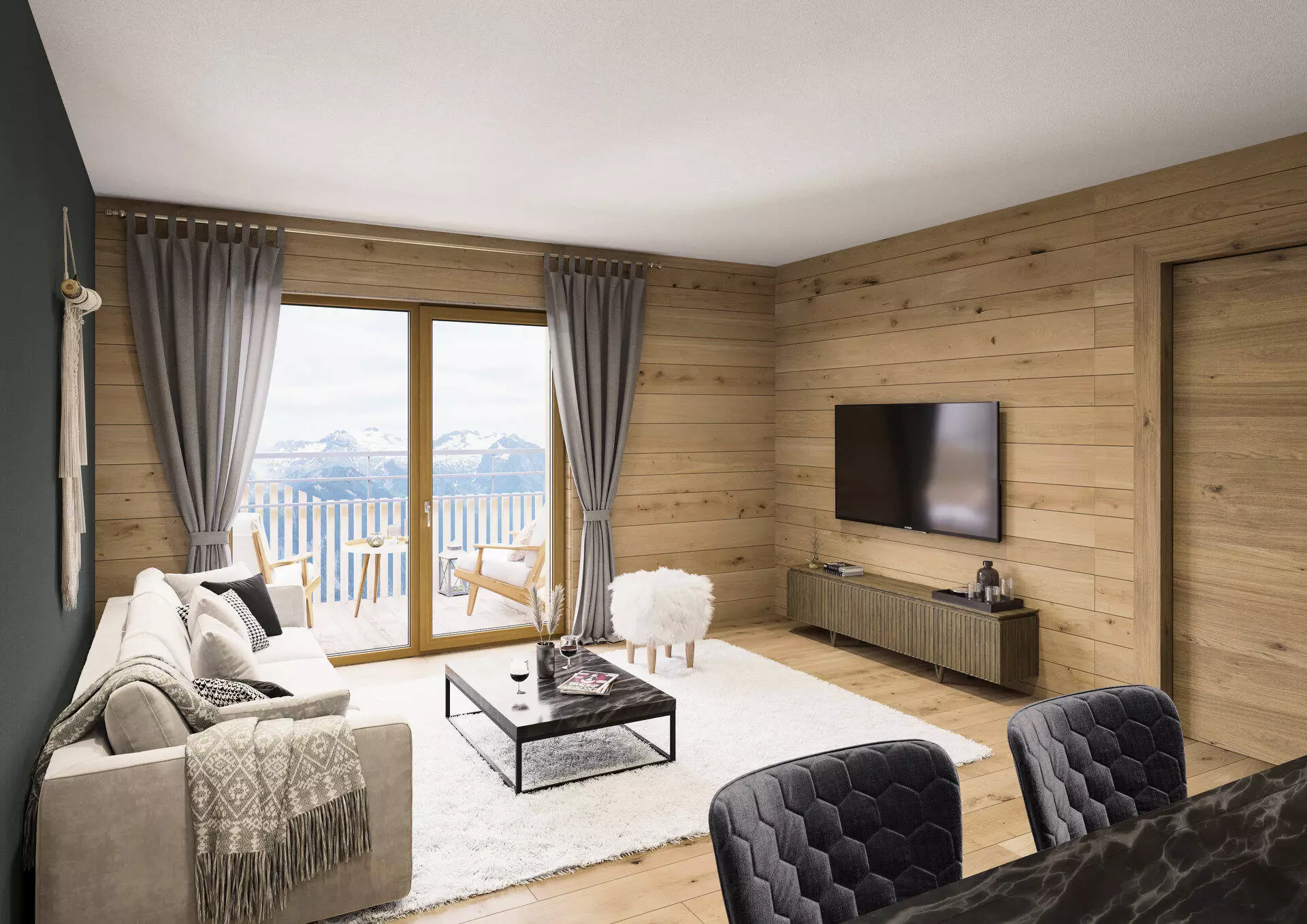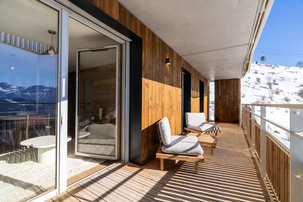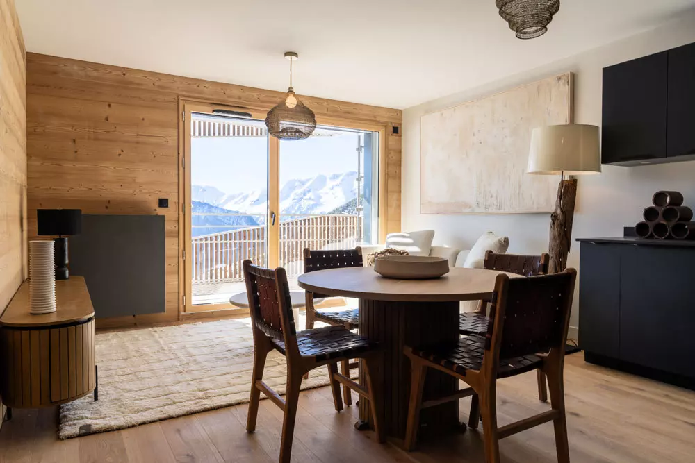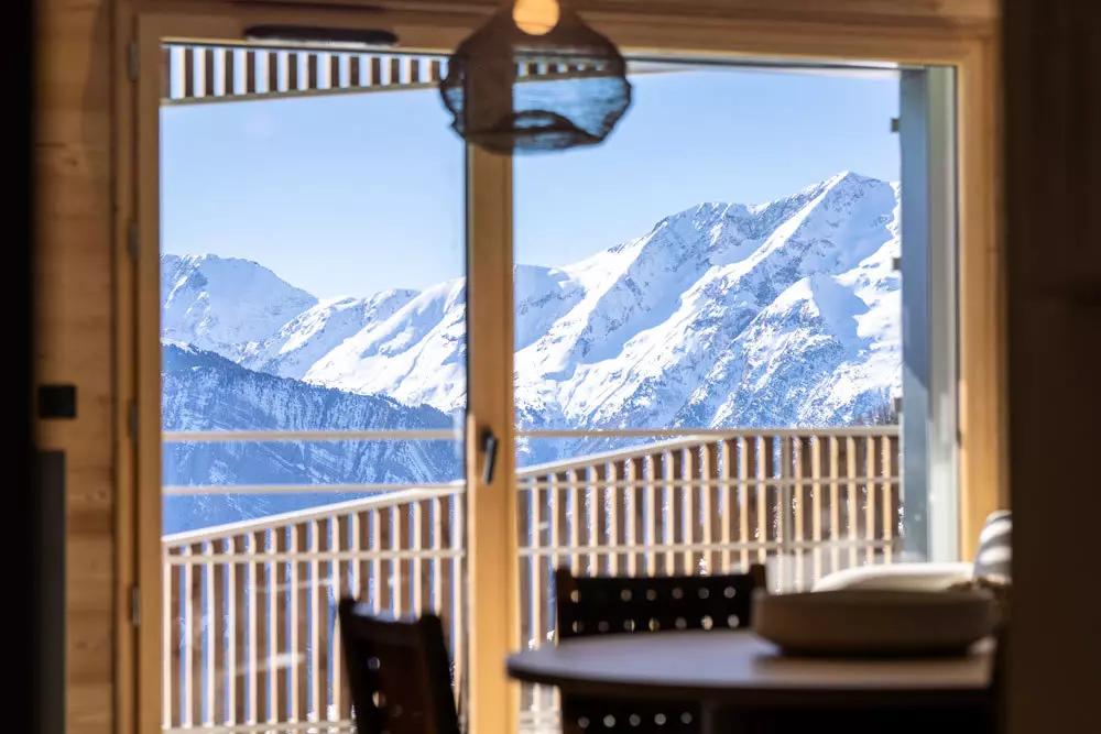 - Séjour donnant sur une terrasse aménagée exposée Sud avec une vue exceptionnelle sur les montagnes de l'Oisans