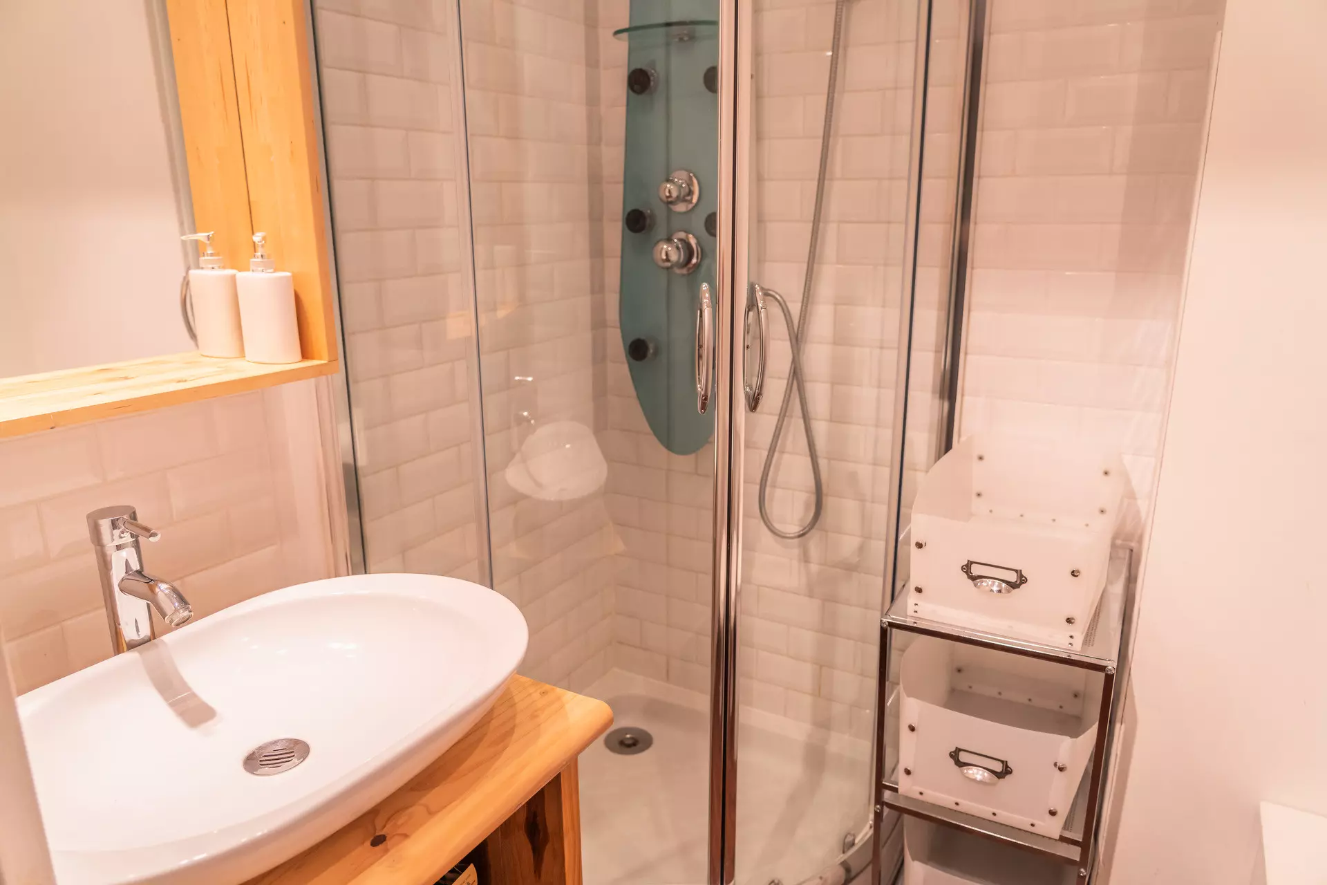La cuisine est équipée d'un réfrigérateur, micro-ondes, cafetière Dolce Gusto, plaque de cuisson et tous les ustensiles de cuisine nécessaire. Vous disposerez aussi d'une appareil à raclette pour partager un moment convivial entre famille ou entre amis. La salle d'eau avec douche et WC vient compléter l'ensemble.